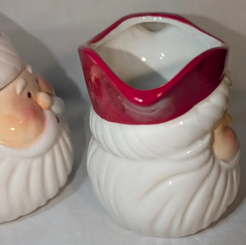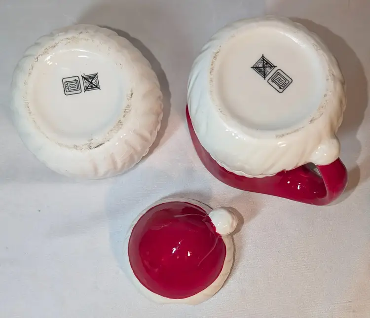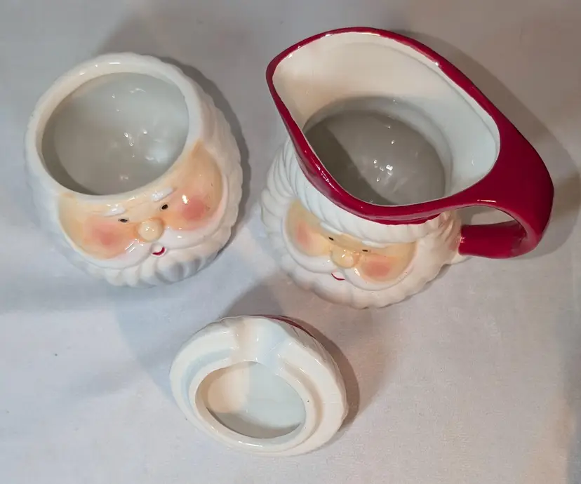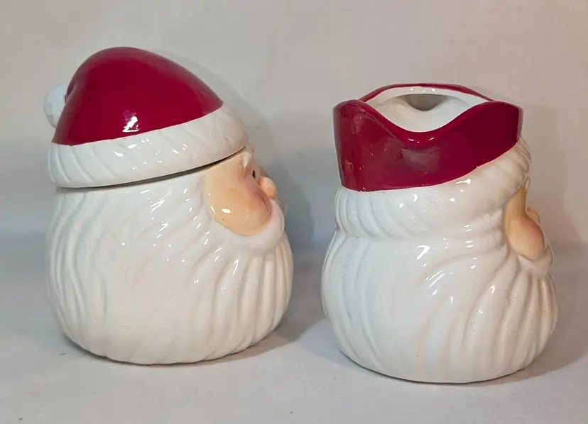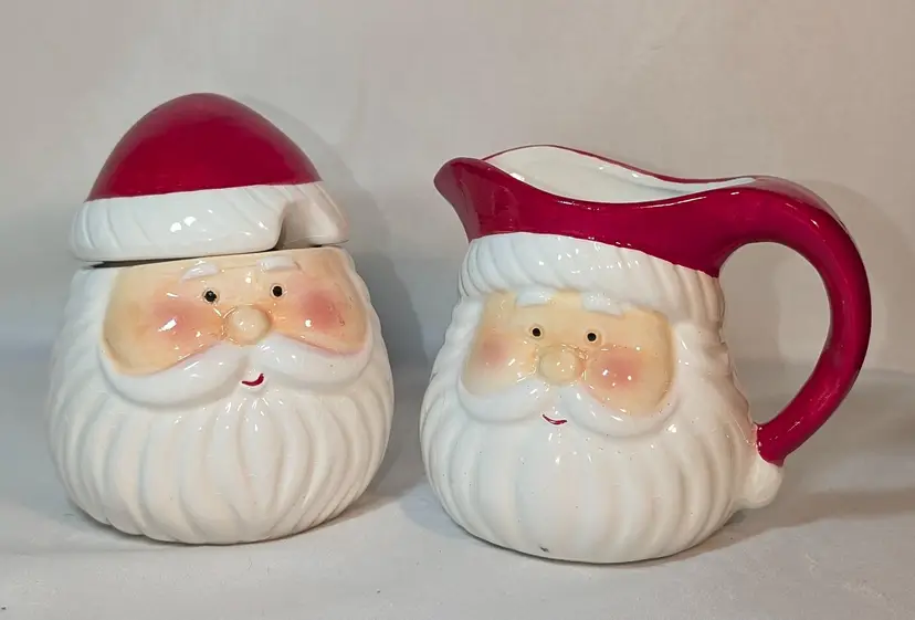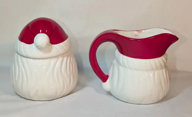 Excellent Used Condition. No chips or cracks. Colours are vibrant and bright. Natural crazing, creamer has small black smudge on bottom of beard. Covered sugar is 4.5" high x 4" wide diameter. Creamer is 4" high x 5" long including handle x 4" wide.
