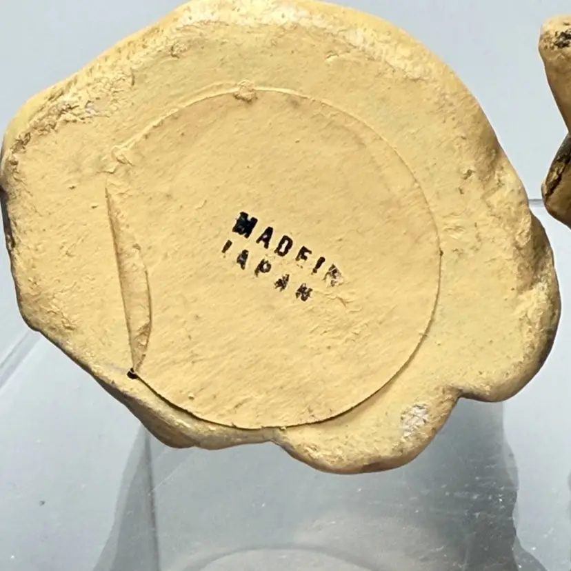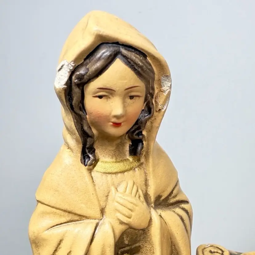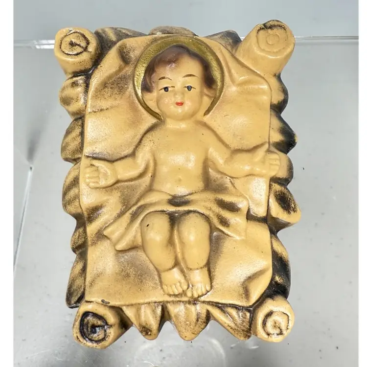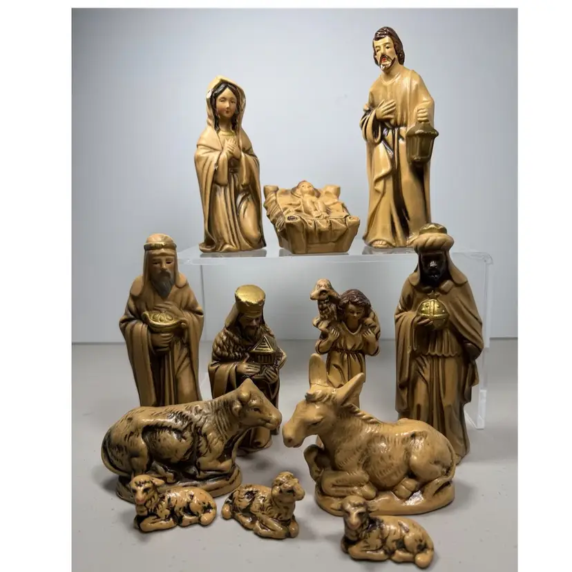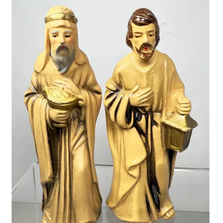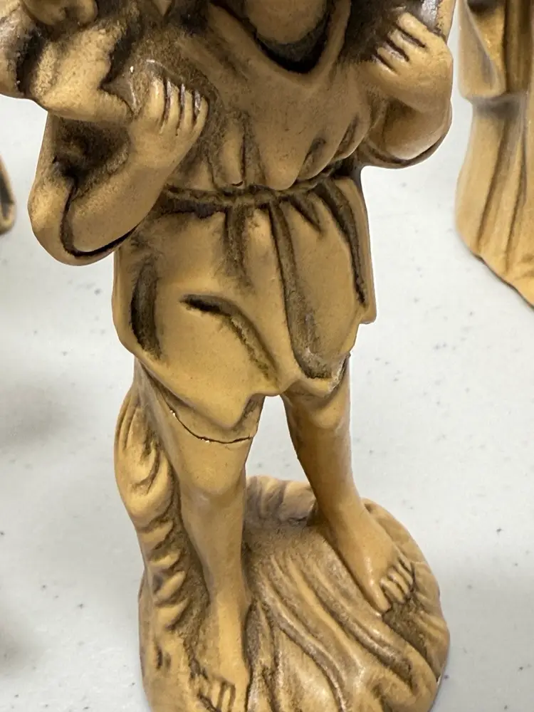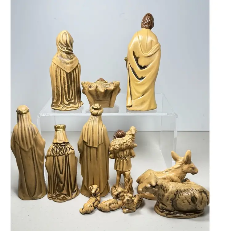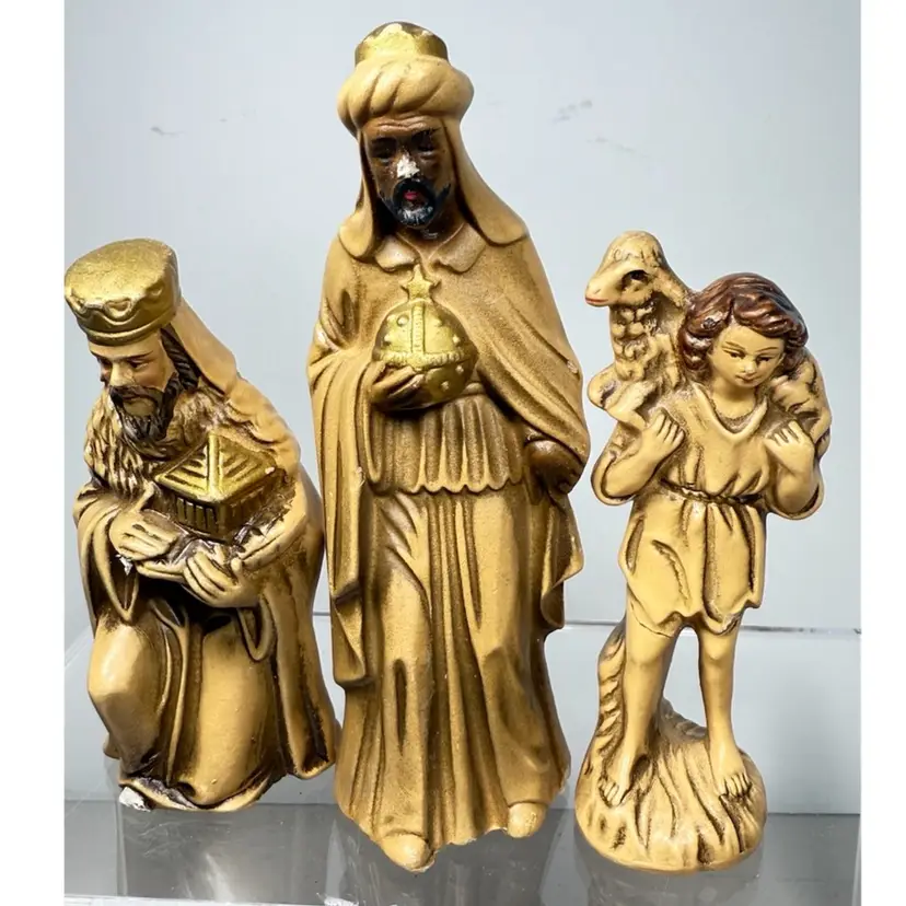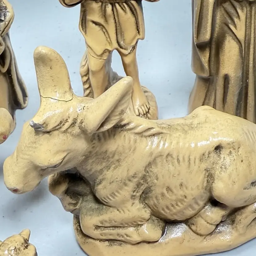 Beautiful survivor! Vintage Nativity set, chalkware made in Japan. I'm going to assume this set is from the 60's or 70's, similar to a set we had when I was a child, yes of the 60's. There are 12 pieces in the set. Size differs but the standing Wise Men and Joseph are approximately 5.5 inches tall, you can use that as a gage for the rest. I must point out some damage Mary has some chipping around her face/veil. Most pieces have some small chips or missing paint - they are hand painted and beautiful. All pieces are a kind of tan, yellow color and the faces and accents are painted, look at Mary's face, delicate and beautiful. The little shepherd boy was broken in half right below his garment and has been repaired. The donkey's ear has been repaired and he has chipped paint on his mane, forehead. The dark wiseman needs paint on his nose which may or may not be gone but can be touched up. If you love the old feel, leave them as-is, the set is wonderful regardless. If your crafty, you can touch them up. Sold as shown, they will be carefully packaged (I am a documented over packager) for avoid further damage.