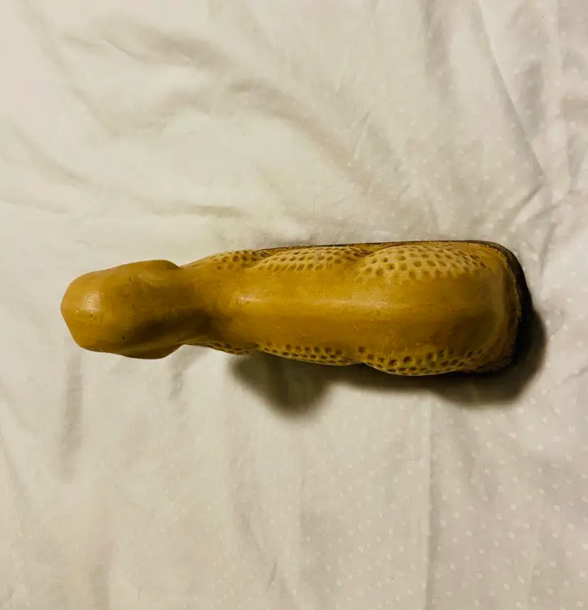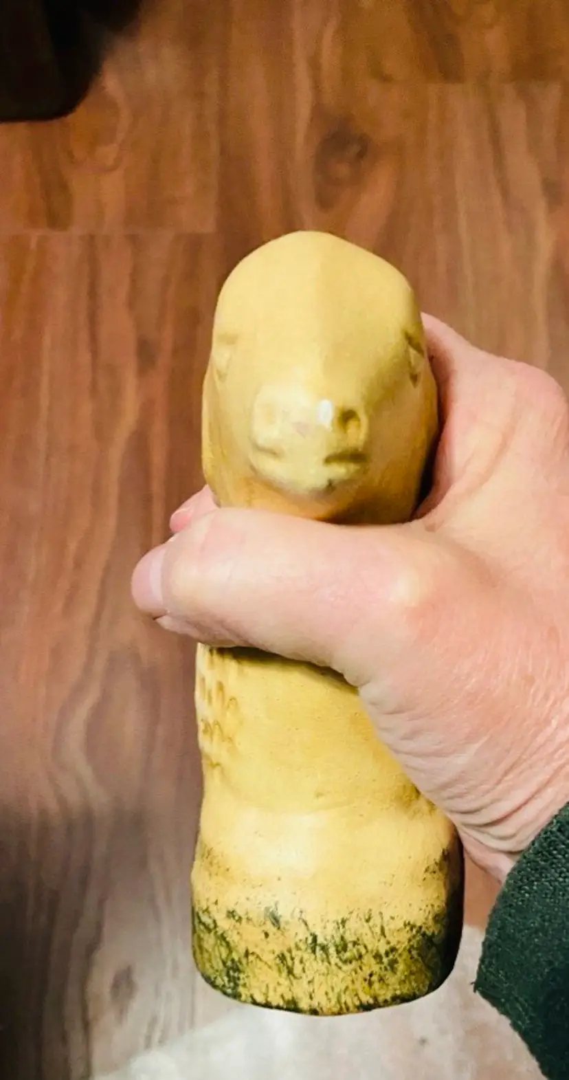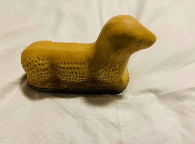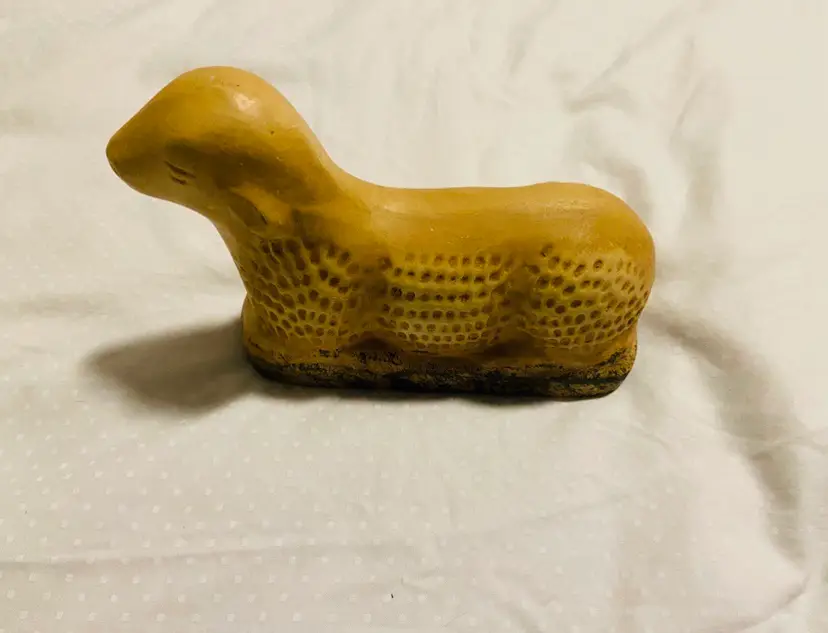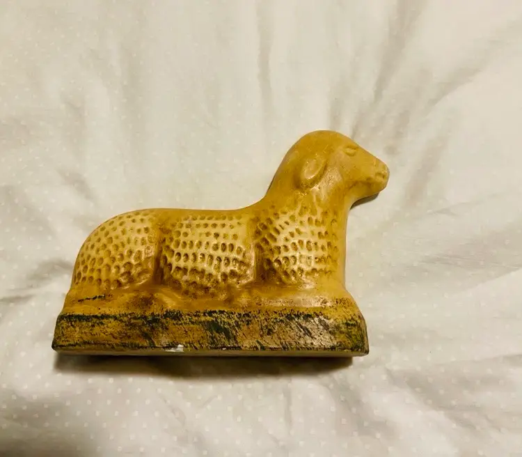Chalkware Sheep laying down on a green base. This was purchase from a home of a lady that sculpted for Enesco. It is signed and dated 1988. The perfect primitive addition to your decor. He does have a small flea bite on his nose. Otherwise in good used condition.