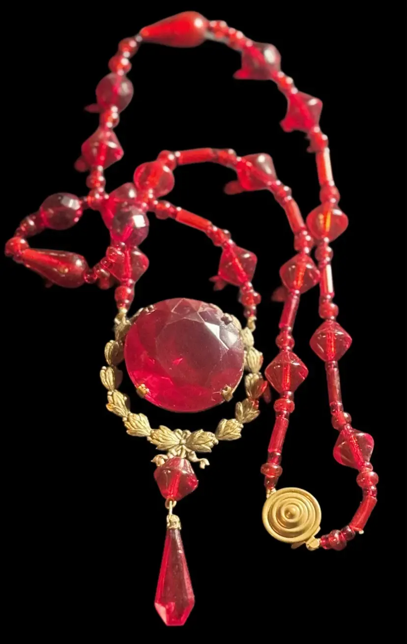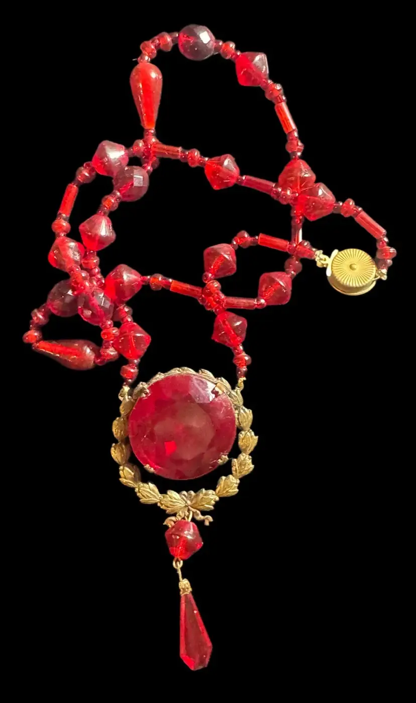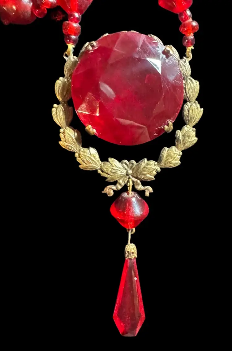 Talk about a statement piece! This 25 inch long beaded necklace gets an additional nearly 4 inches in length from a magnificant ruby red drop! The festive glass stone is about 1 and a half inches in diameter. Doesn’t sound like a lot, but this beauty is BIG! This outstanding feature stone is set in a detailed brass wreath and is finished with a matching drop that is around 1.5 inches long.