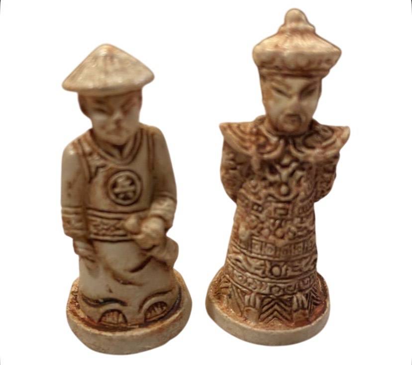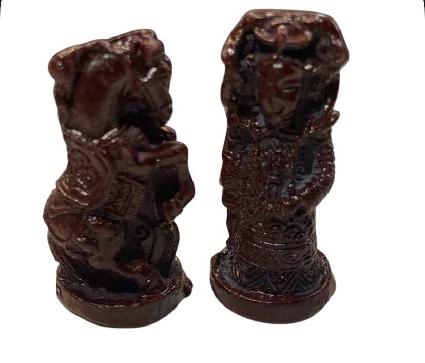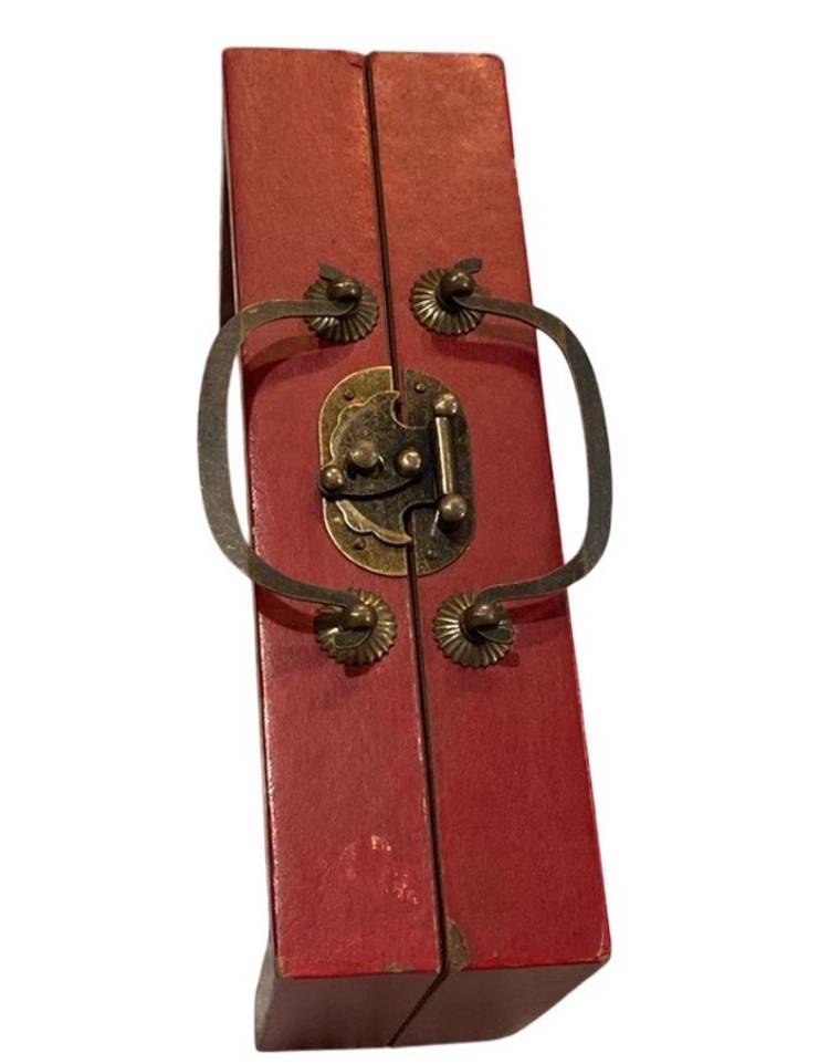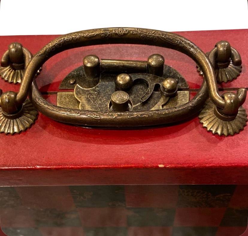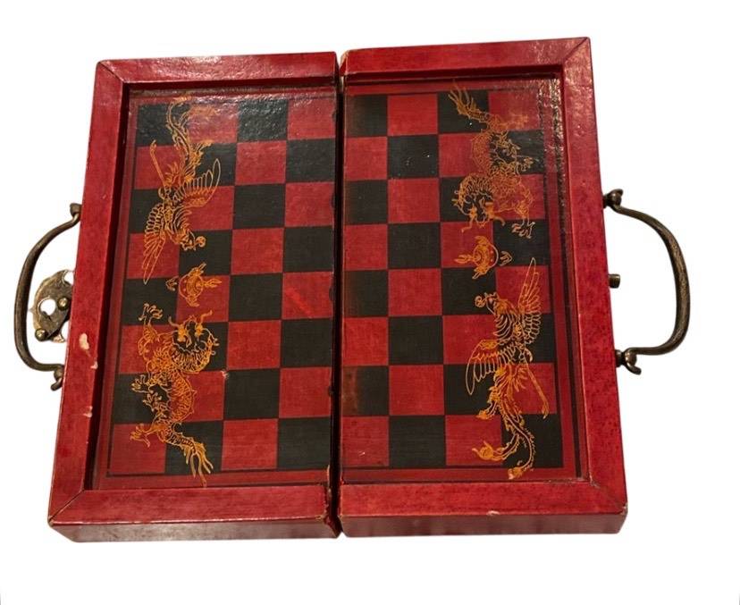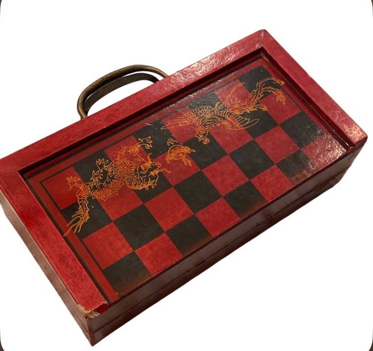 The chess box has wear as seen in pictures with some nicks, scratches, minor dents. When open it measures 8” x 8” and serves as game board! All chess pieces are intact beautifully designed and the shortest pieces are 1.25” tall. The case handle is very beautiful as well! Great collectors piece!