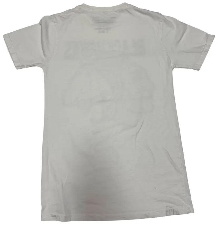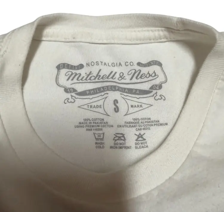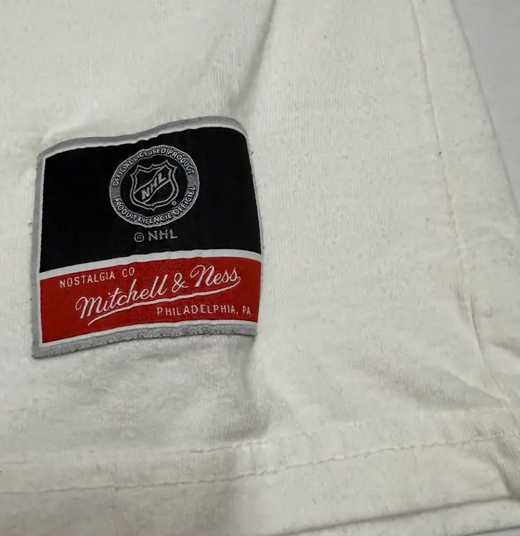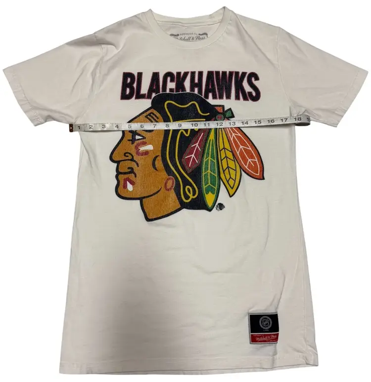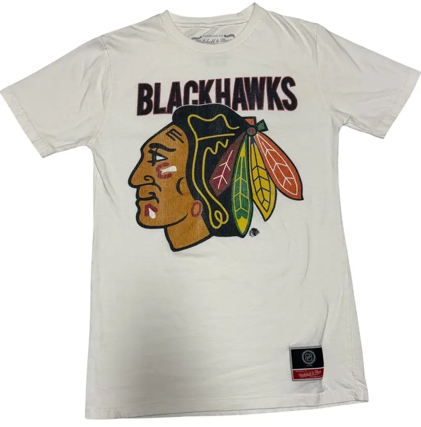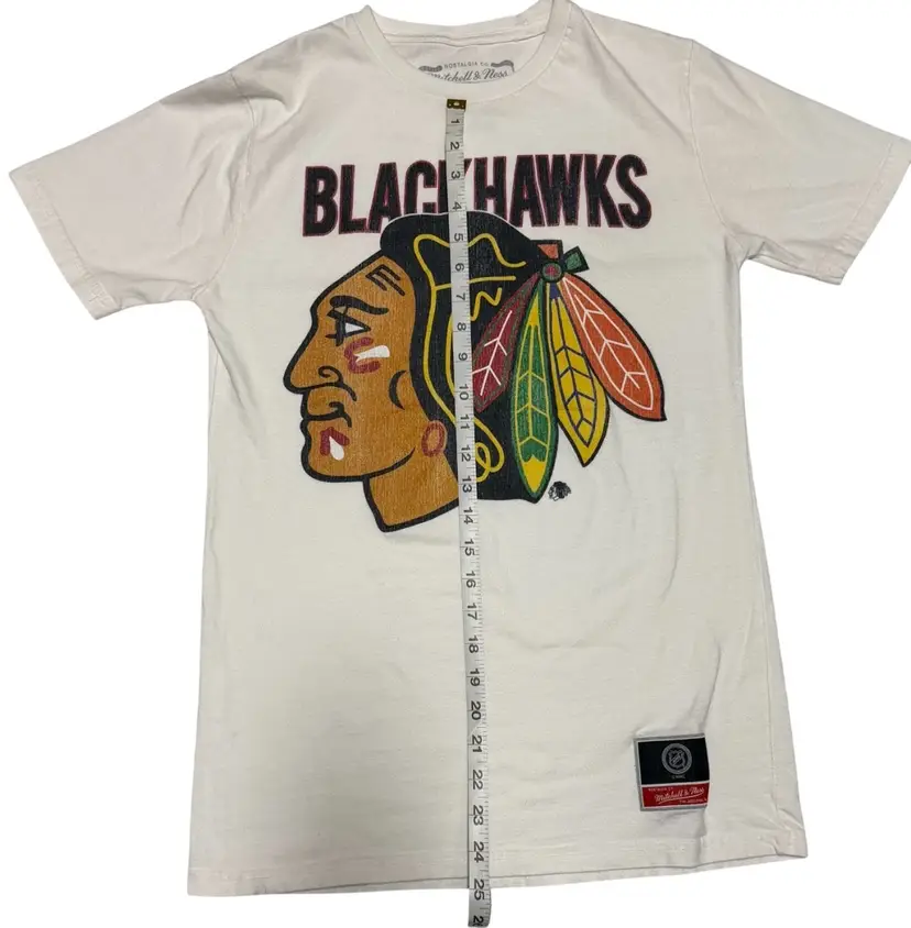 The Vintage Chicago Blackhawks Logo NHL Graphics Print T-Shirt by Mitchell & Ness is a classic piece of fan apparel for supporters of the Chicago Blackhawks. Officially licensed by the National Hockey League (NHL), this unisex adult shirt in size small features a white design with the iconic team logo, perfect for showing off team pride during the regular season. Made by the trusted brand Mitchell & Ness, this shirt is a must-have item for any hockey fan looking to represent their favorite team in style.