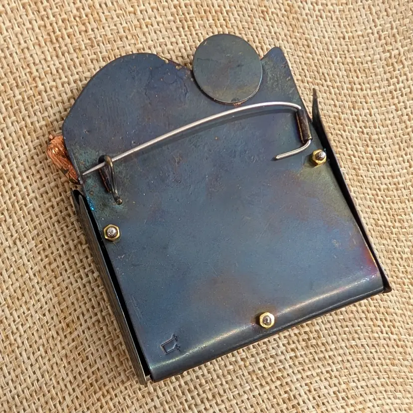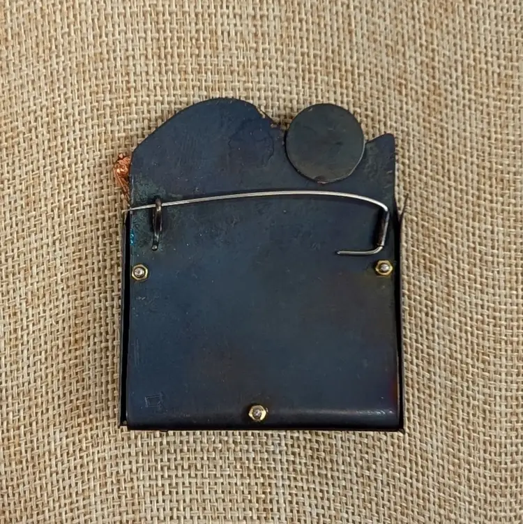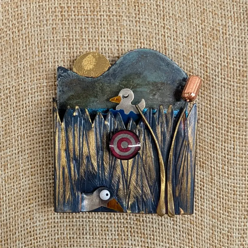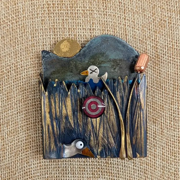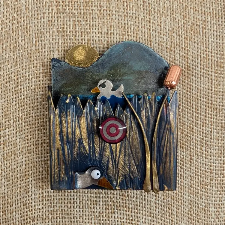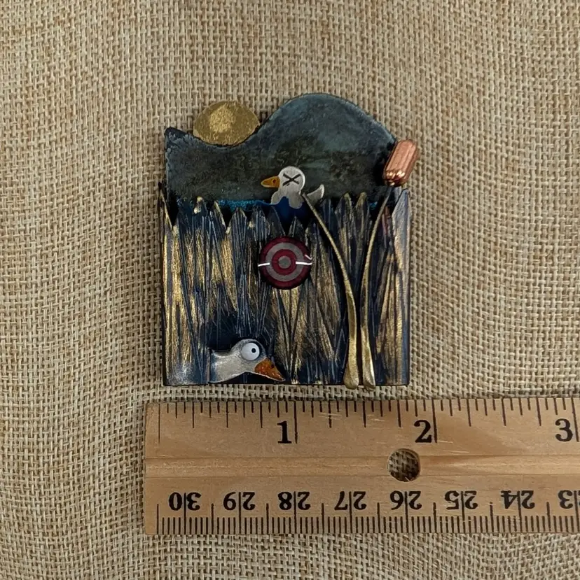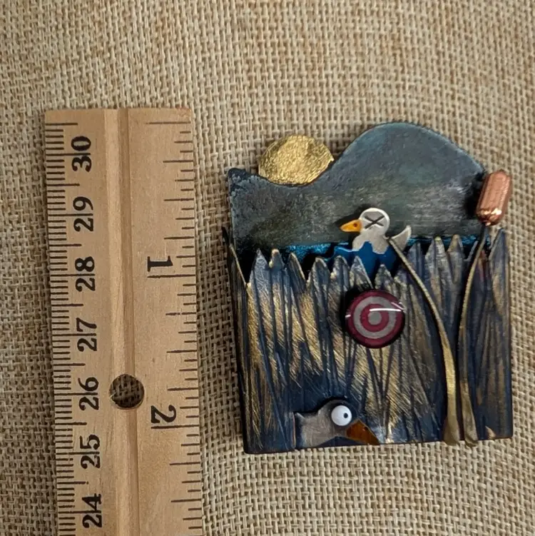 Artisan jewelry made by Lisa and Scott Cylinder of CHICKENSTATCH. Whimsical duck hiding in a pond while the top swimming duck can be rotated to show 4 different ducks ( "X" eye, plain eye, mad eye and sleeping eye). Has a stamped chicken feet print on the back. In nice, used condition. Measurements ~ 1-7/8 x 2-1/8"