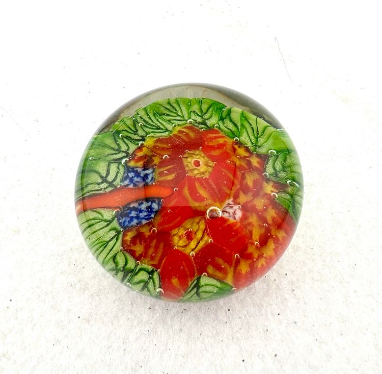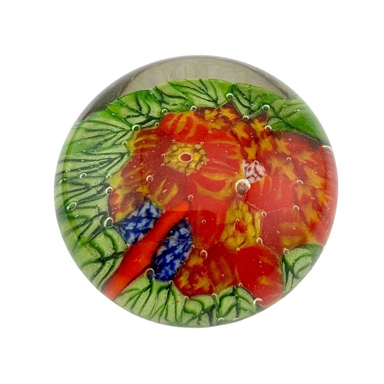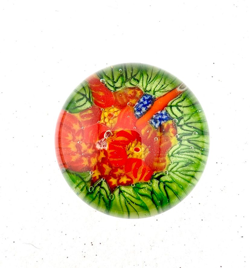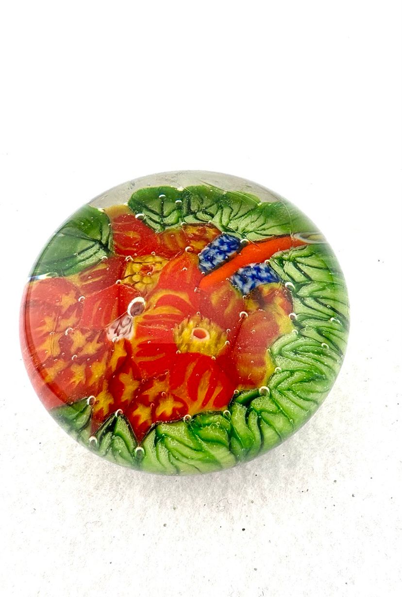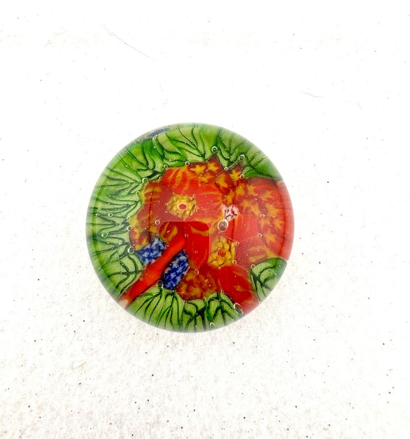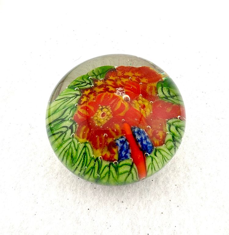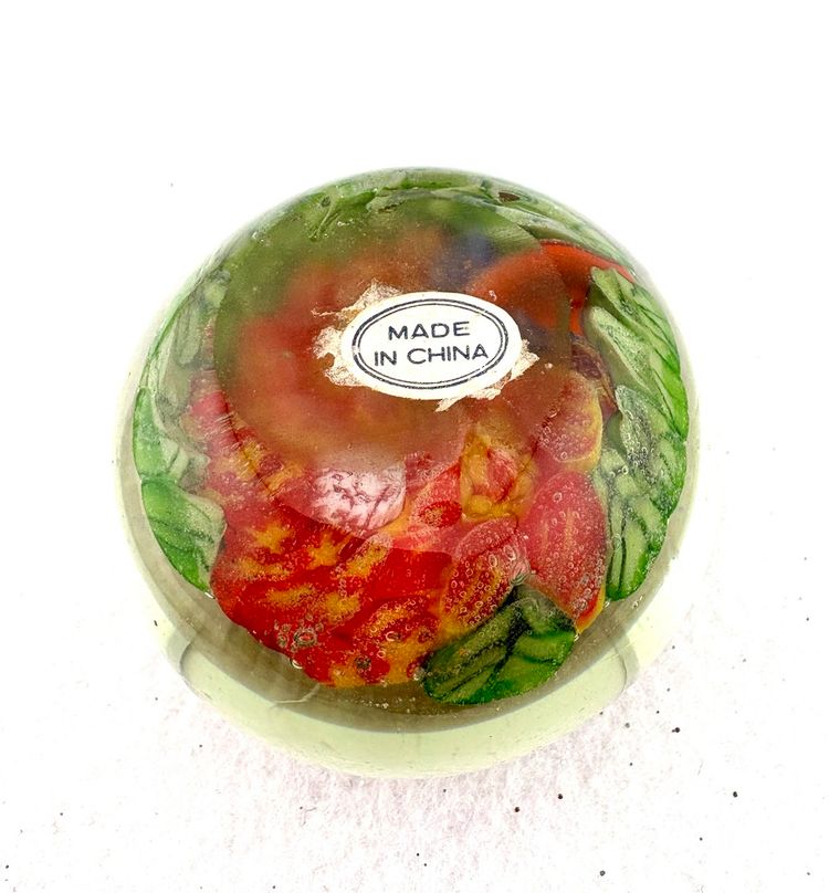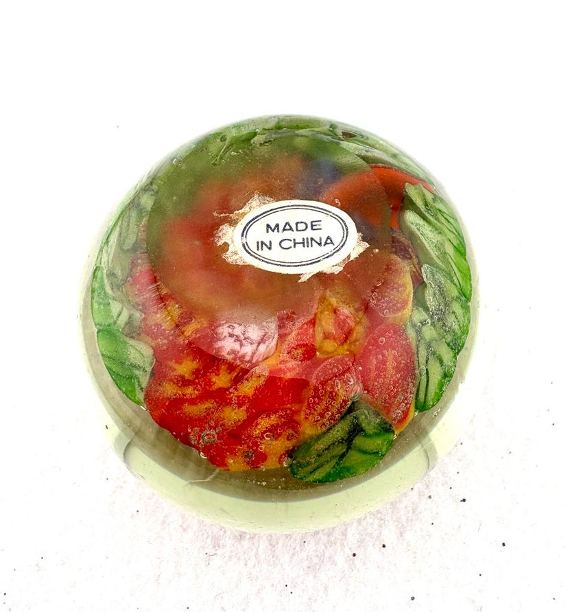 This is a beautiful paperweight made in China. The flowers are yellow and orange surrounded by a green background. There are small bubbles throughout. There is a sticker on the bottom Made in China. It is in good condition with no chips or cracks.
