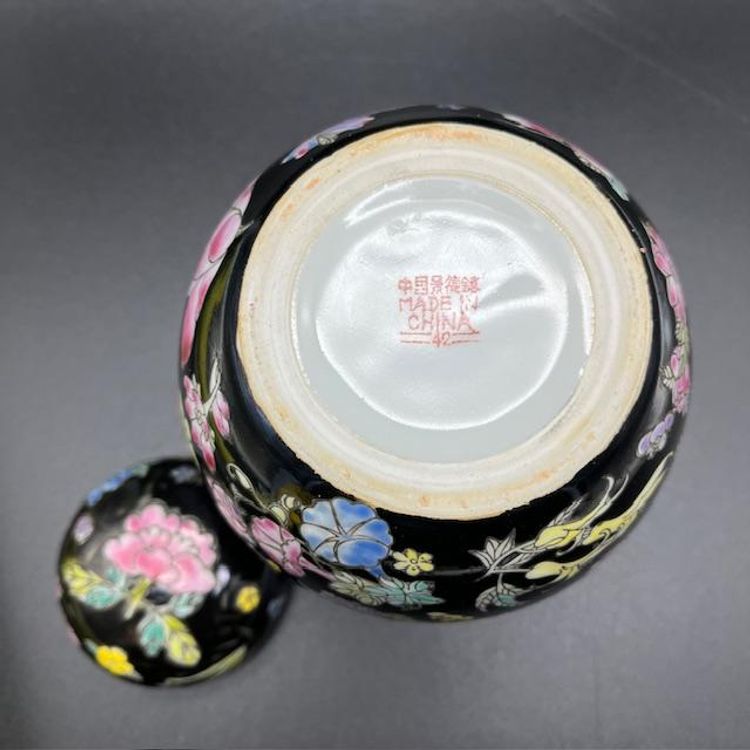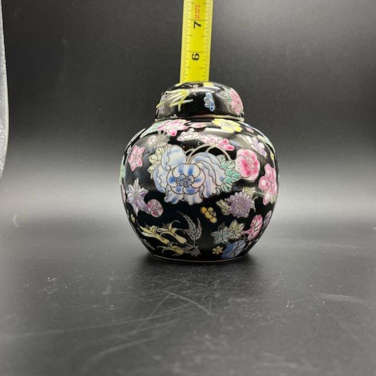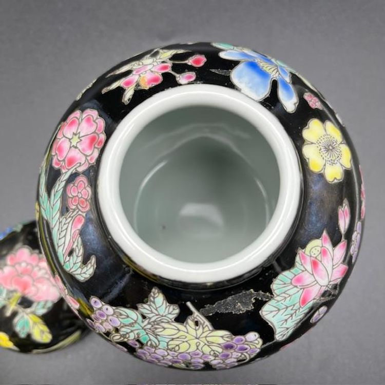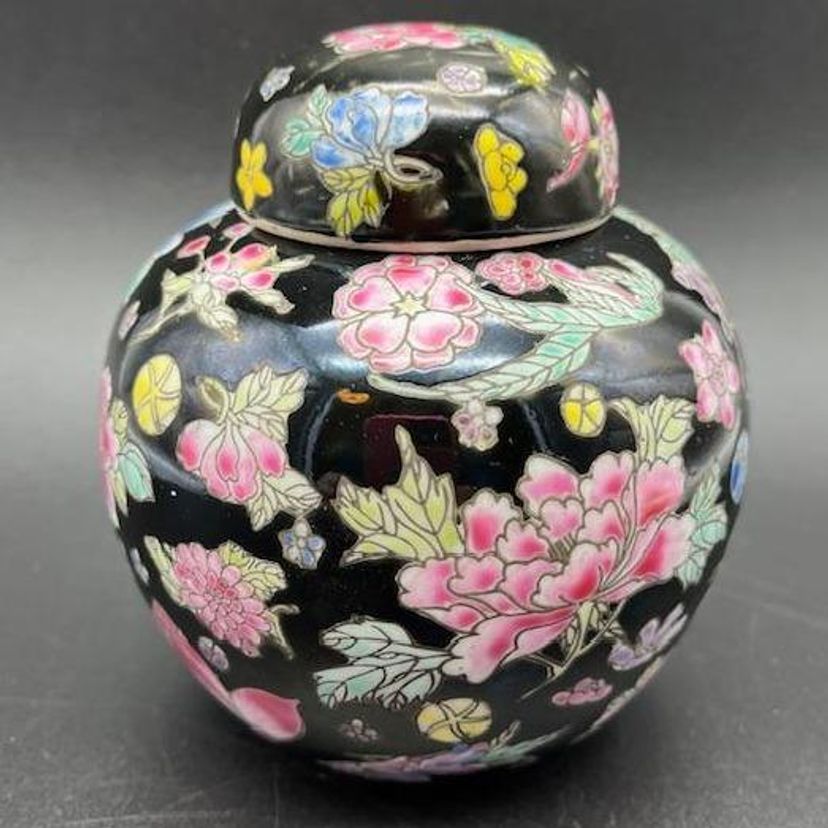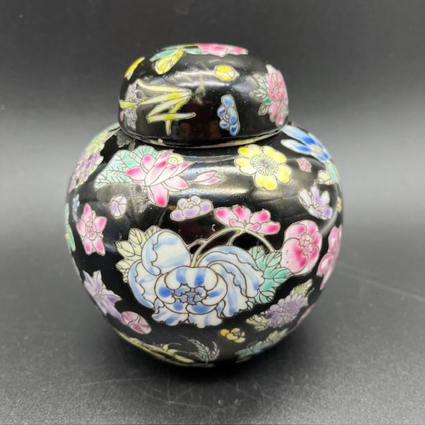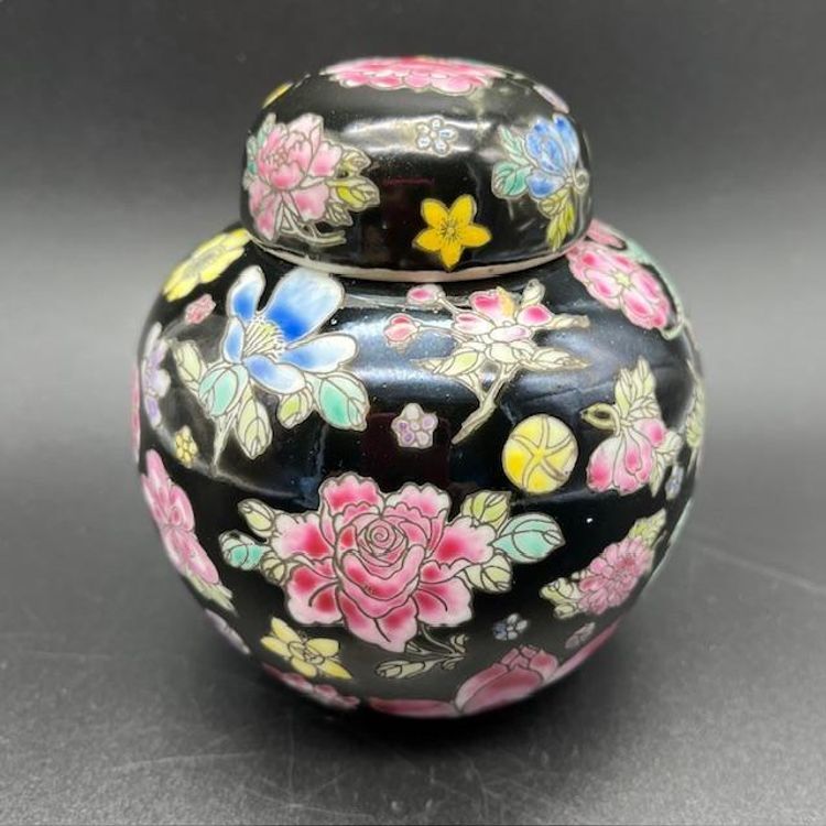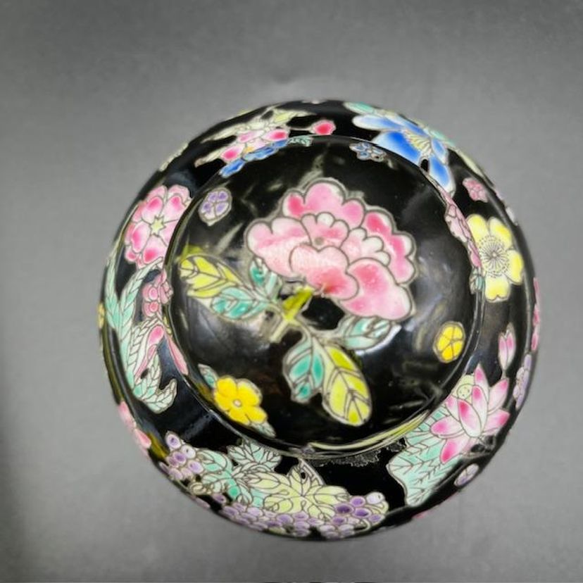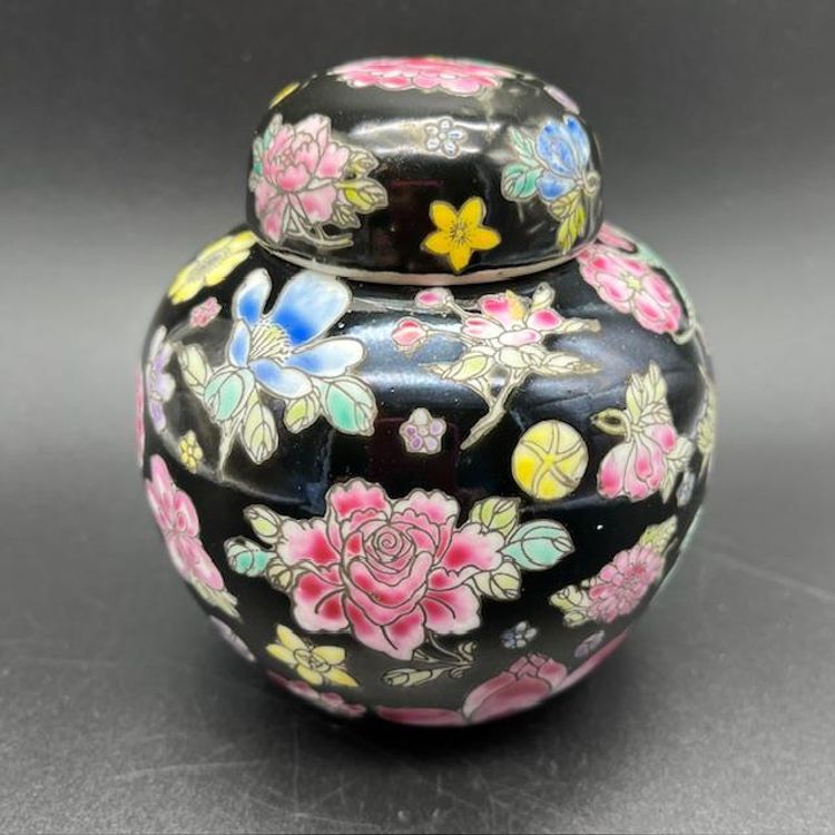 Beautiful vintage ginger jar featuring vibrant floral patterns on a sleek black background. No damage to this piece.