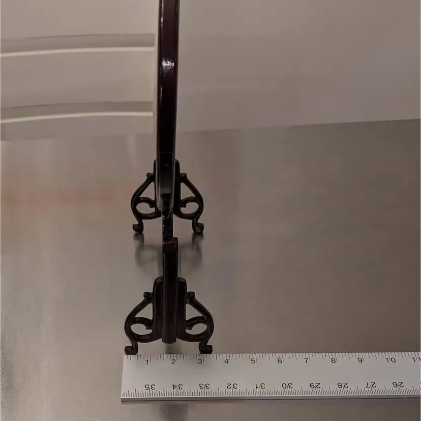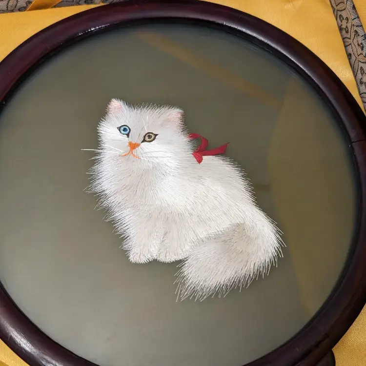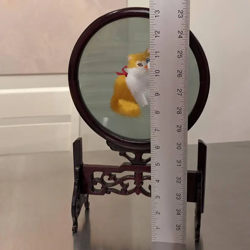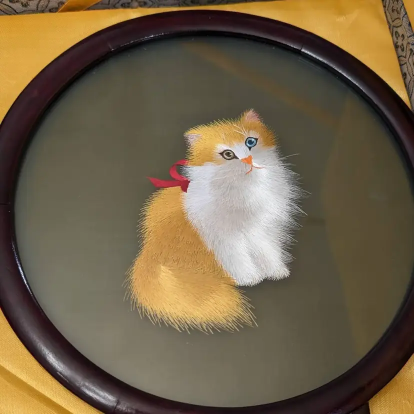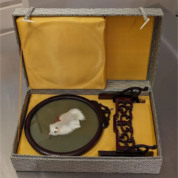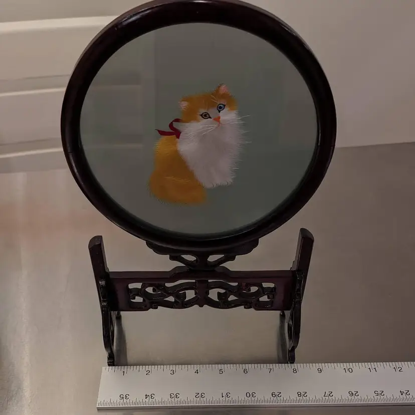 Beautiful, hand embroidered table screen that features two different colored cats. On one side the cat is orange and white and on the other side the cat is white. They have a red ribbon and two different colored eyes. The glass frame swivels on the rosewood stand. It comes in a cushioned fabric box. There is a little staining on the box and minimal wear on the piece (see pictures).