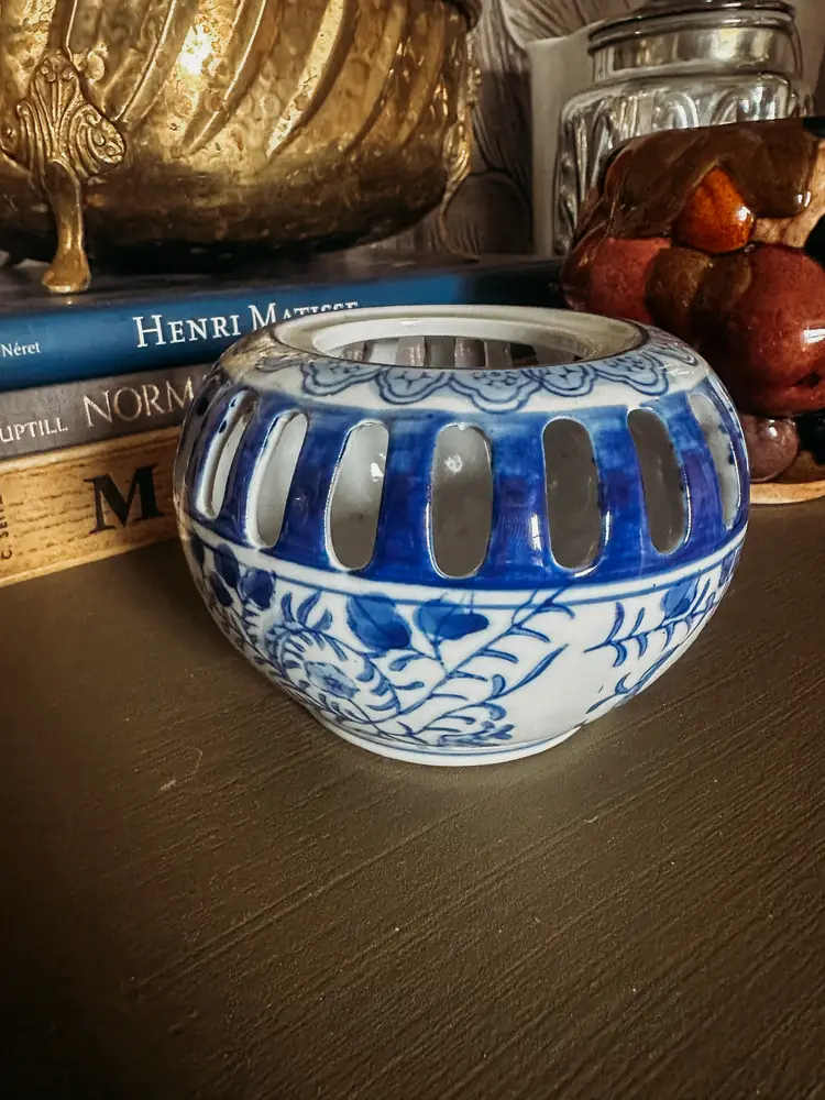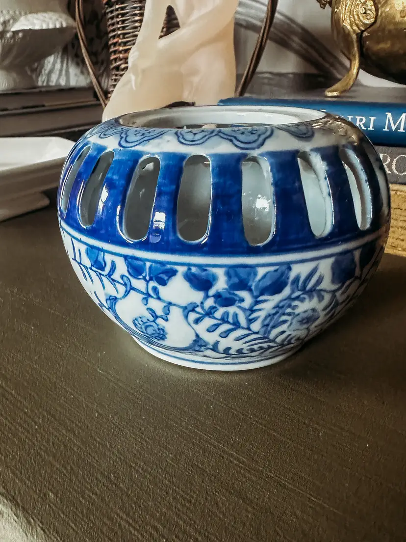 This was styled in my kitchen for years. It has been used as a bud vase, a candle holder, a jewelry dish and a garlic holder! It's incredible versatile even though it is missing its lid. 3" high and about 4.5" wide.