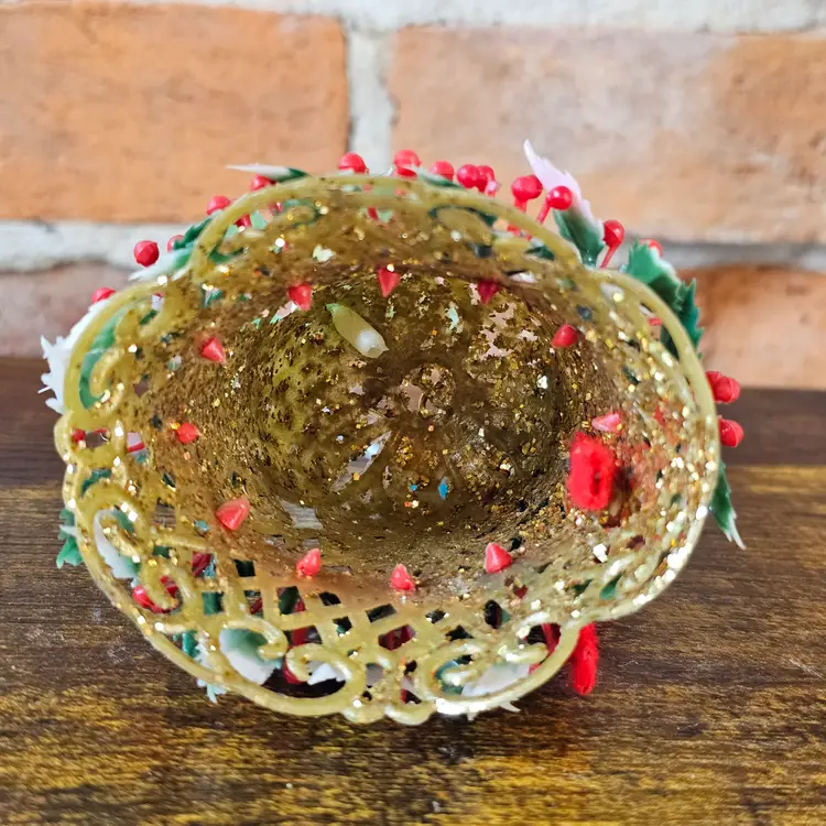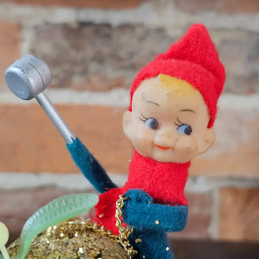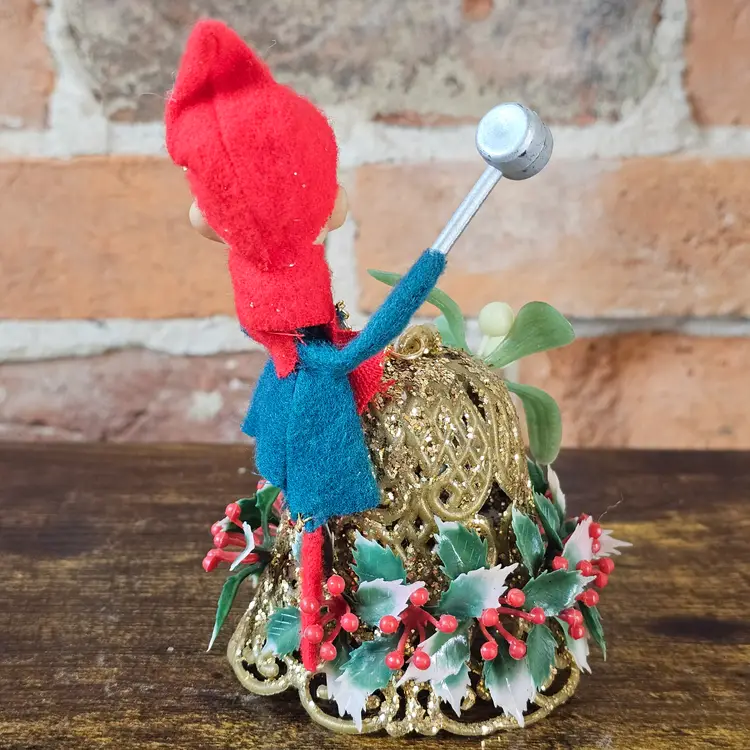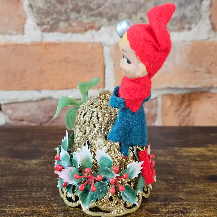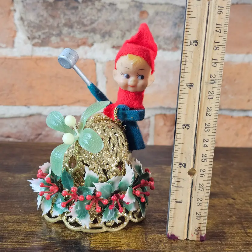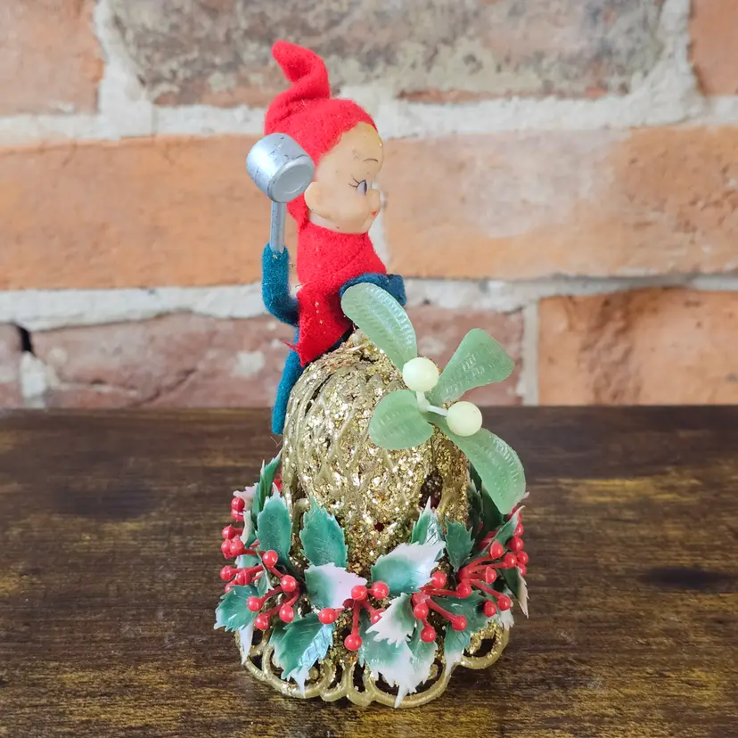 This is a charming vintage Christmas pixie elf figurine standing on a decorative gold glitter bell. The elf has a plastic face, a red felt hat, and a blue felt outfit with matching red accents. He is holding what appears to be a small silver mallet or bell ringer. The base of the bell is surrounded by a detailed plastic wreath of holly and berries and mistletoe. These figures were typically made in Japan in the 1950s or 1960s.