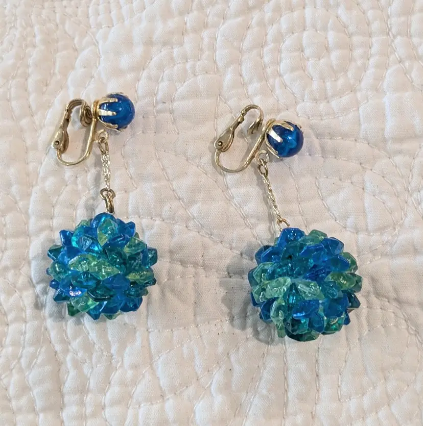 Vintage Clip On Earrings with Blue and Green Plastic Globes Suspended from Gold Tone Chains
