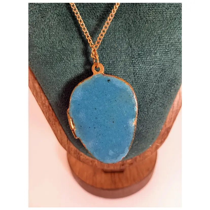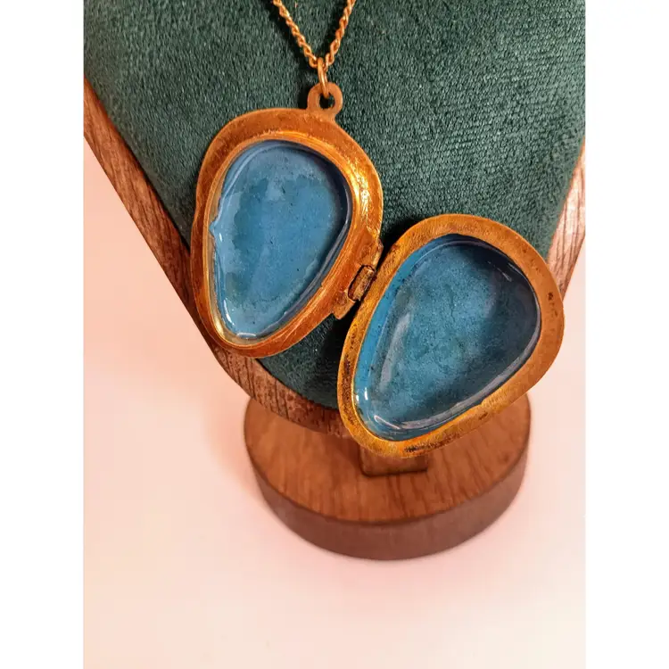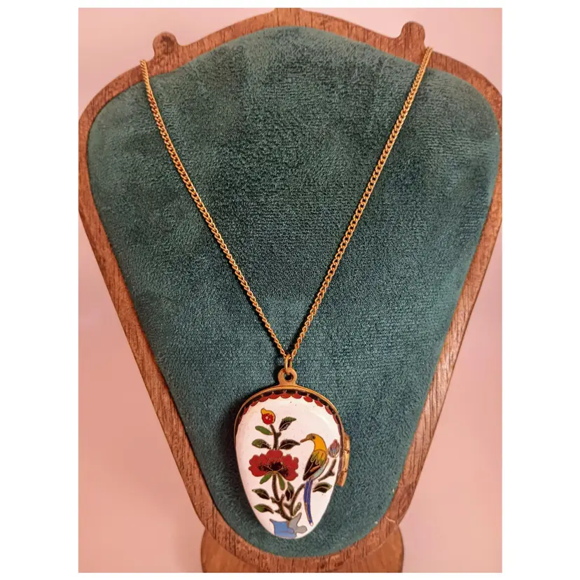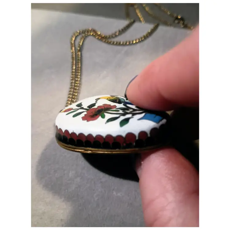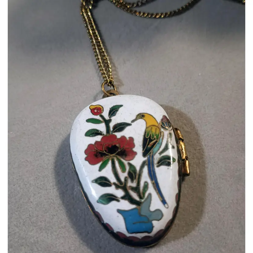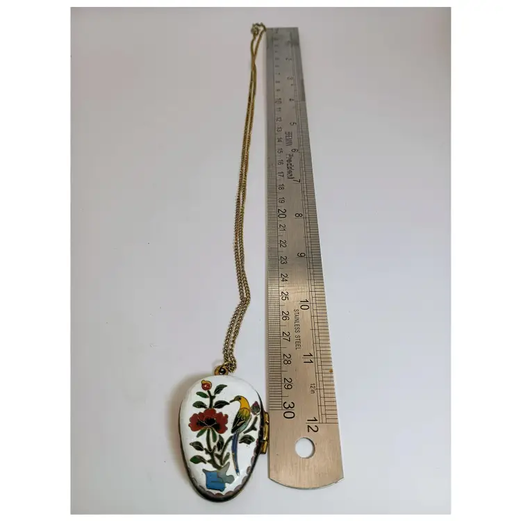 Hi thanks for looking. This beautiful enamel, Cloisonne Locket/Trinket Pendant is approximately 2 inches in length. It is strung on a brass chain with a spring clasp. The chain is approximately 24 inches long. It opens and on the inside is beautiful turquoise enamel. The back is enamel as well. This piece is in great vintage condition. Some enamel ware on the back of the pendant, and one flea bite on the top left flower. This is a very rare beauty.
