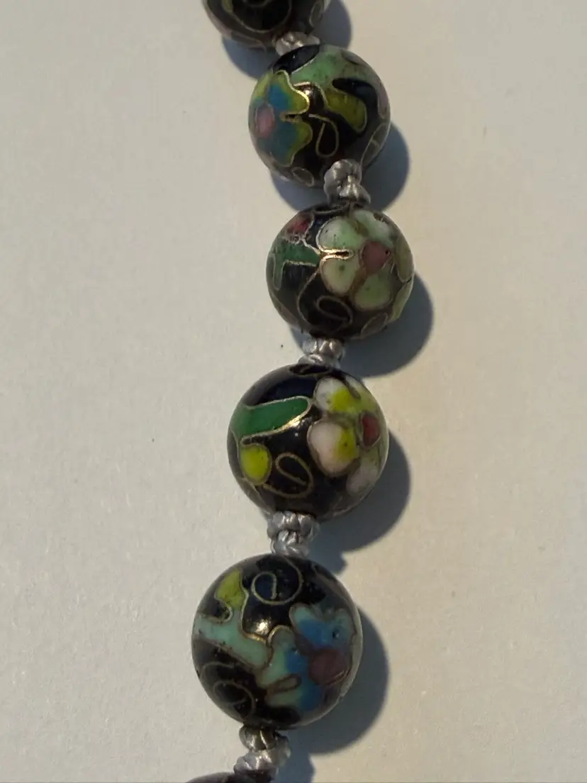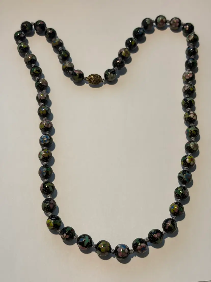 Vintage Cloisonné Black Glass Beaded Necklace 24” Knotted Between The Beads