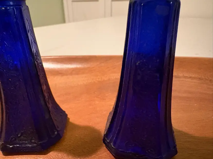 These vintage cobalt blue salt and pepper shakers are a charming addition to any kitchen or dining room. Standing at 5.5 inches tall with a plinth shape, these shakers feature a floral pattern and are made of glass. The set includes two shakers, one for salt and one for pepper, making them functional and decorative. Perfect for collectors or anyone looking to add a touch of retro style to their kitchen tools and gadgets collection, these shakers are a unique and colorful find.