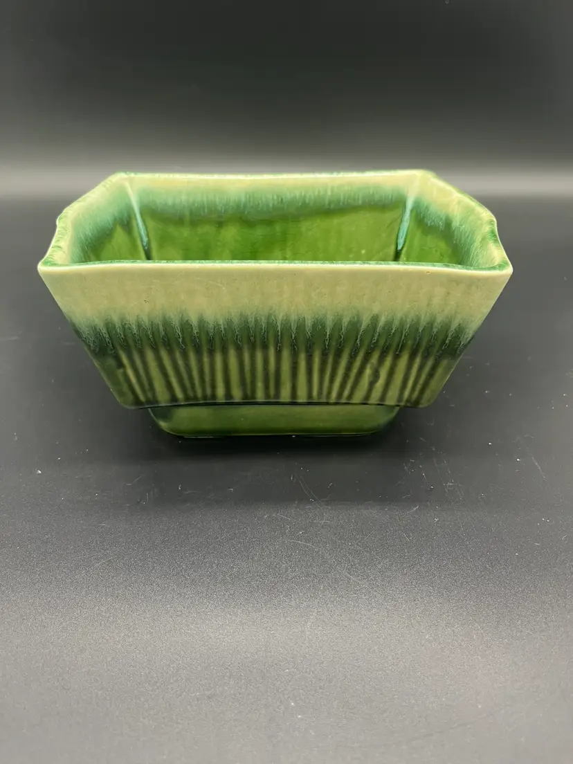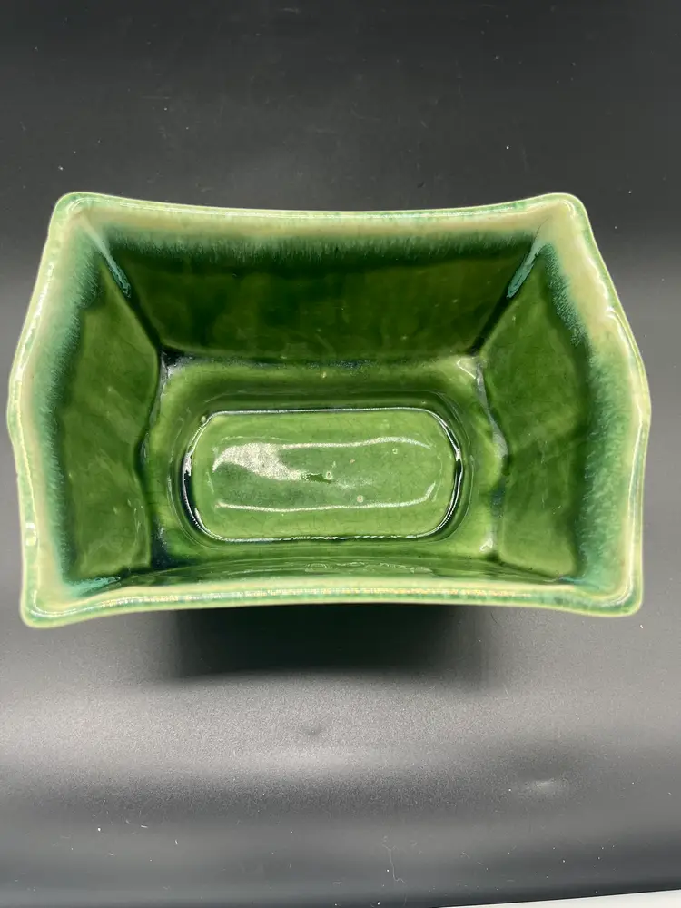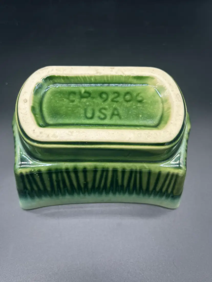 This vintage Cookson Pottery planter (CP9206 USA) features a rich green drip glaze over vertical ribbing, with a soft rectangular form and flared rim. A classic example of mid-century America ceramics - perfect for succulents, herbs or display on a retro shelf. glaze transitions from deep forest green to lighter jade tones with natural variations typical of Cookson's studio-style finishes. No chips or cracks, light wear consistent with age. 3.5" tall, 6.5" wide, 4.5" depth. Shipping included.