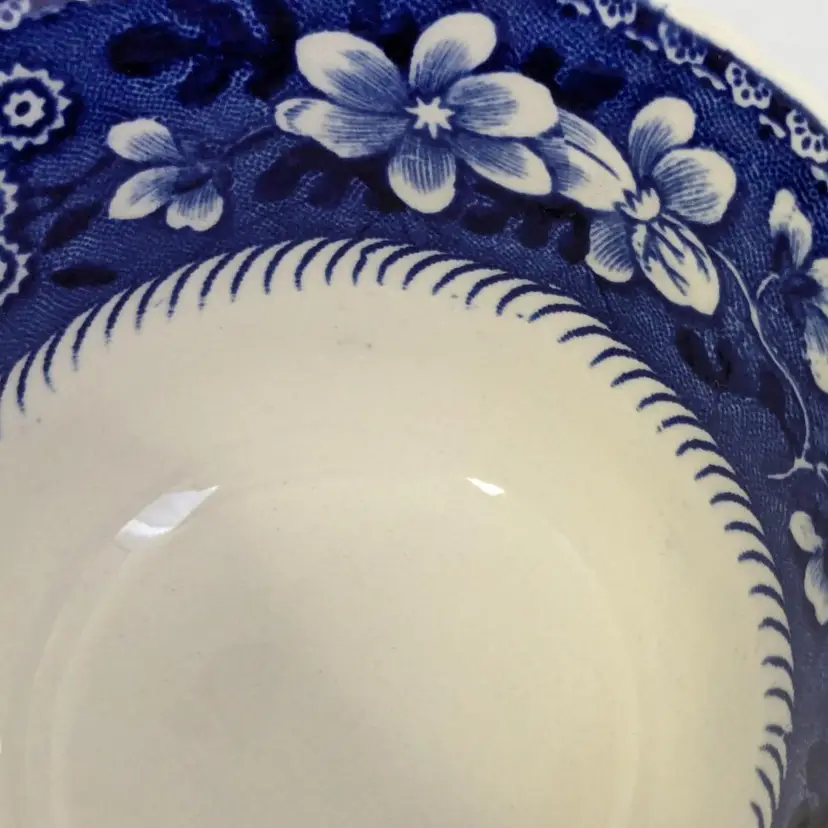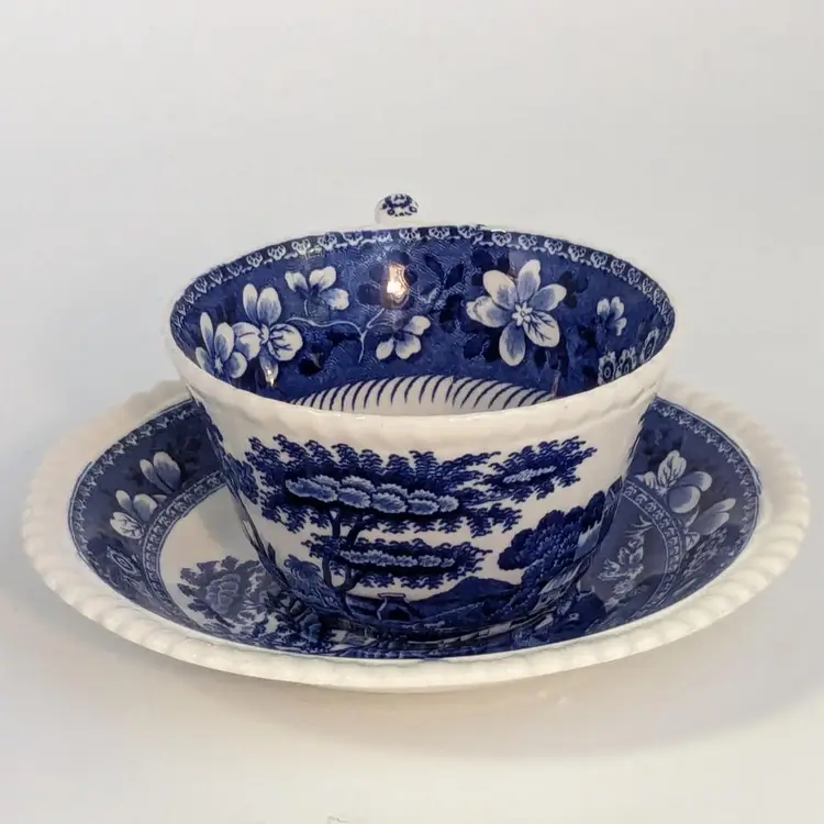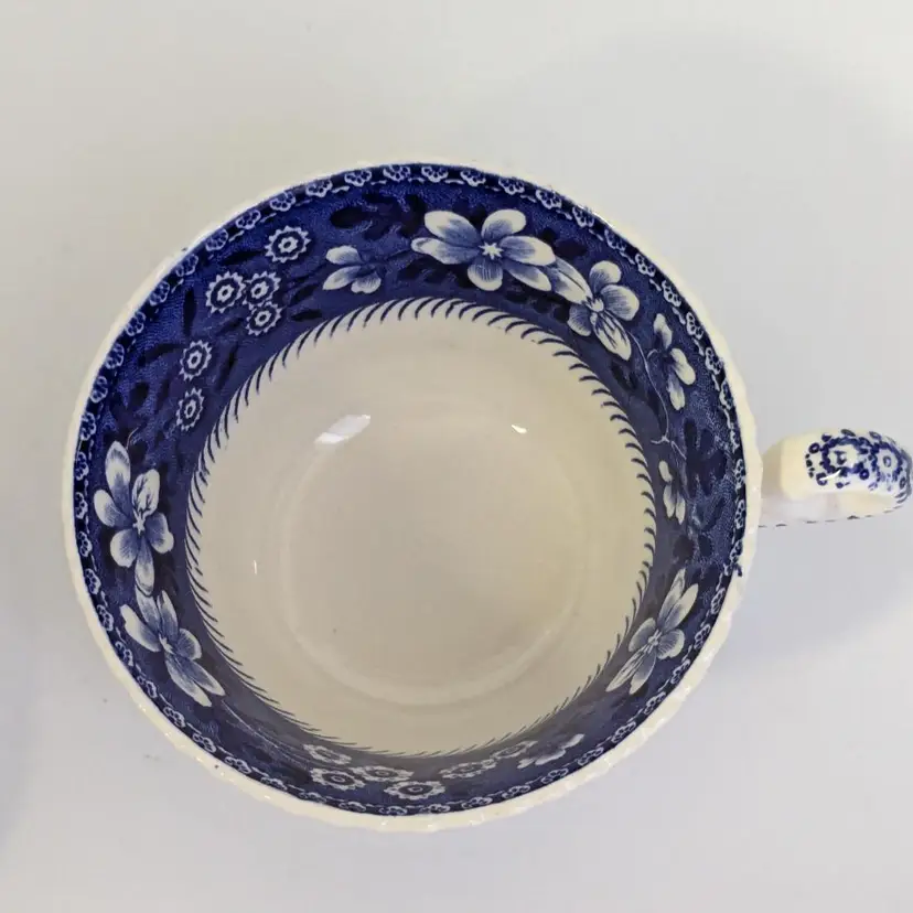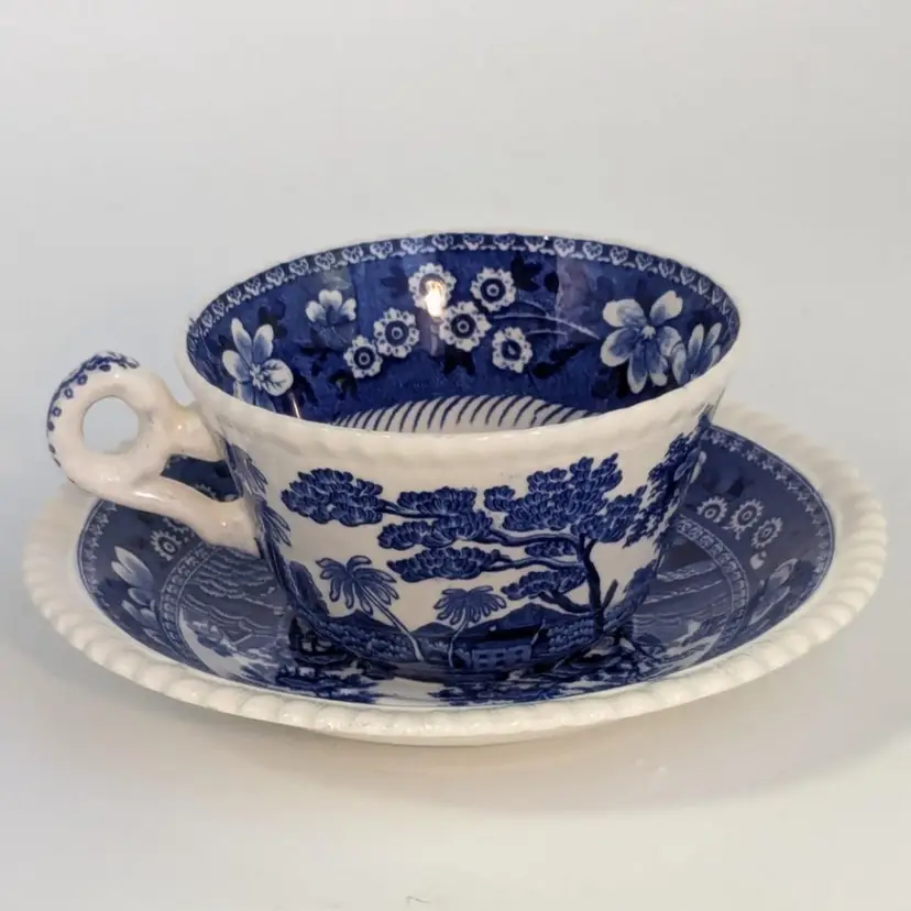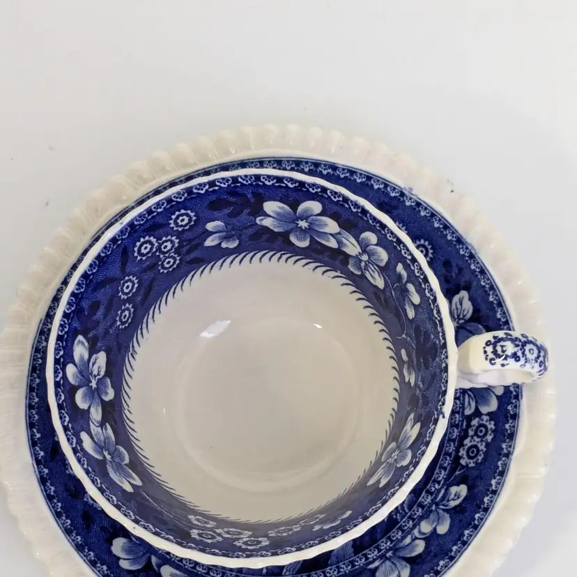 Lovely blue and white English teacup is in good condition with no chips or cracks. Saucer is 6"wide and cup is 2 1/4" in height and 3 3/4" wide. Made in England.
