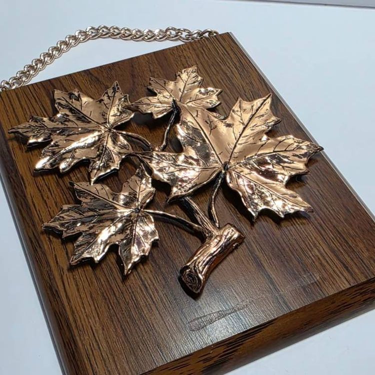 Add a touch of Canadian craftsmanship to your decor with this charming vintage wall art. Featuring copper maple leaves on wood, it's a timeless piece.
