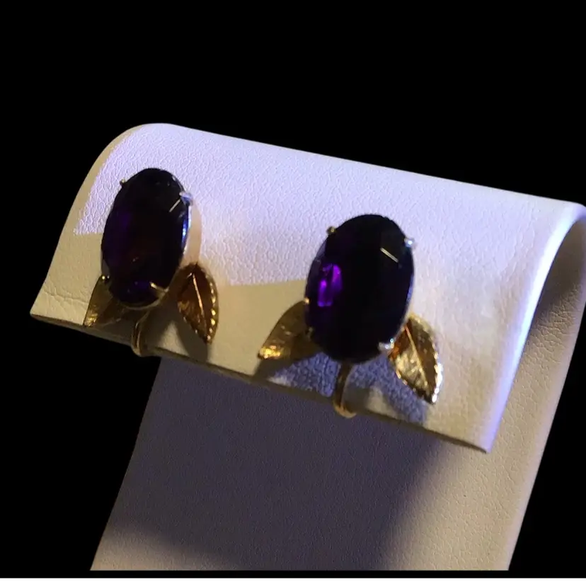Prong set deep grape colored stones with gold tone leaves, screw back. #589