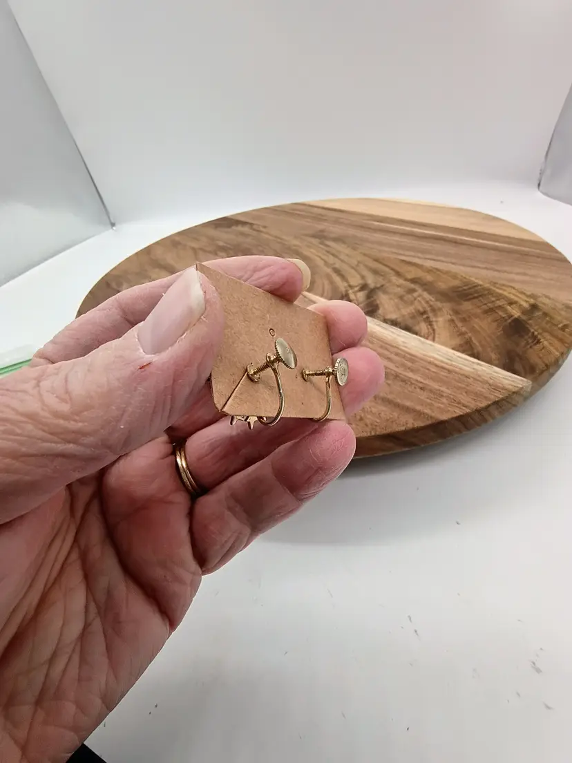 Vintage Coro Prong Set Opaline Glass Flower Screw Back Earrings Gold Tone. Large single pressed glass bead shaped like a flower surrounded by starburst. These are 1.75 inches in diameter. Circa 1930-1950. These are preowned, Glass flowers are intact. prongs are intact. no missing or damaged stones. The screw backs work normally. Marked on back of screws. Metal is shiny and bright slight patina but no oxidation. Excellent condition for age. Ships USPS