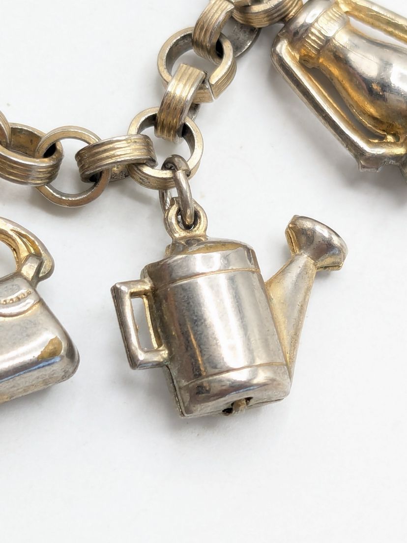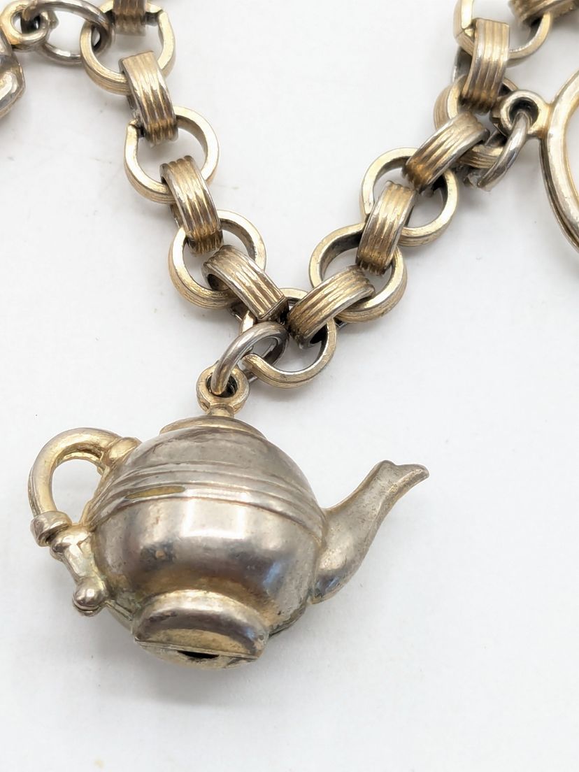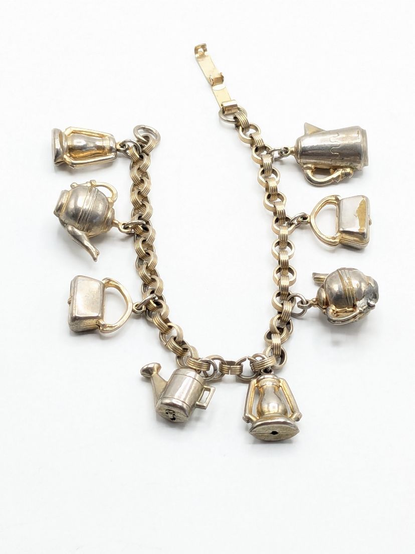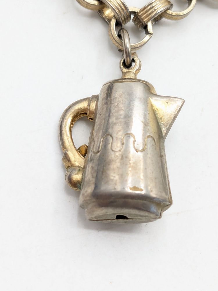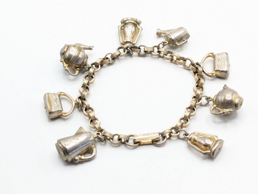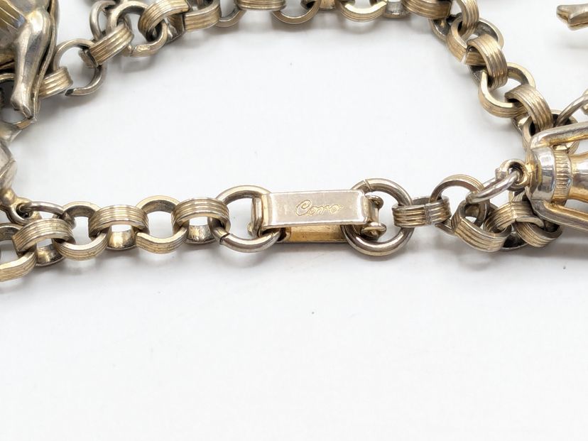Good condition with some wear to the silver tone. Features 8 charms tea and coffee pots, lanterns, and purses. Signed Coro. Charms are approximately 1/2" - 3/4". Bracelet measures 6 1/2". EN3