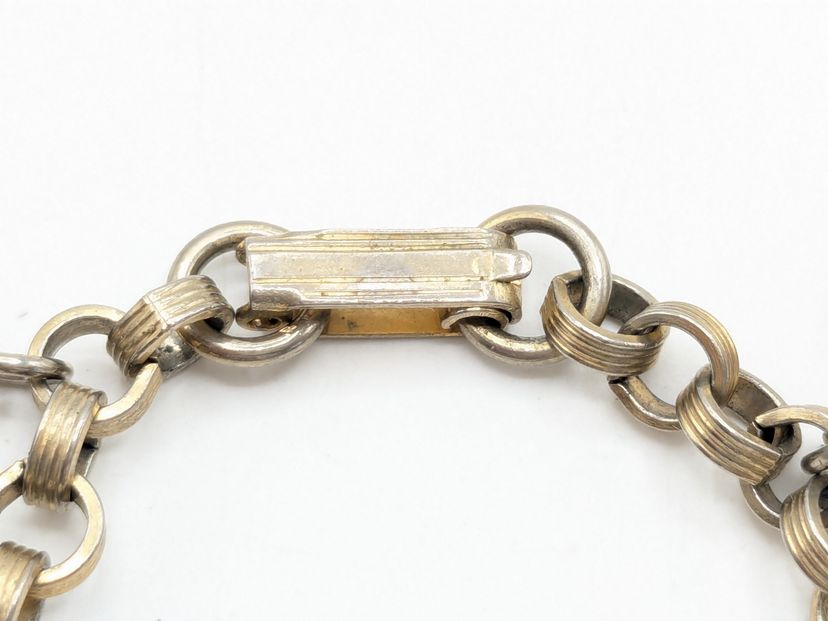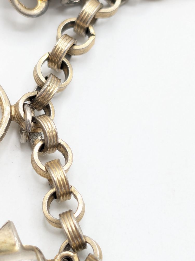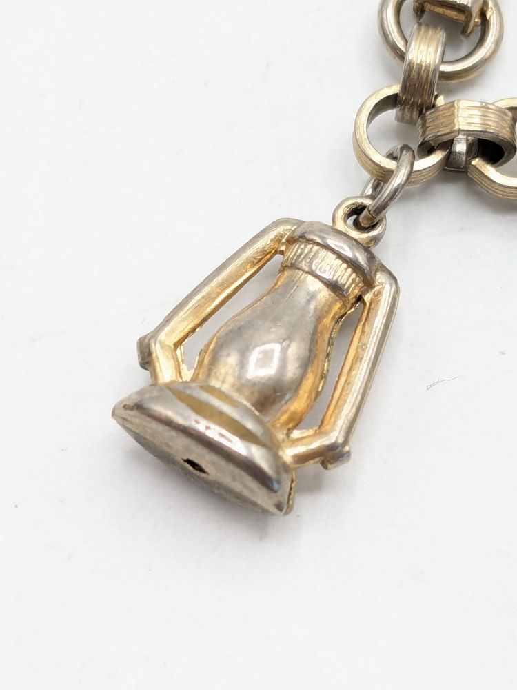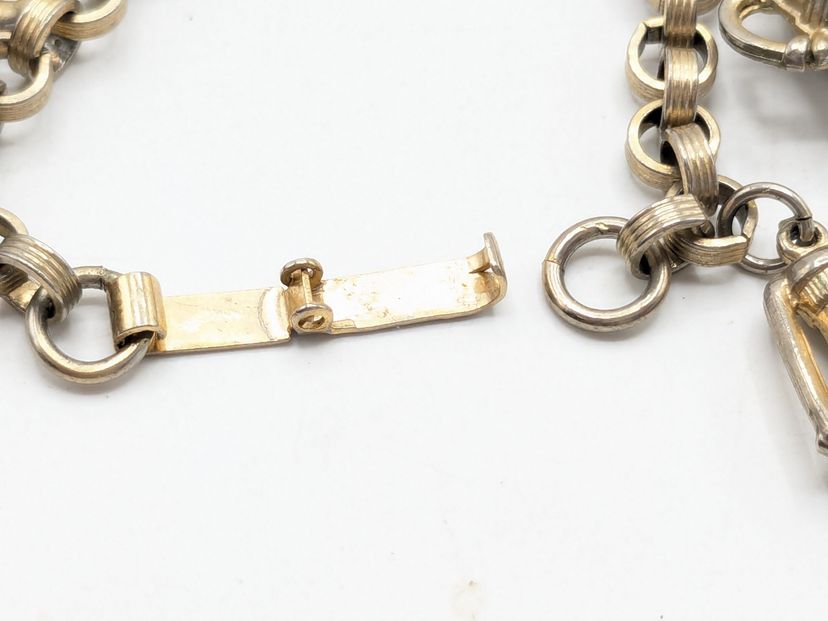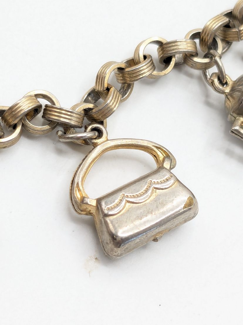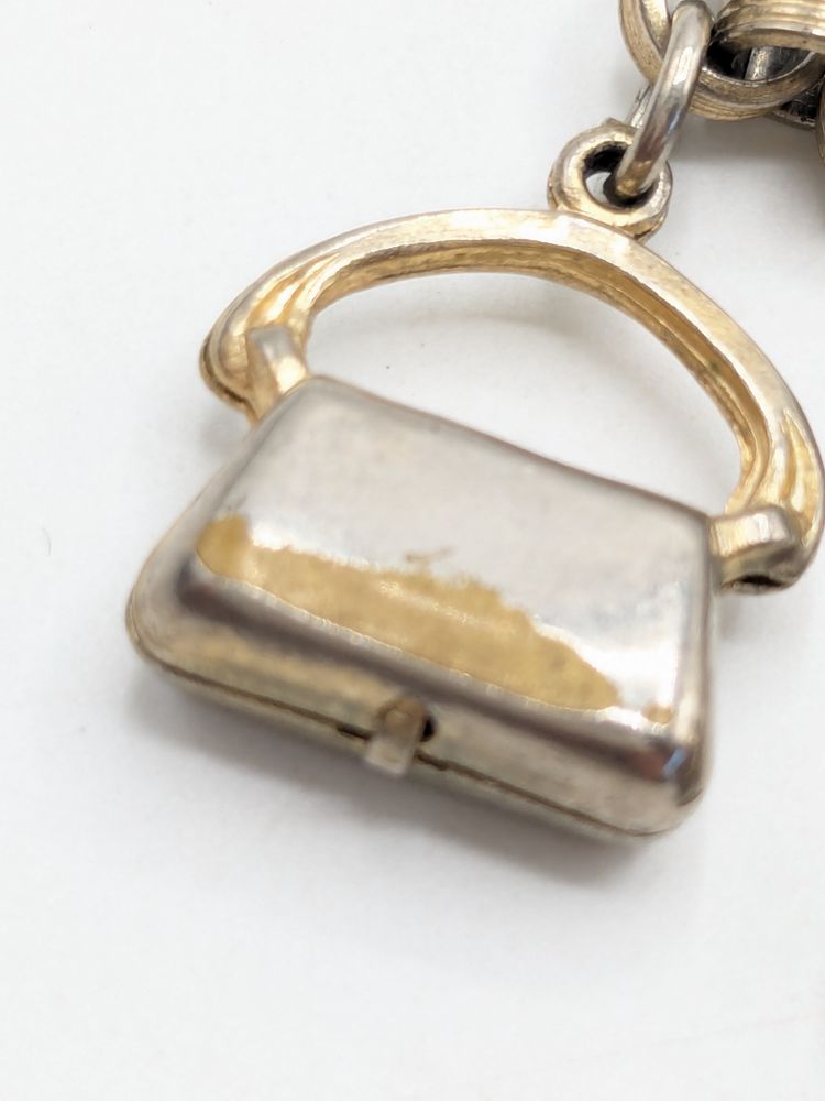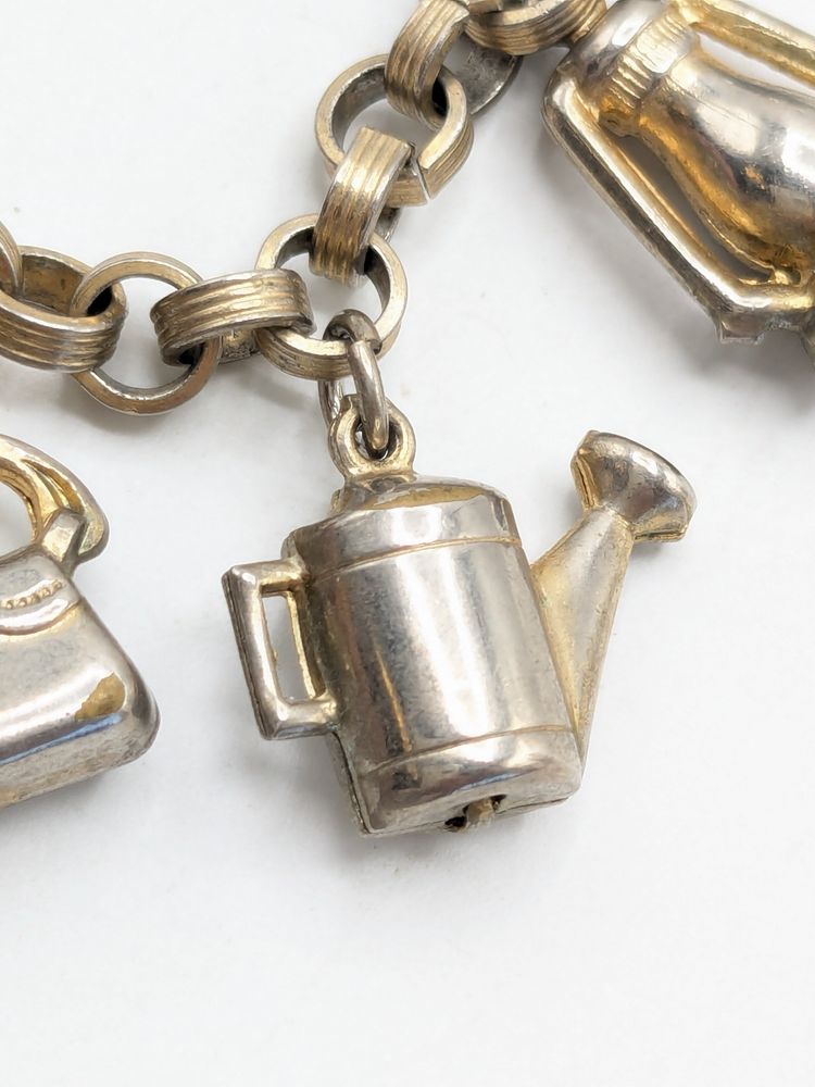 Good condition with some wear to the silver tone. Features 8 charms tea and coffee pots, lanterns, and purses. Signed Coro. Charms are approximately 1/2" - 3/4". Bracelet measures 6 1/2". EN3