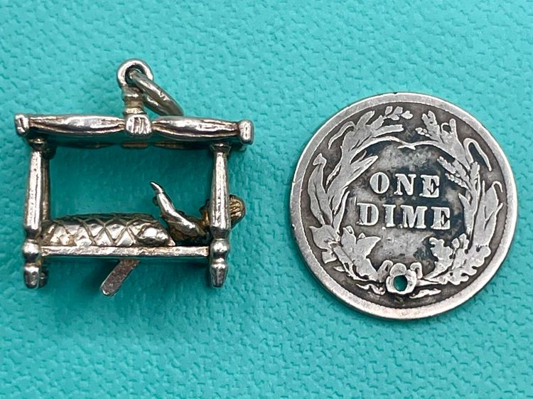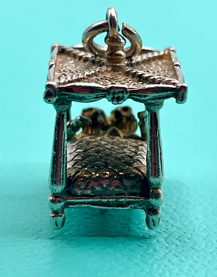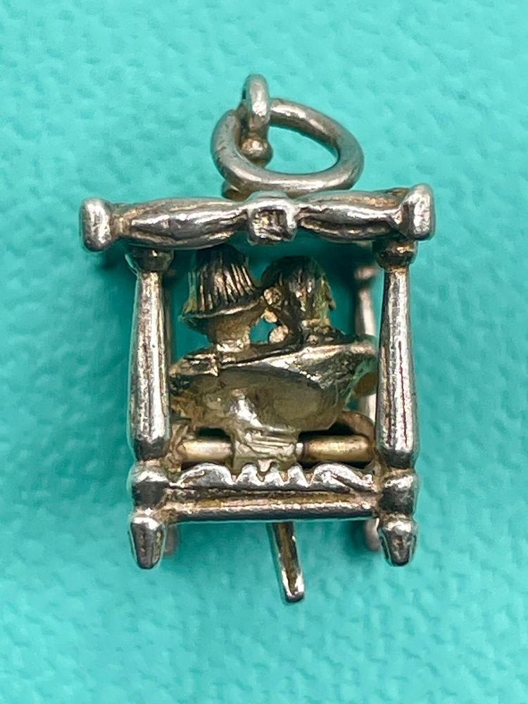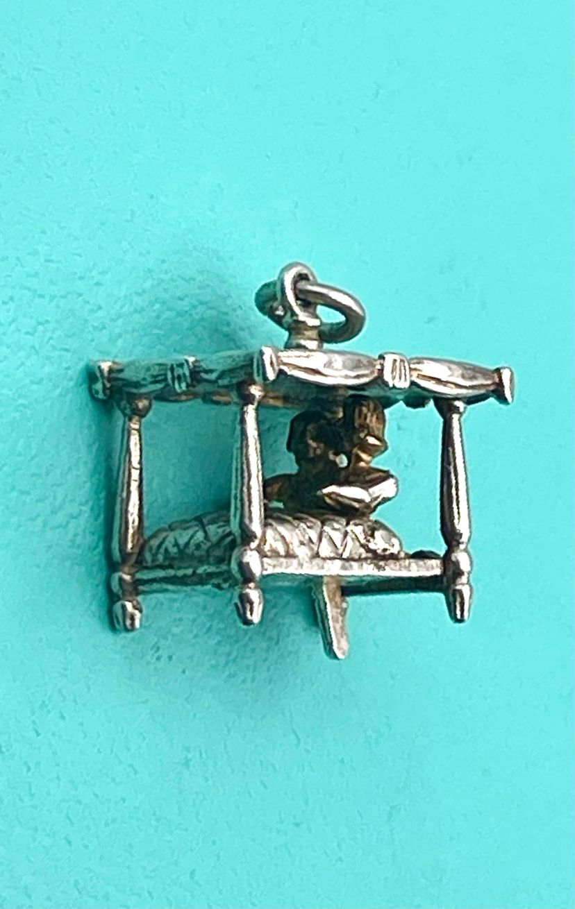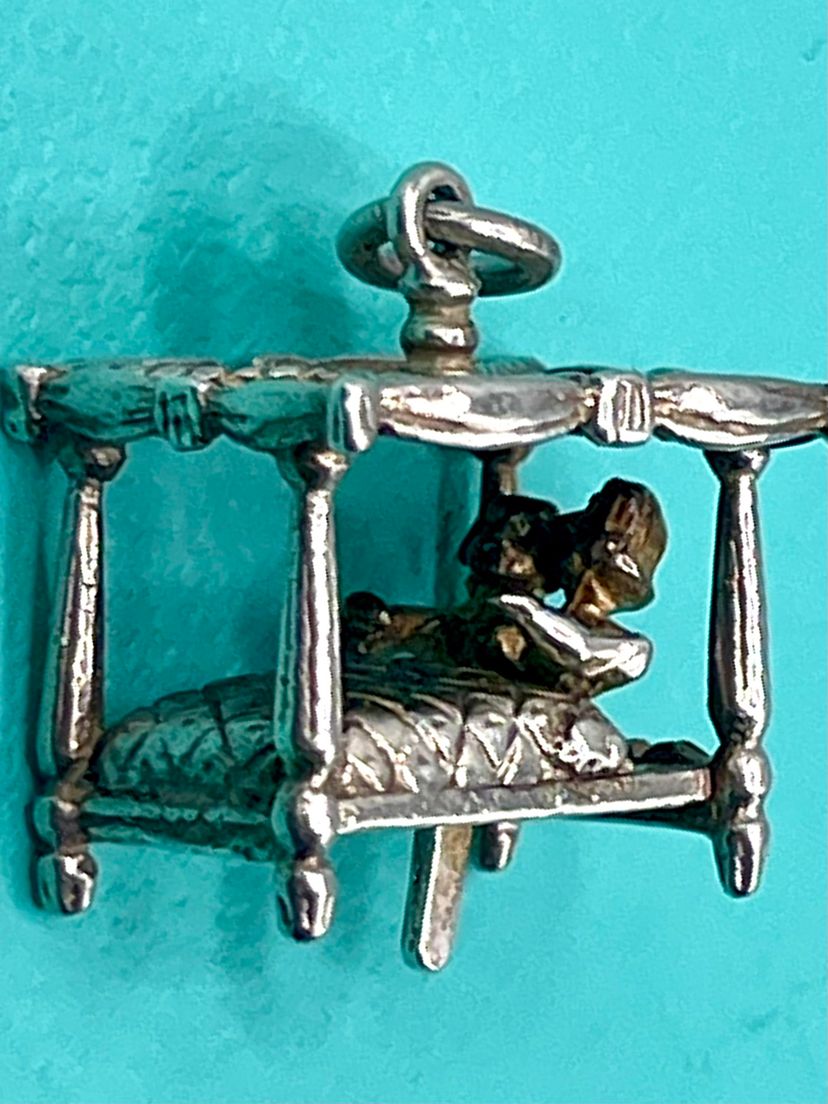 This spectacularly clever vintage sterling silver charm is of a four-poster bed with a couple inside, the charm has a little lever at the base which makes the couple sit up in bed. Unmarked but acid tests as sterling.