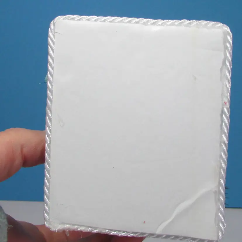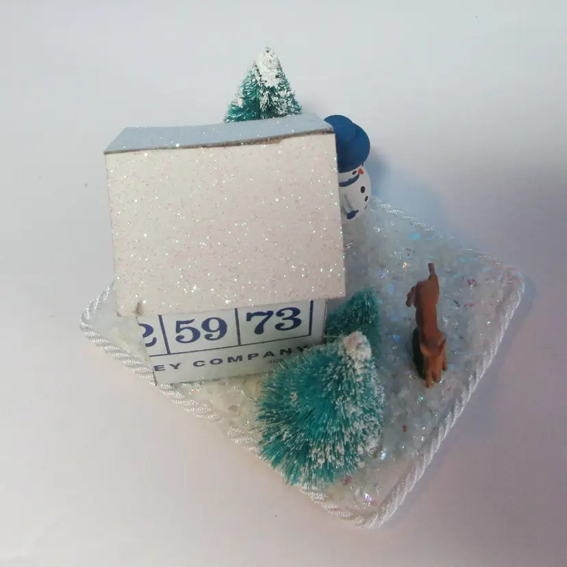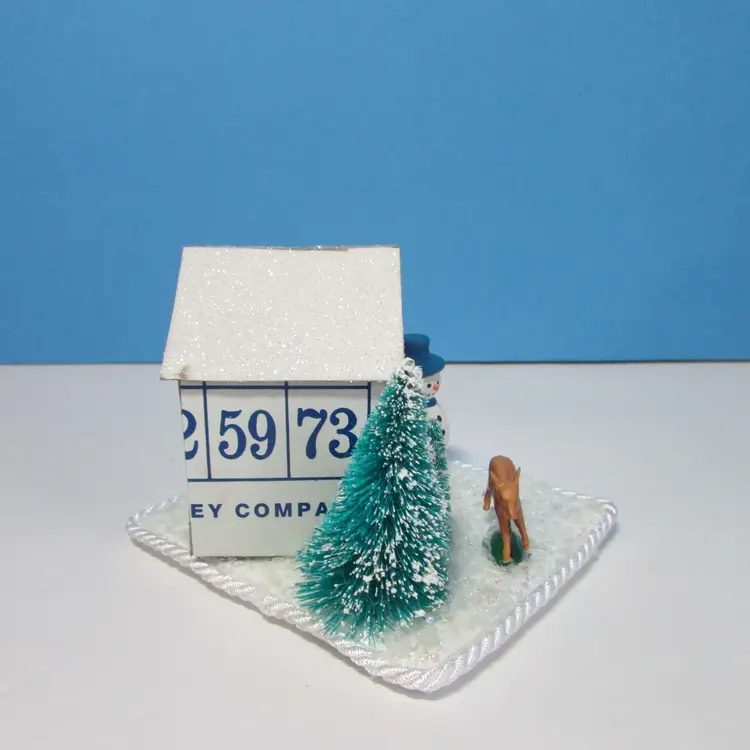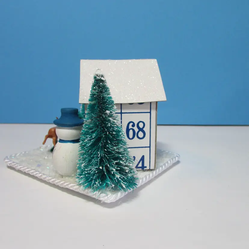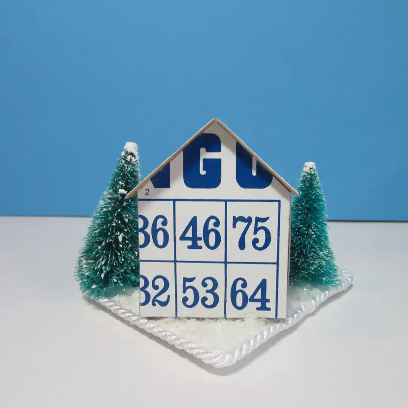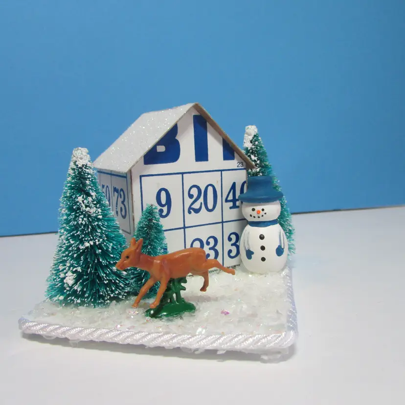 This adorable house was made from bingo cards by mom, she added some tress and figures to make a cute winter scene. The base is made from some foam board, the rough has glitter. It is about 3" x 4" x 3". This is shipped from a smoke free home. Thanks for looking!