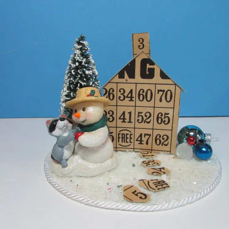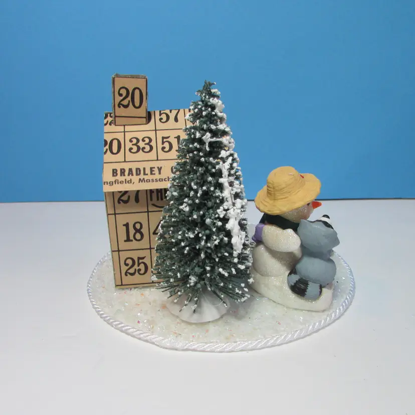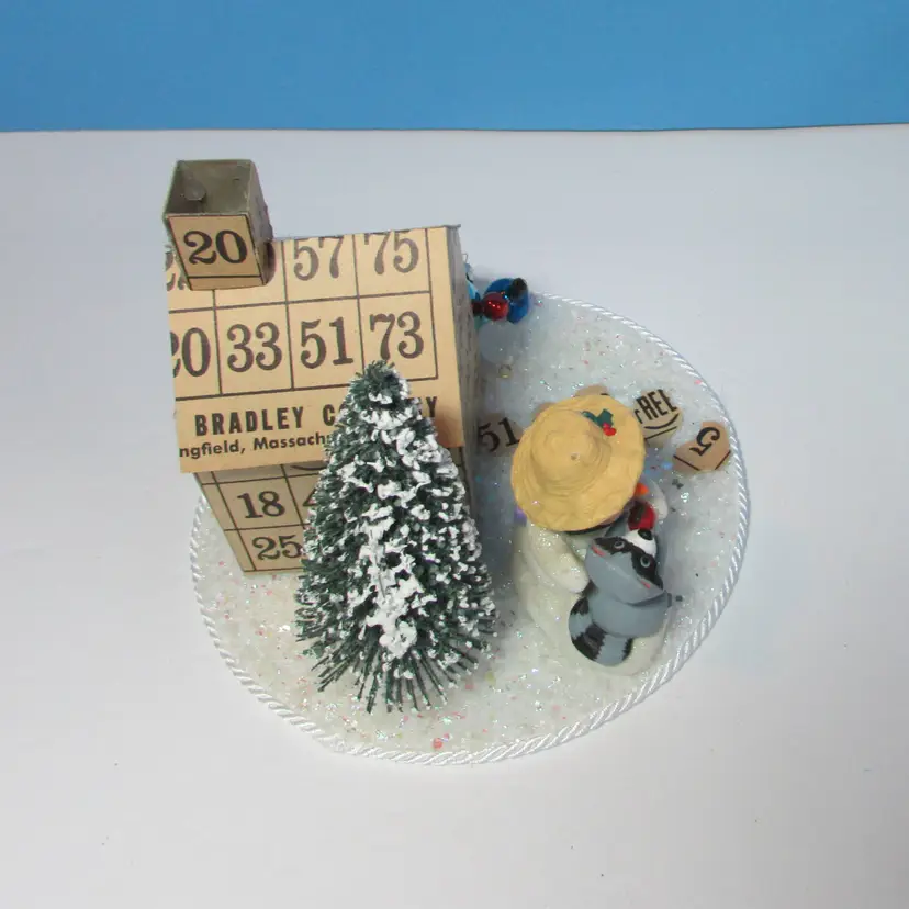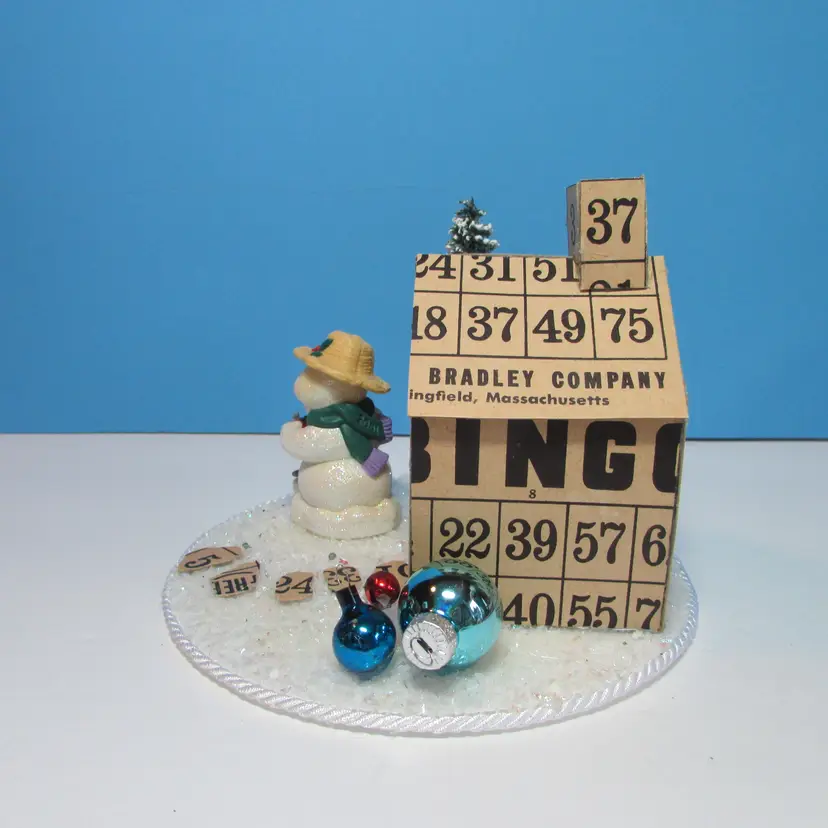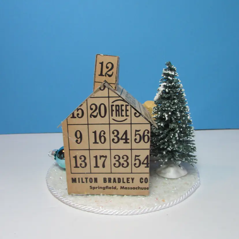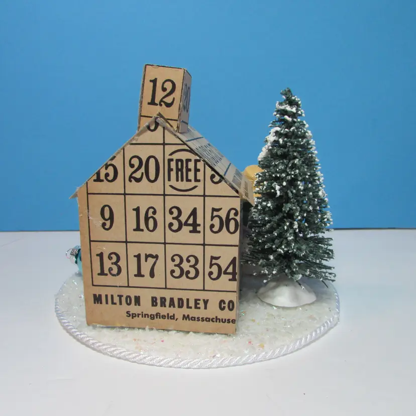 This adorable house was made from bingo cards by mom, she added some tress and figures to make a cute winter scene. The base is a small round cake board. It is about 5" x 6 1/4" round. This is shipped from a smoke free home. Thanks for looking!