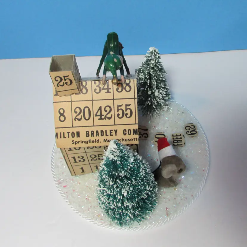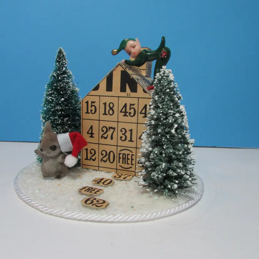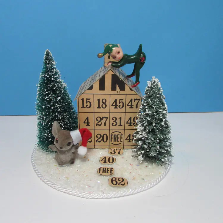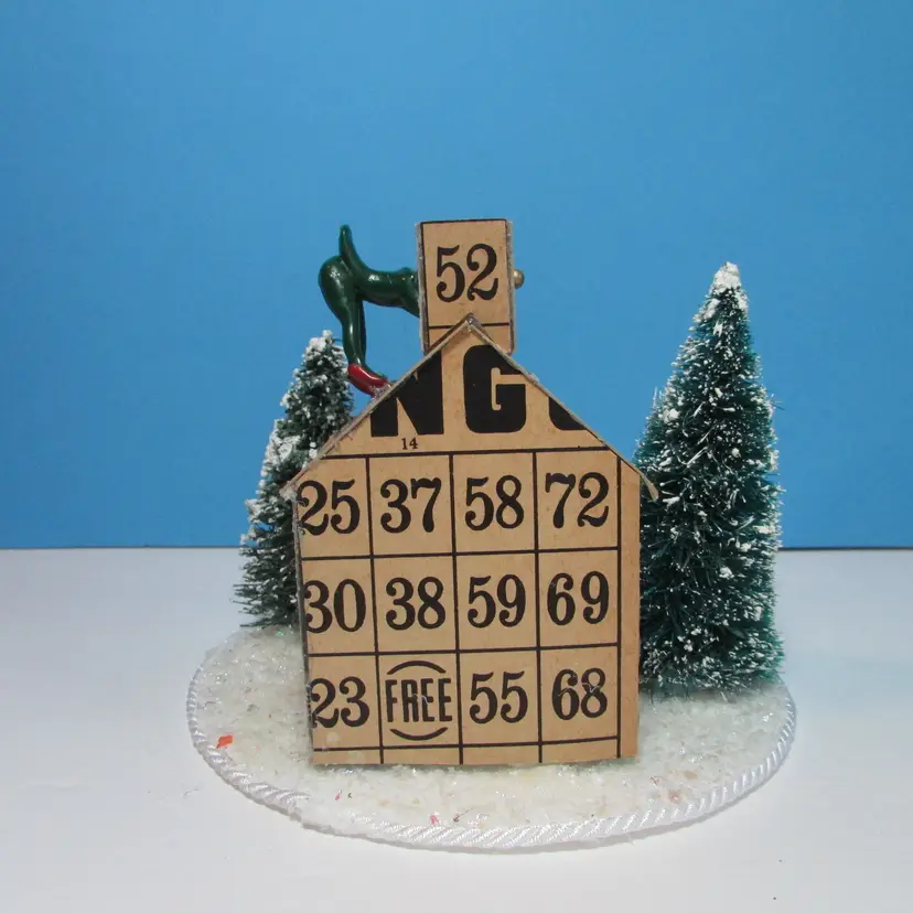This adorable house was made from bingo cards by mom, she added some tress and figures to make a cute winter scene. The base is a small round cake board. It is about 5" x 6 1/4" round. This is shipped from a smoke free home. Thanks for looking!