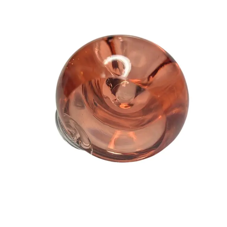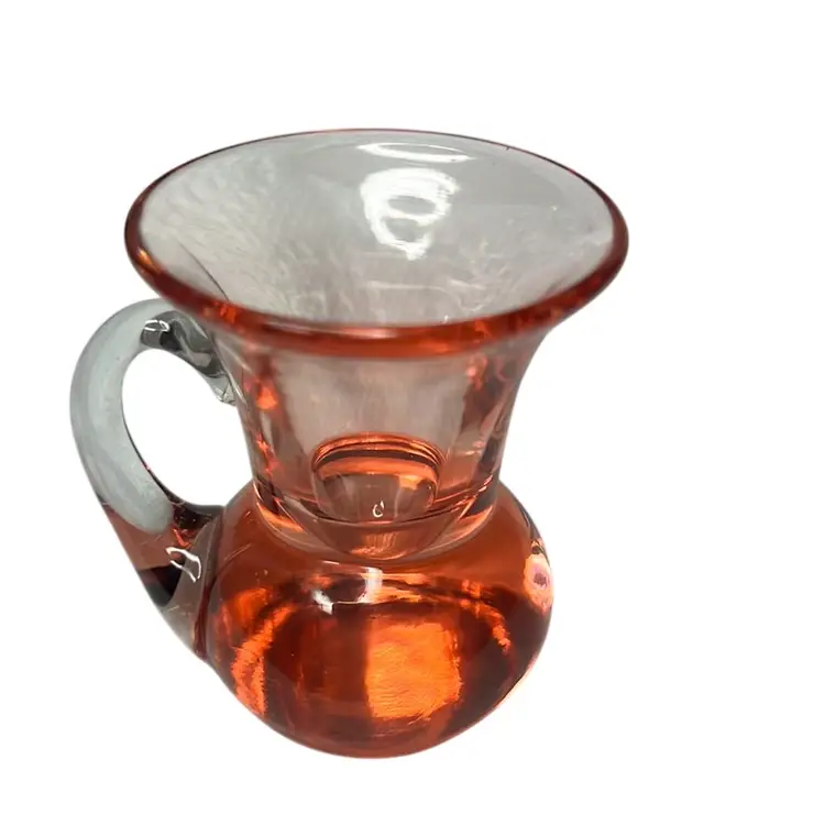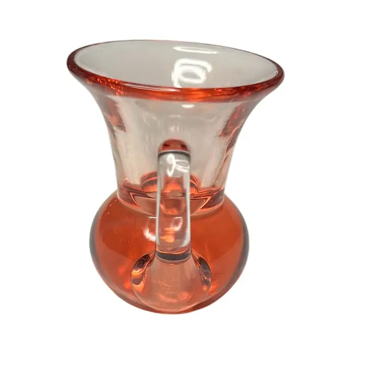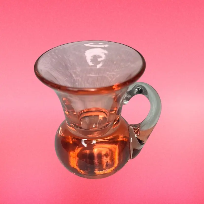Gradient color - deep pink base to a lighter pink rim. Smooth, clear bottom and clear applied handle. Excellent shape. Measures 2.5” tall & 2.5” wide.