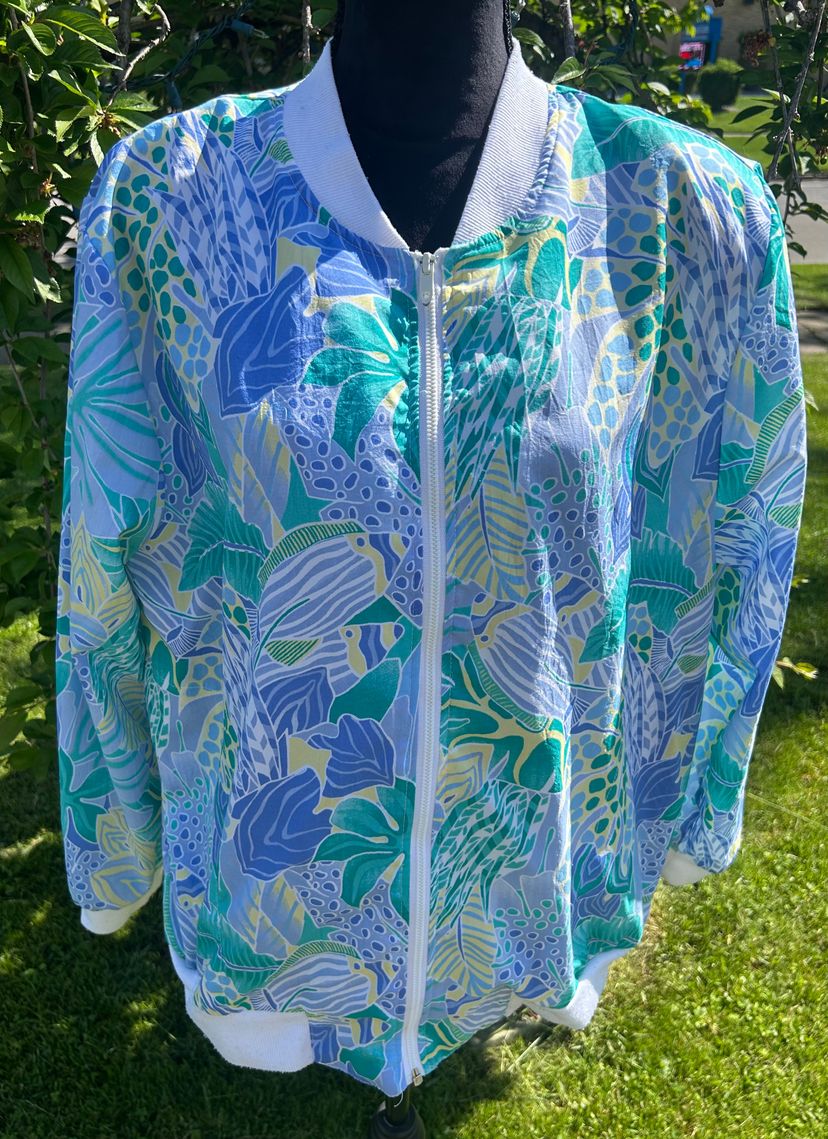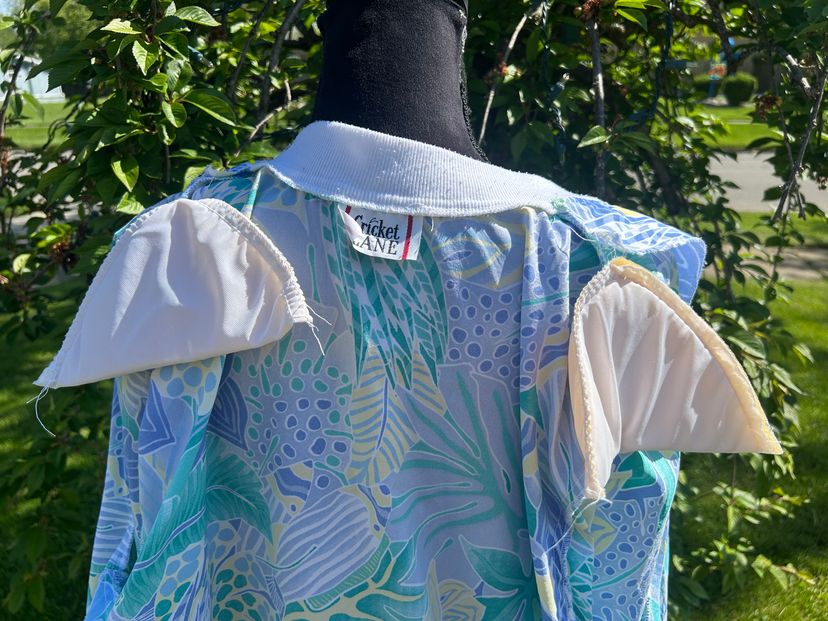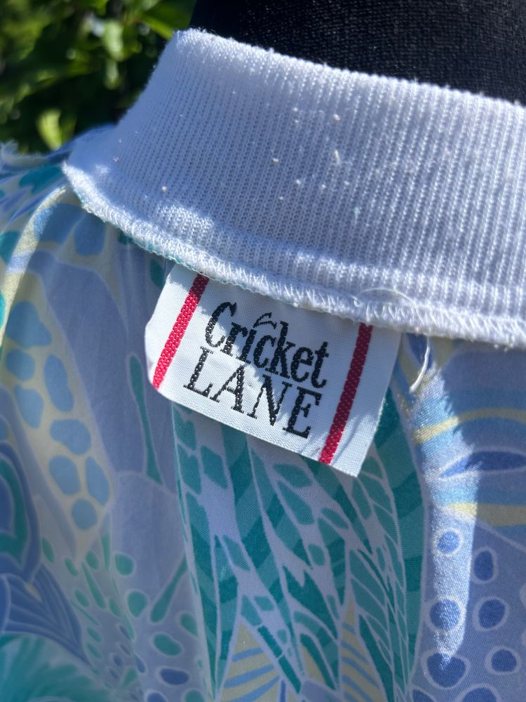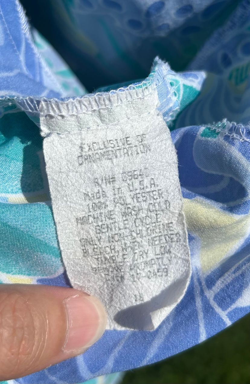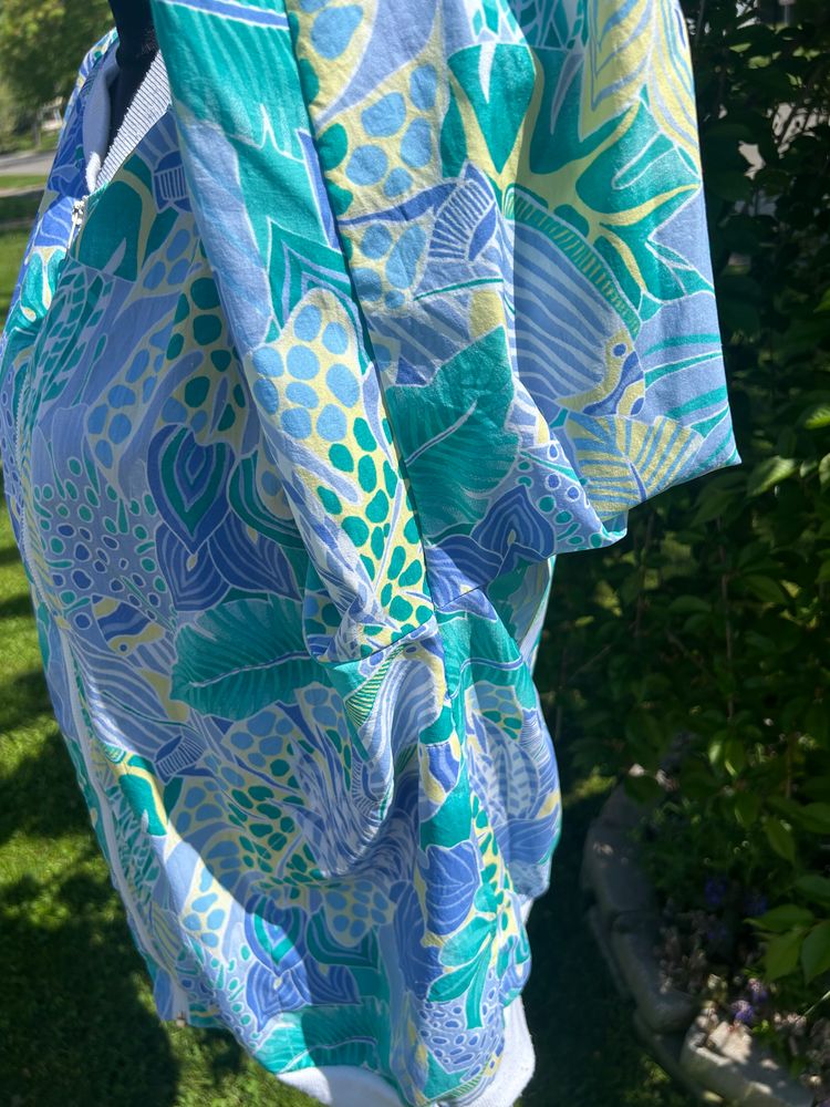 Brand/Maker- Cricket Lane Size- Marked 18 see measurements below for true size, aligns with a modern 2x/3x Color- Blue, Yellow, Green, White Condition description- No rips, stains or tears. Collar and bottom trim has common pilling. Zipper functional. One shoulder pad needs to be reattached on right side, see photos. Fabric- Polyester