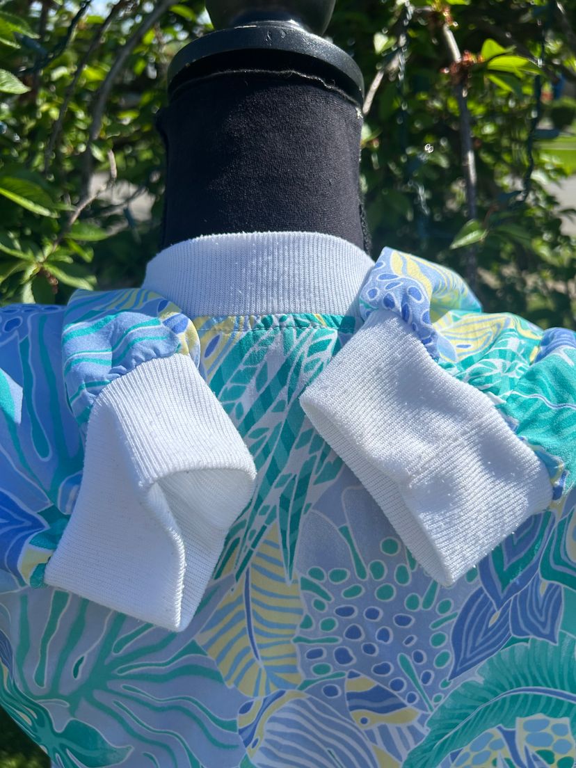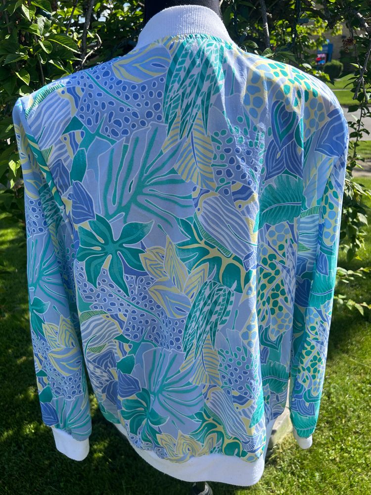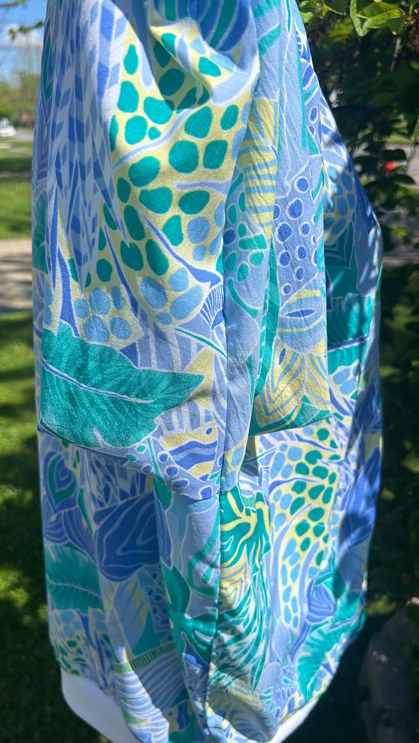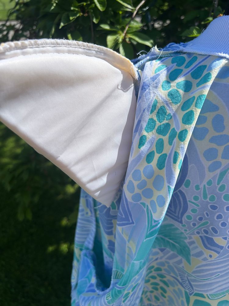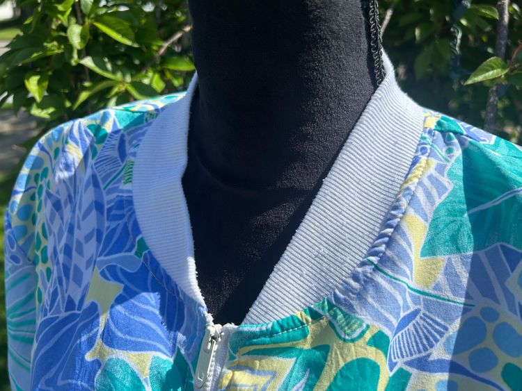 Brand/Maker- Cricket Lane Size- Marked 18 see measurements below for true size, aligns with a modern 2x/3x Color- Blue, Yellow, Green, White Condition description- No rips, stains or tears. Collar and bottom trim has common pilling. Zipper functional. One shoulder pad needs to be reattached on right side, see photos. Fabric- Polyester