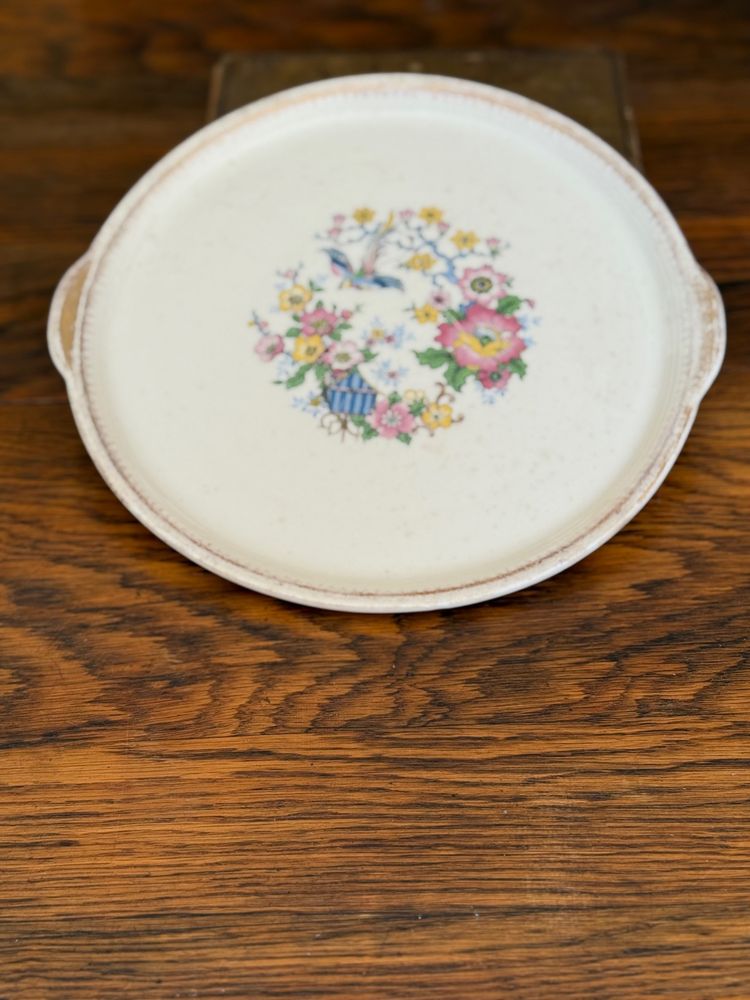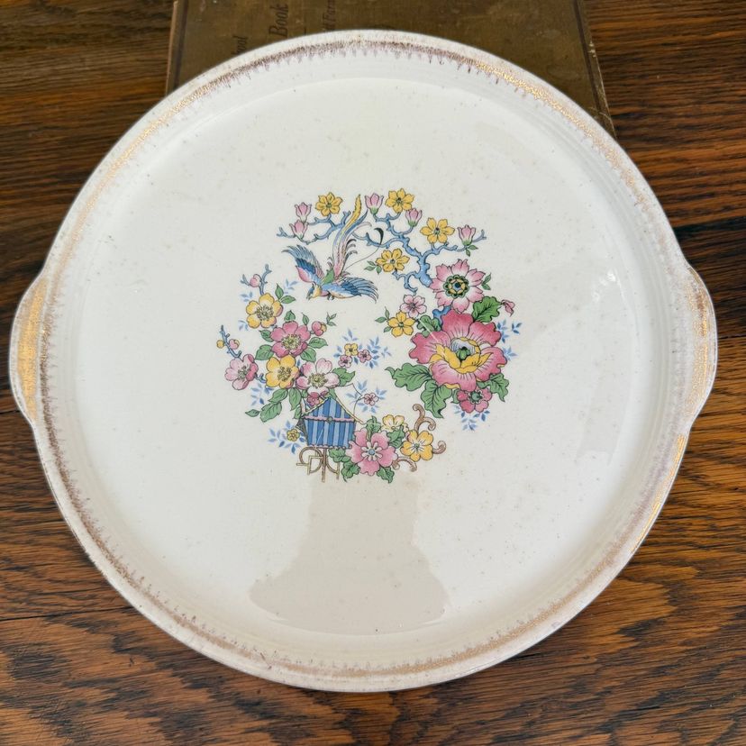 Bring soft garden color to your table with this vintage 1930s Cronin China handled serving plate. This charming piece features a Chinoiserie-inspired floral wreath with a flying bird, pagoda-style lantern, and delicate gold trim around the rim.