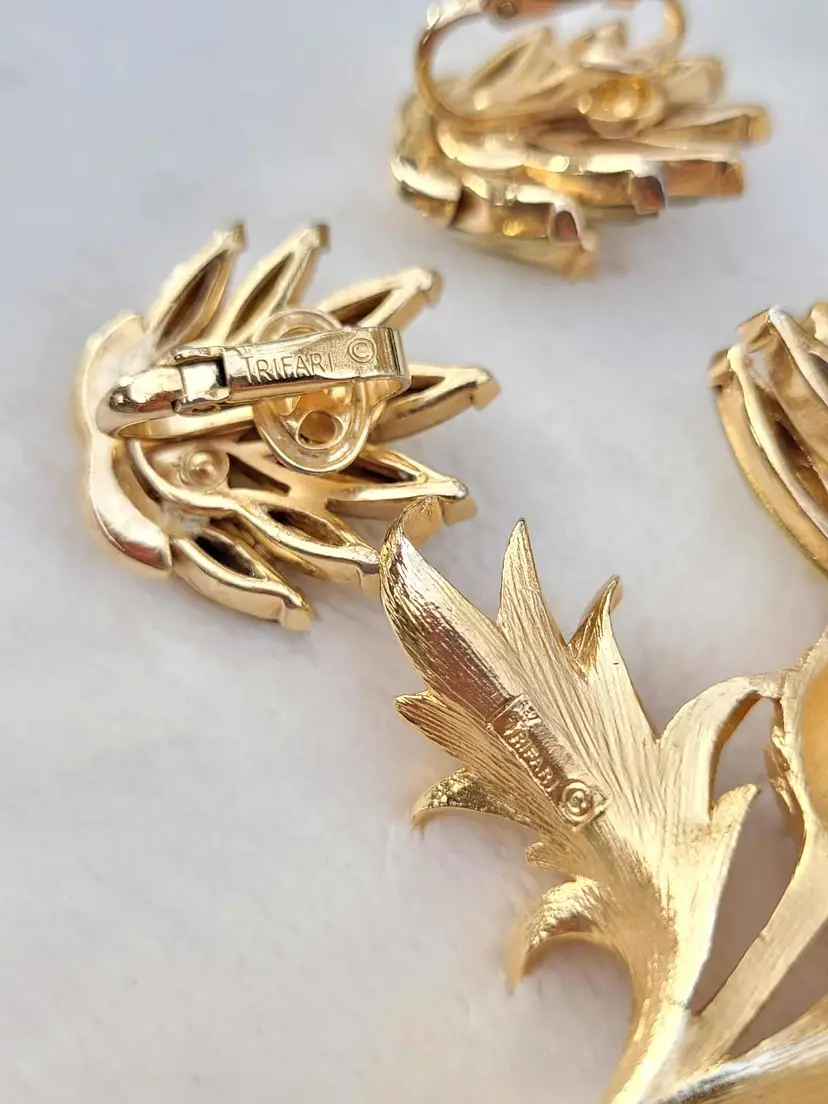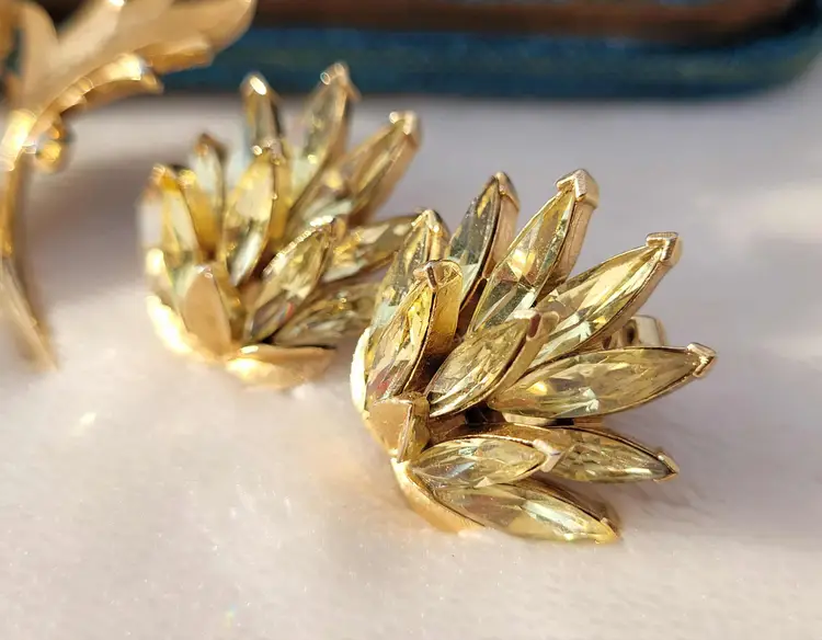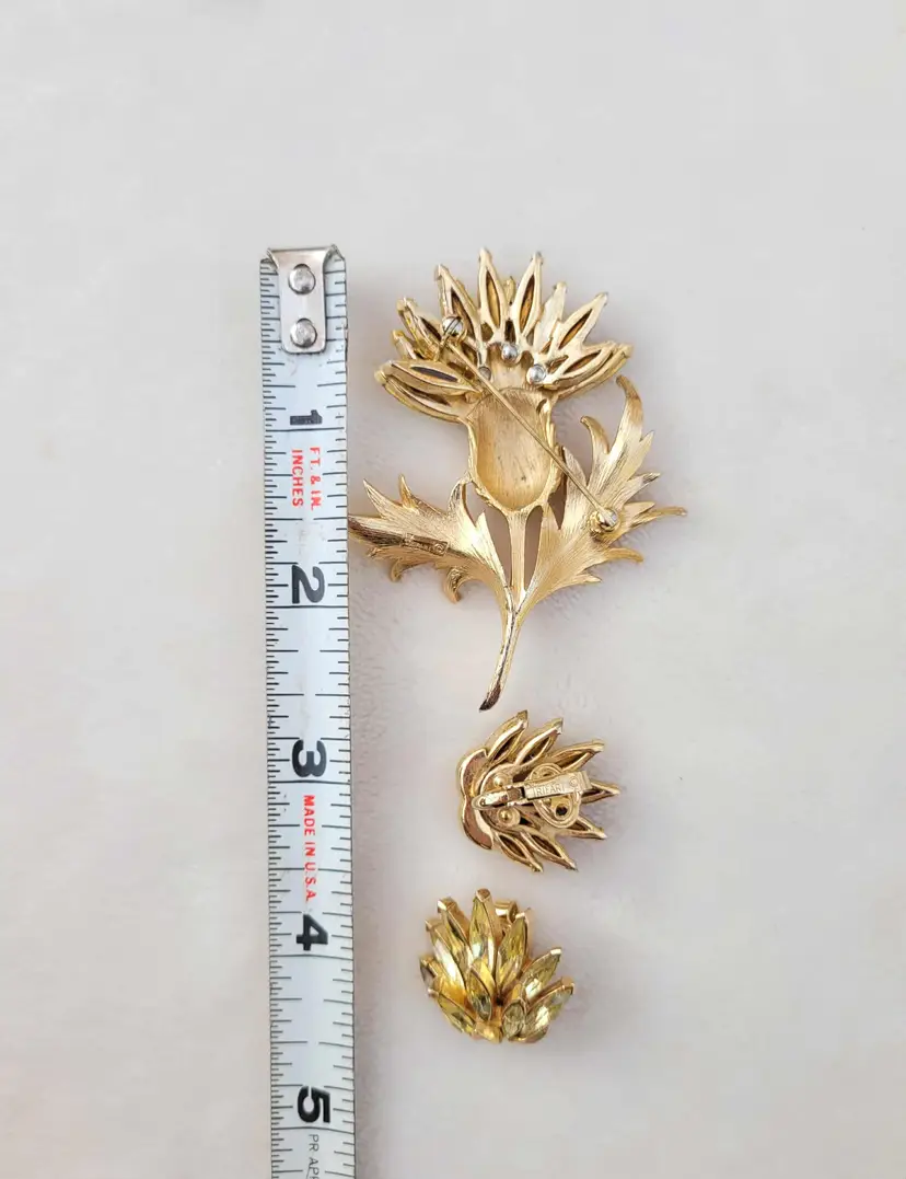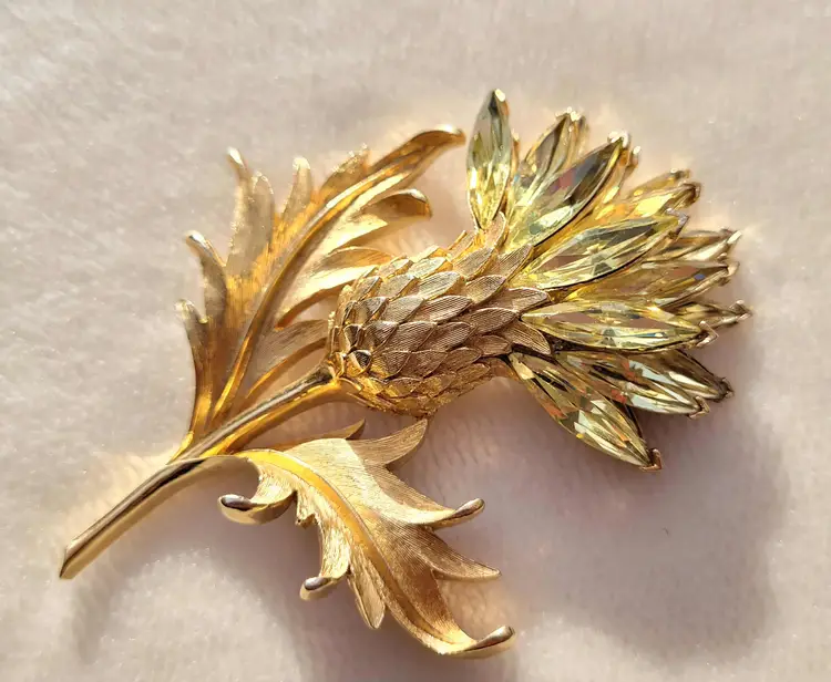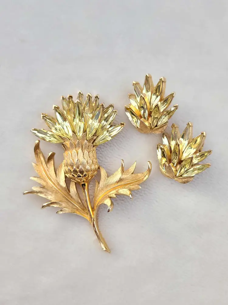 Gorgeous sparkling Trifari Scottish thistle brooch & clip on earring set, in a rather rare lemon yellow color. These are circa 1960s and in good condition from an estate. Please see pictures for details and measurements.