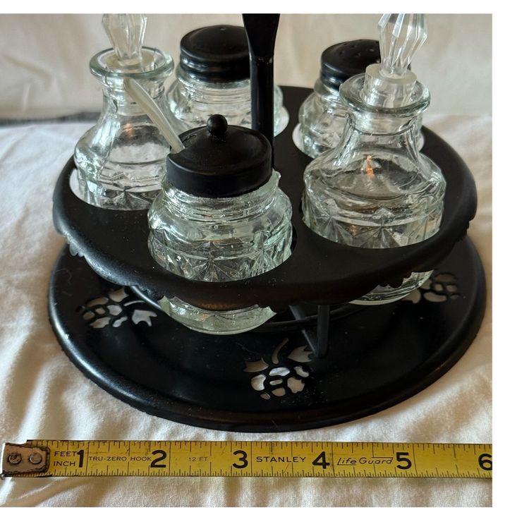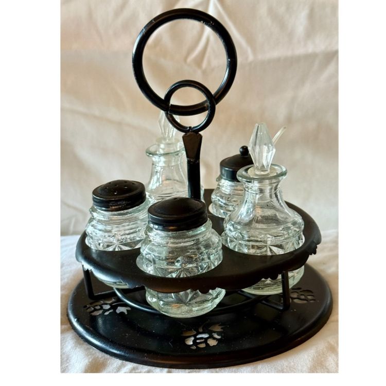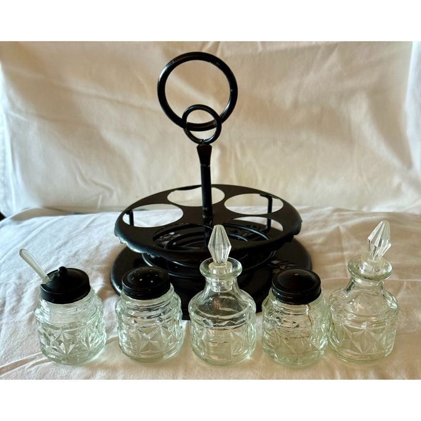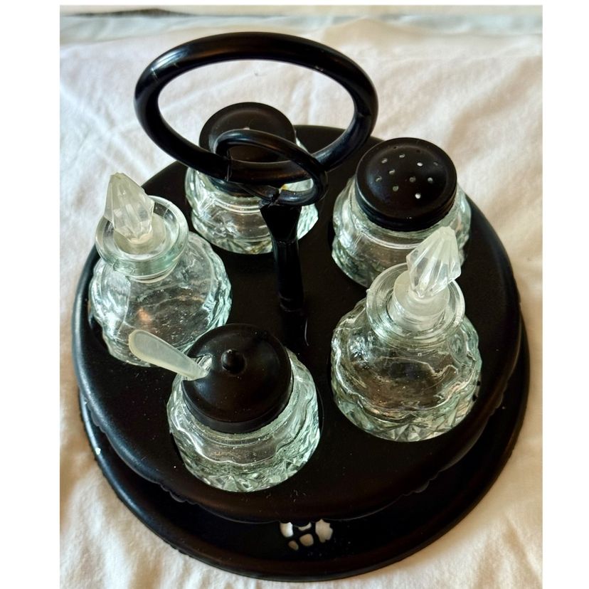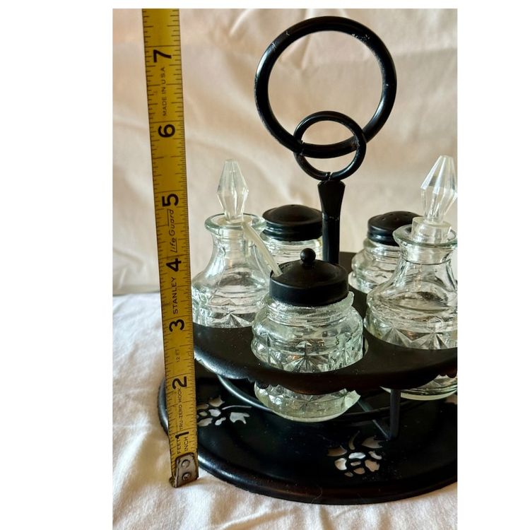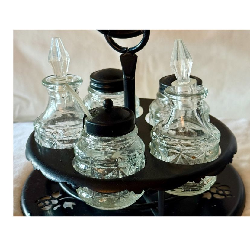 This is a 1950’s Victorian style cruet castor set, a type of condiment holder used on dining tables in the 19th century. The set includes a stand and several glass bottles for various condiments. The bottles typically held oil, vinegar, salt, pepper, and mustard. Cruet castor sets were a common piece of tableware in Victorian homes, from the most humble to the most elegant. This one was originally made of aluminum and painted black. The black lids are metal, the stoppers in the bottles are a hard plastic as is the tiny spoon. See pictures for details Glad to answer any questions
