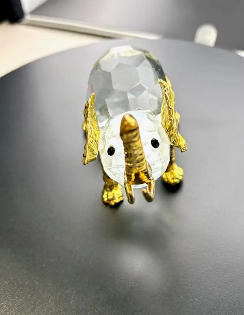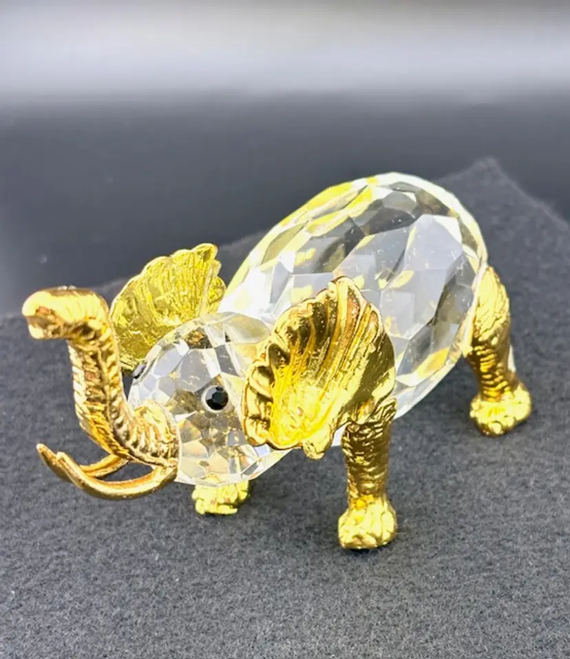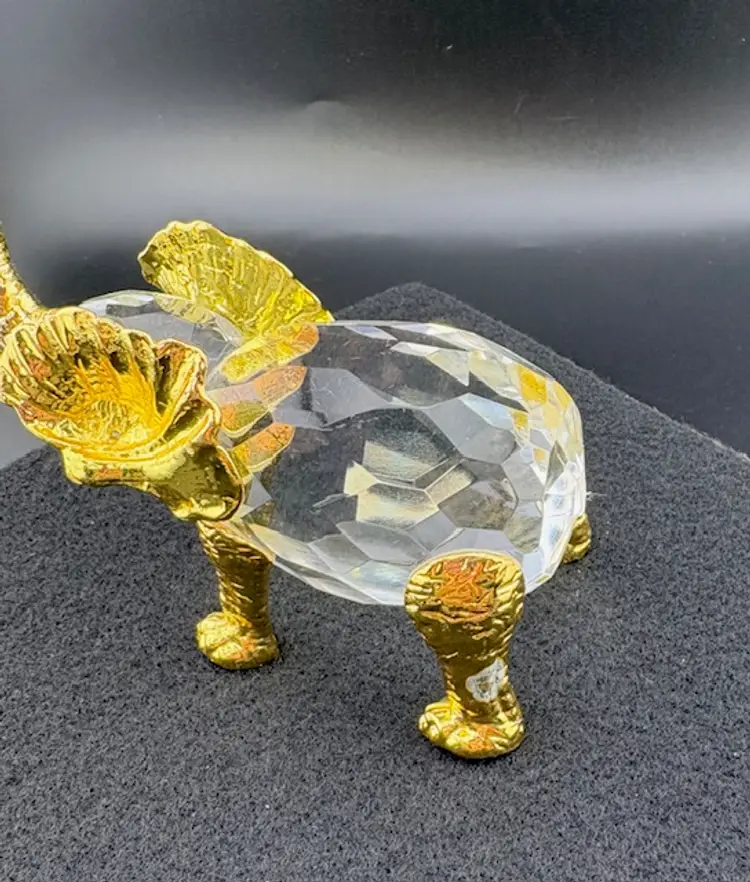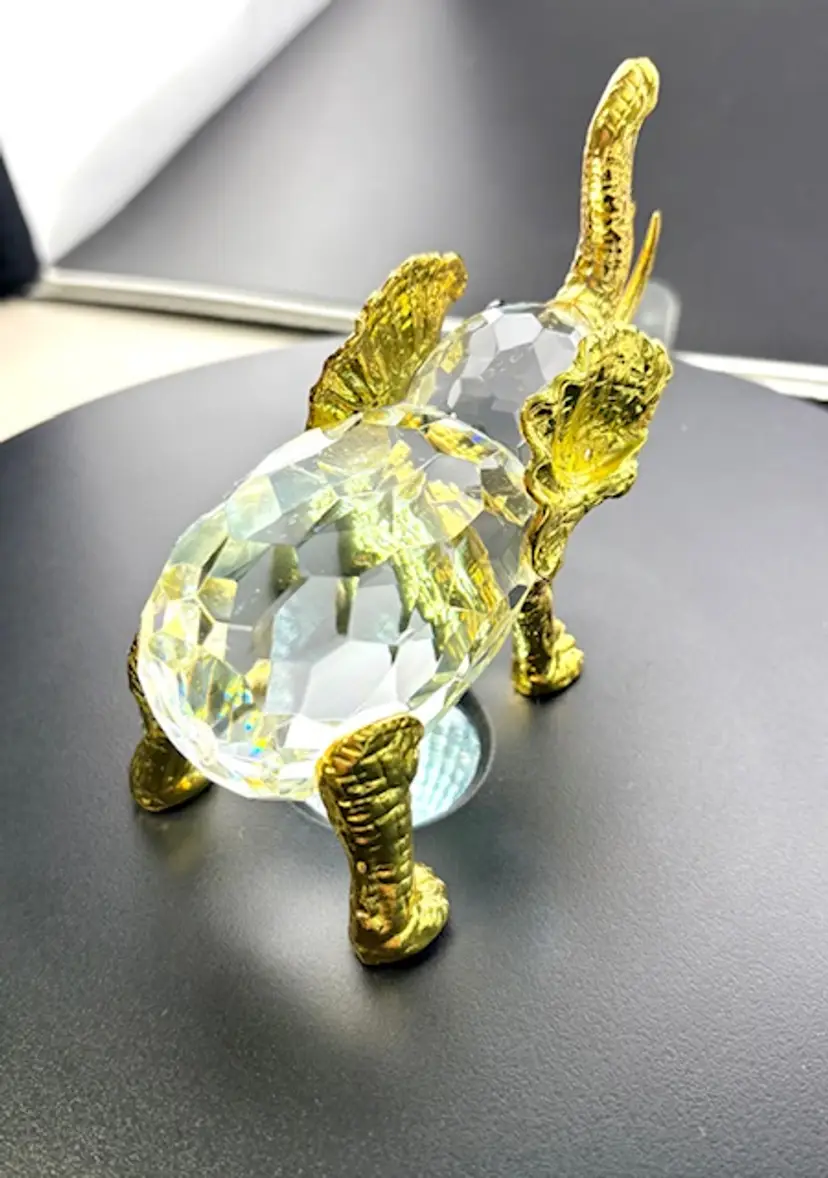 This is a unique crystal elephant with gold tone legs, ears, trunk and tusks. The tail of the elephant is missing and on the back right leg some of the gold color is missing. There are no chips or cracks.