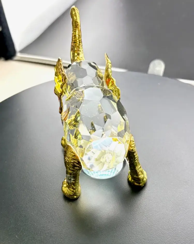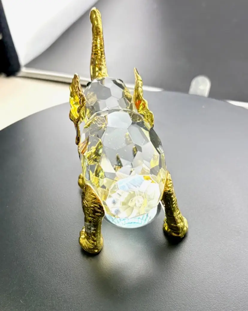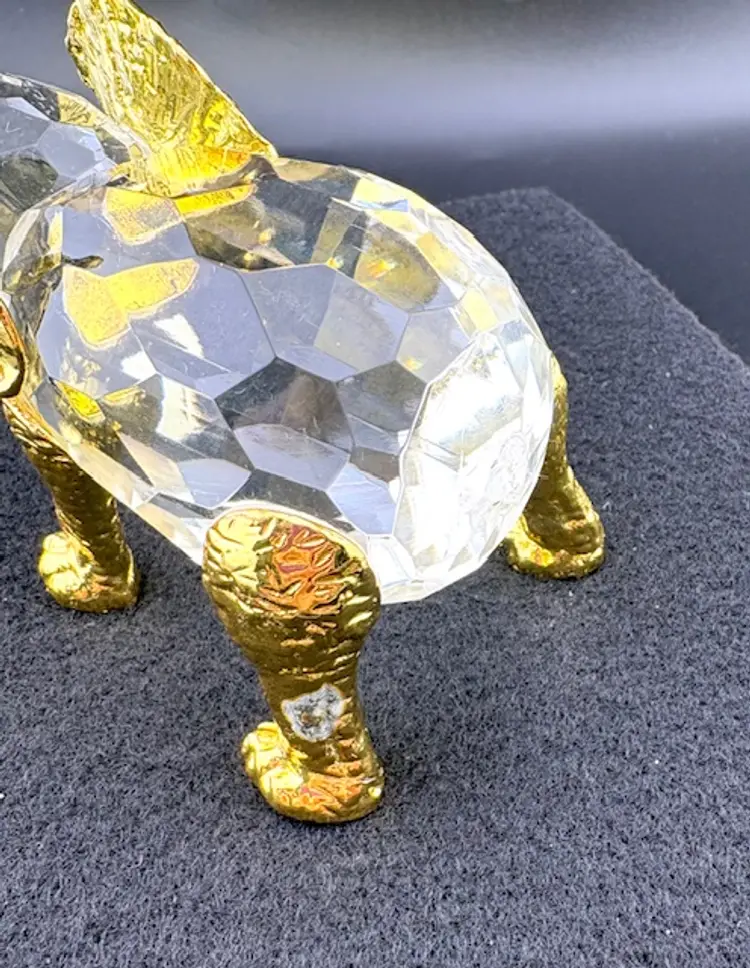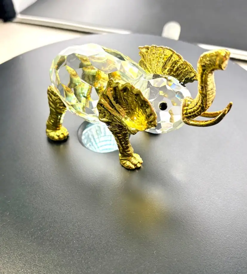 This is a unique crystal elephant with gold tone legs, ears, trunk and tusks. The tail of the elephant is missing and on the back right leg some of the gold color is missing. There are no chips or cracks.