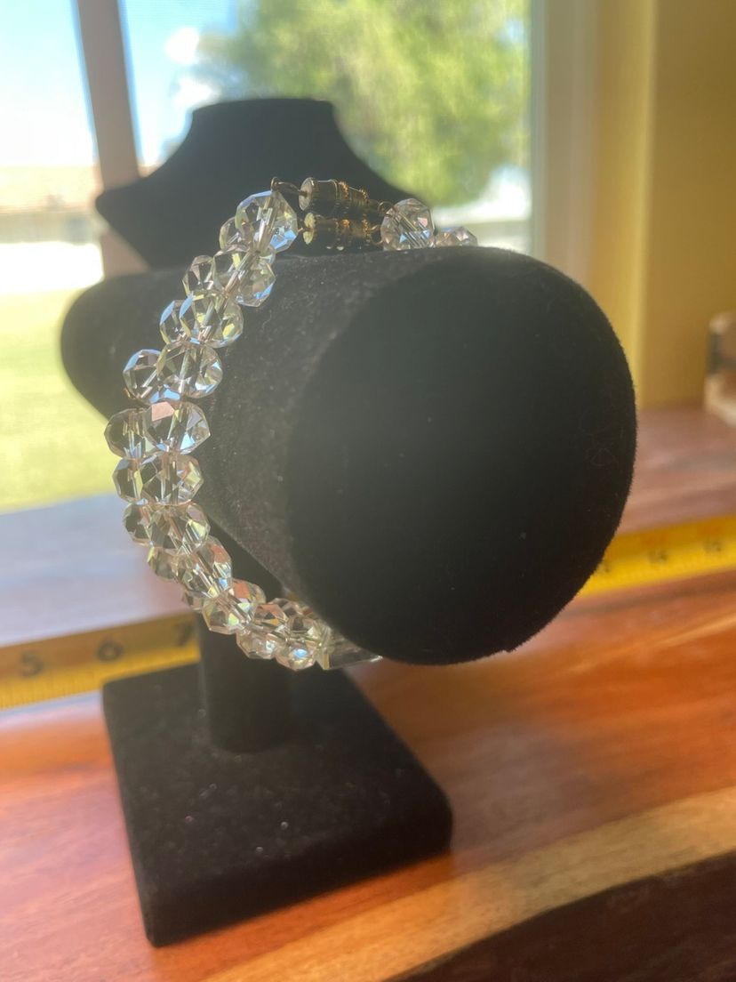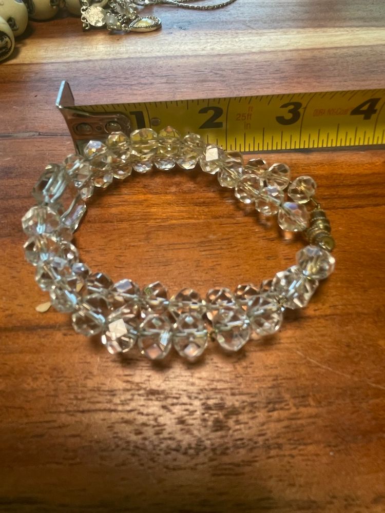This vintage crystal bracelet featuring two strands of clear, faceted crystal beads, possibly made from rock crystal quartz.