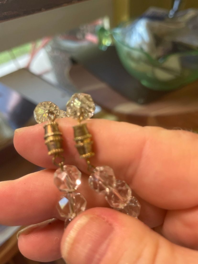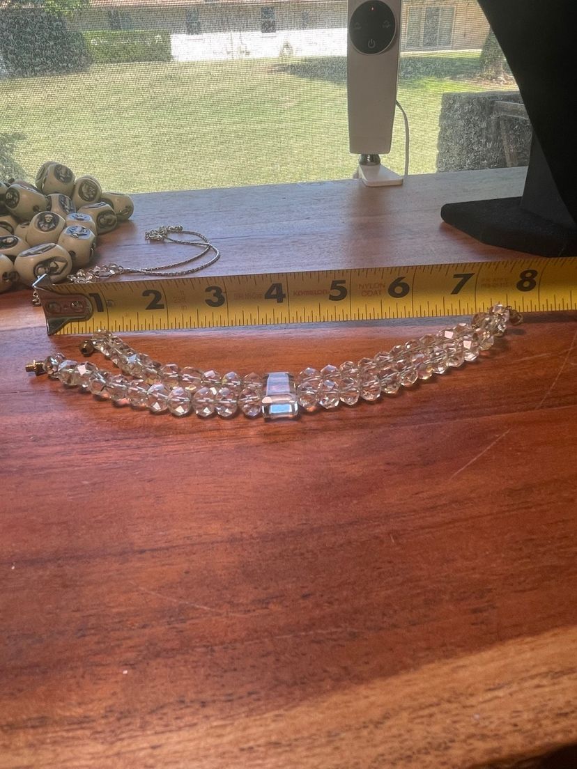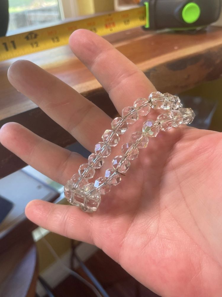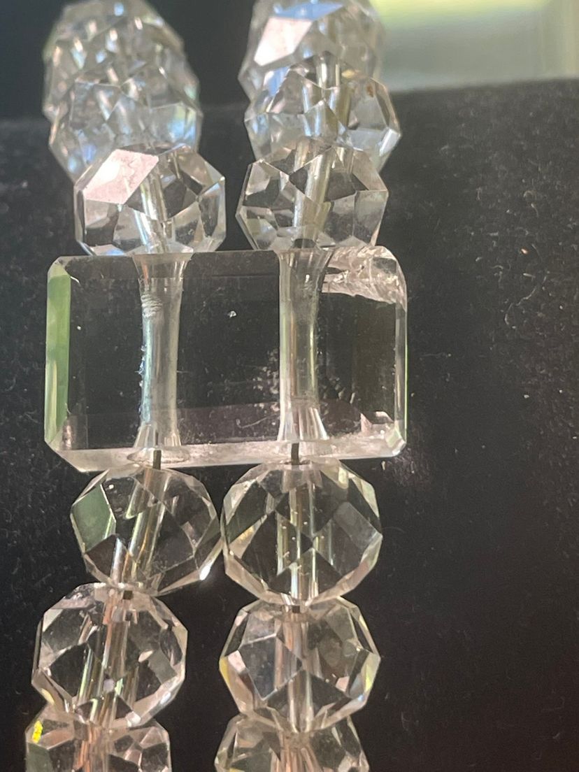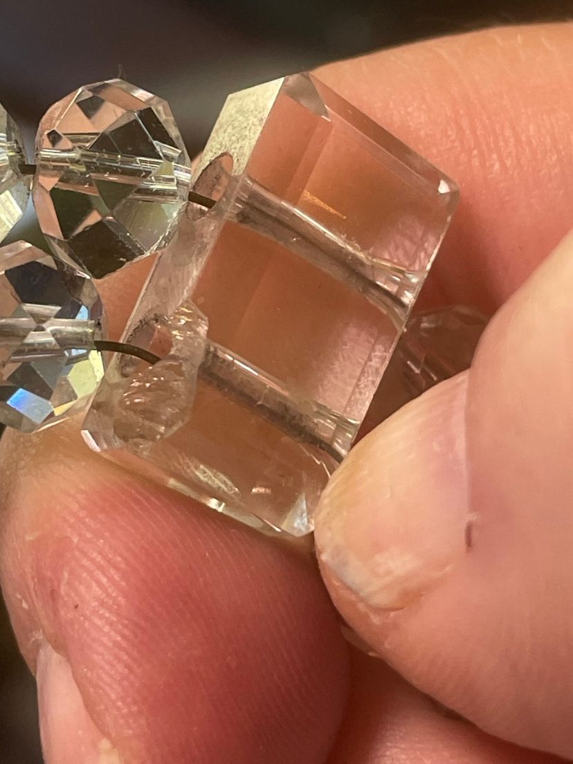 The beads are strung on wire and the wire needs to be manipulated to be straight again. The large square glass crystal has a small chip shown in pic