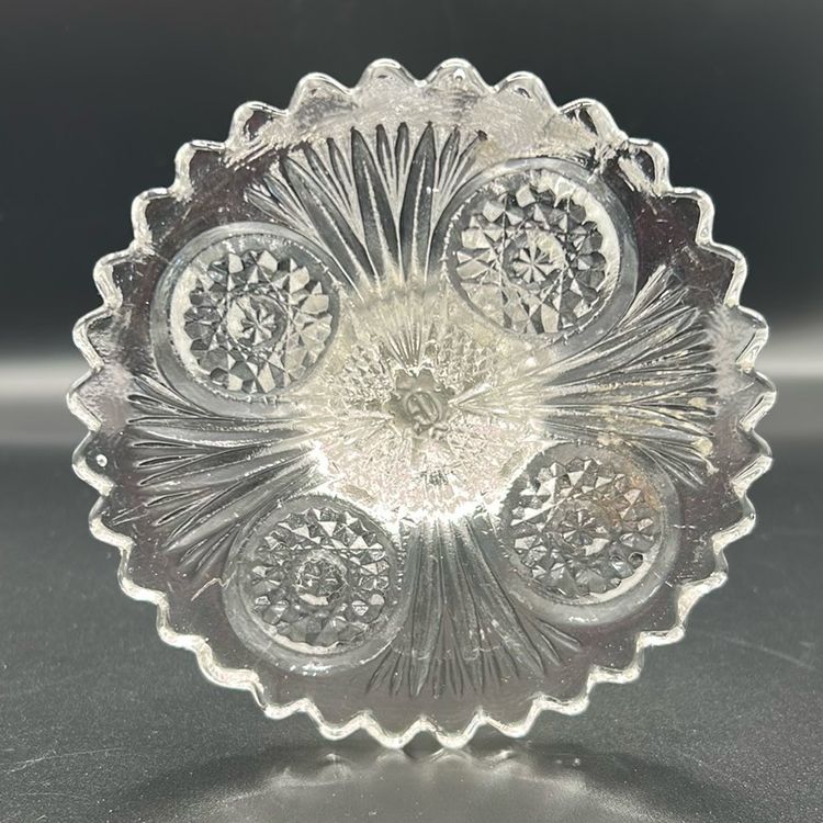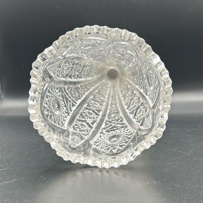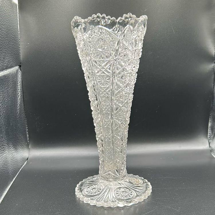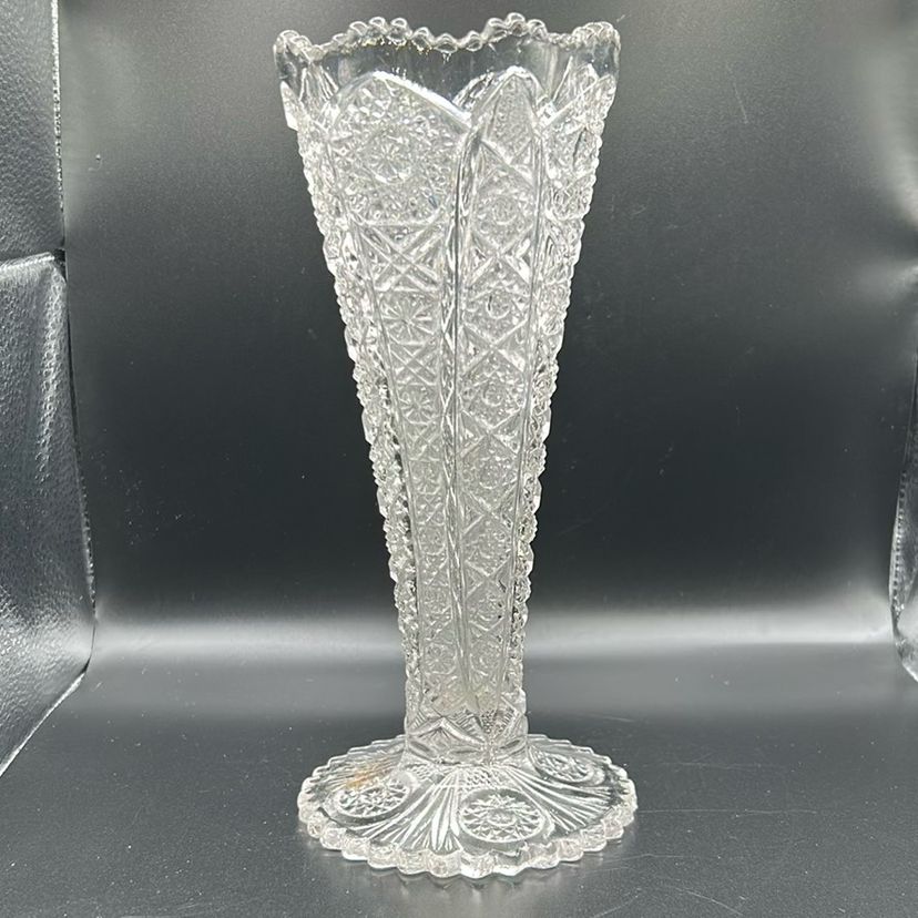 This piece is a vintage cut glass crystal vase the vase features a scallop trim and a starburst pattern on the base. It stands 8 inches tall and 3 inches wide. There are no chips or cracks.