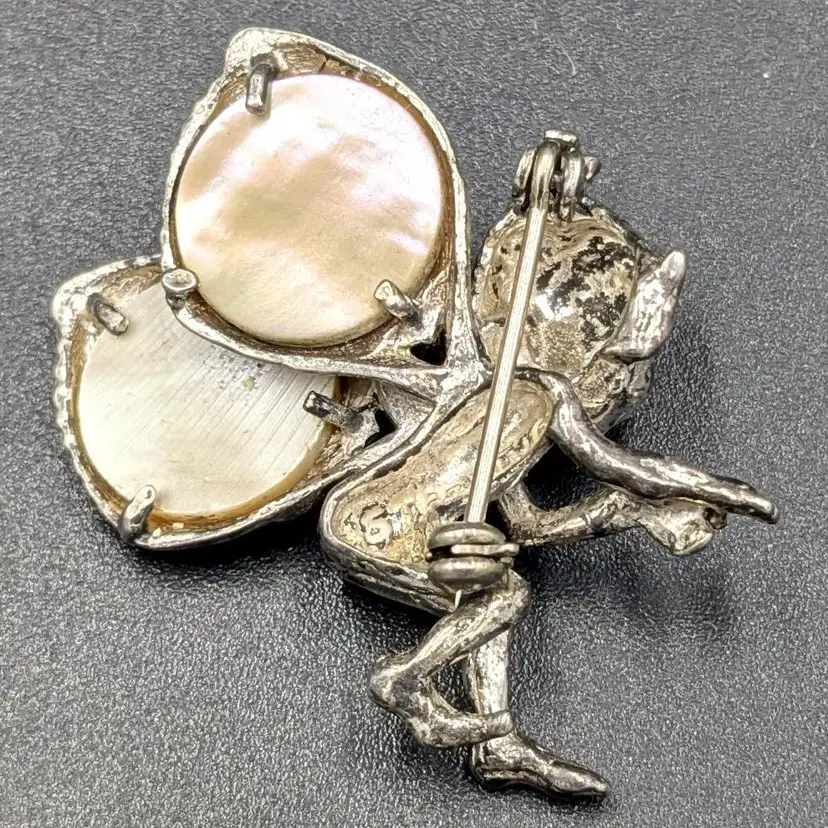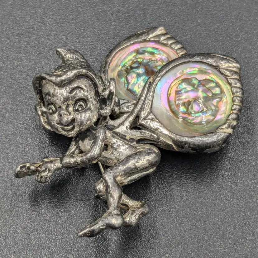 Adorable. Just look at that sweet face! Marked "Sterling" on the back. Has a "C" clasp closure. Great iridescence on the abalone wings. Shipped with USPS Ground Advantage Mail.