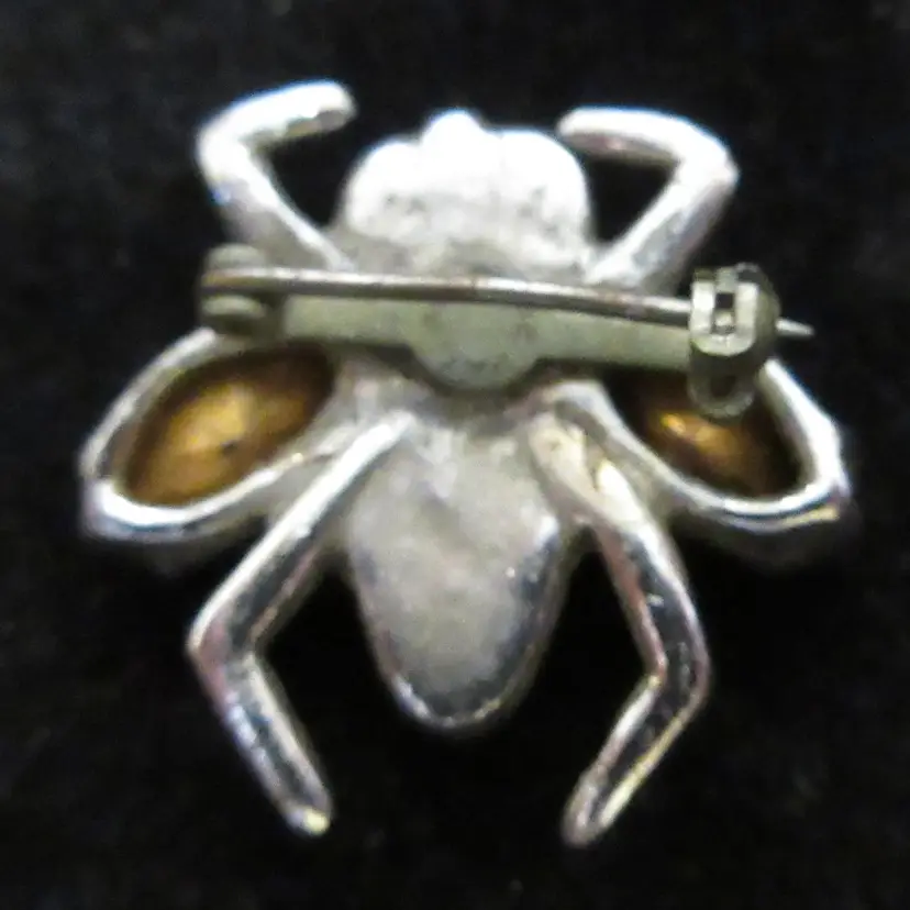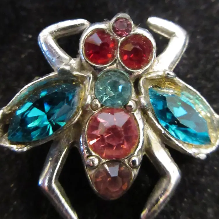 This is an adorable VINTAGE silver tone metal brooch shaped like a fly. The brooch has colorful prong-set rhinestones. The wings are aqua, thorax is pink and light blue, eyes are red and lower area is purple. It's an wonderful effect. This insect is about 1 inch by 1 inch. It has a pin back with a sliding C closure.
