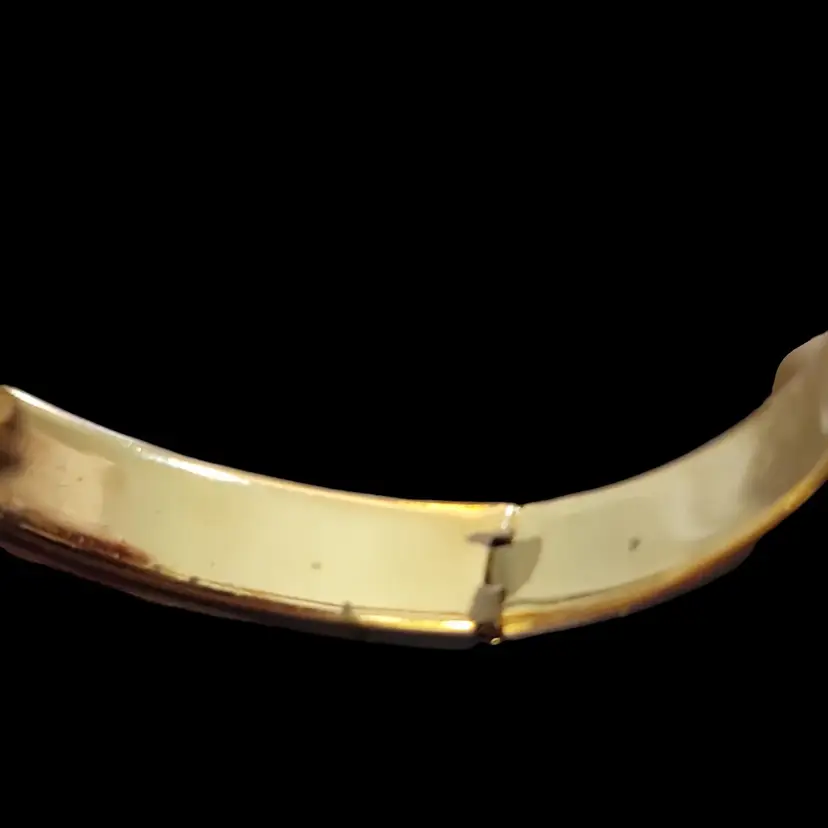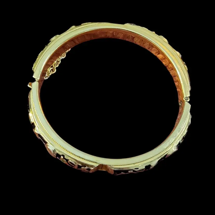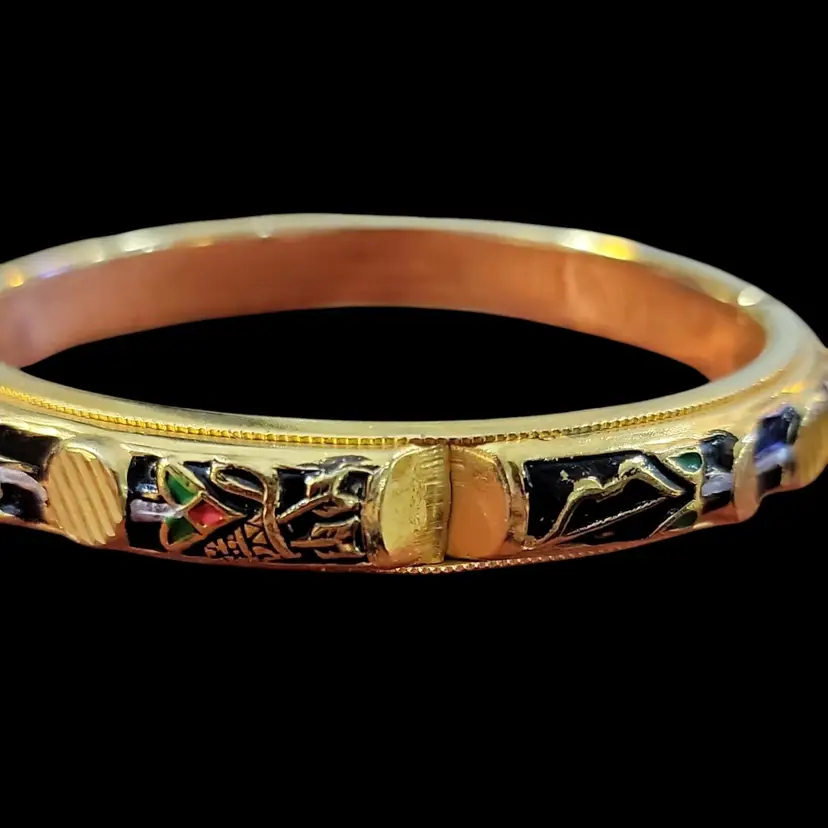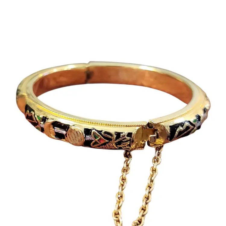 This vintage damascene gold tone bracelet is a nice piece that will add a touch of elegance to any outfit. The black and gold tone metal bracelet features intricate enamel accents tland designs including bows and odd shaped arrows that give it a unique and eye-catching look. The hinged bangle style bracelet is 6 1/2" long and has a round link chain safety latch. There is a little wear at the hinge. See photos. This bracelet is perfect for daily wear, business settings, dress up occasions, or casual outings. The bracelet is stackable and engraved with beautiful details. The vintage style and bohemian theme make it a great addition to any jewelry collection.