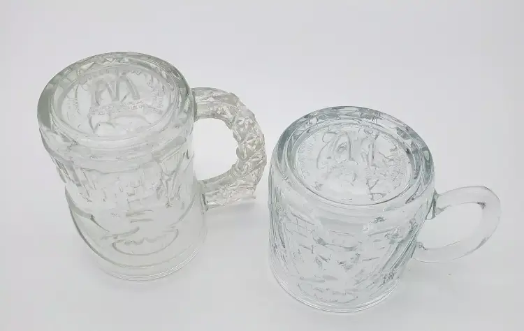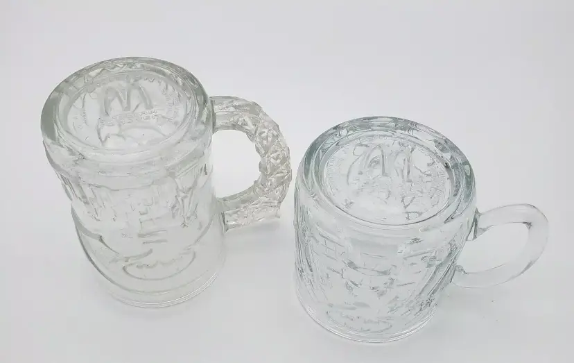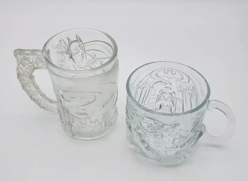 -Brand: DC Comics/McDonalds -Item: Pair Batman Forever Mugs -Measurements: Batman Appx 4" x 4 1/4" W Including Handle Riddler 3 1/4" T x 4 1/2" -Condition: Excellent Condition-No Chips Or Cracks One Stem-It's Like a Raised Bump See First Photo -Accents/Features: Embossed Characters on The Mugs -Year: Vintage -Material: Glass -Color: Clear