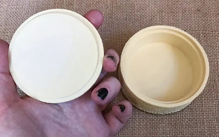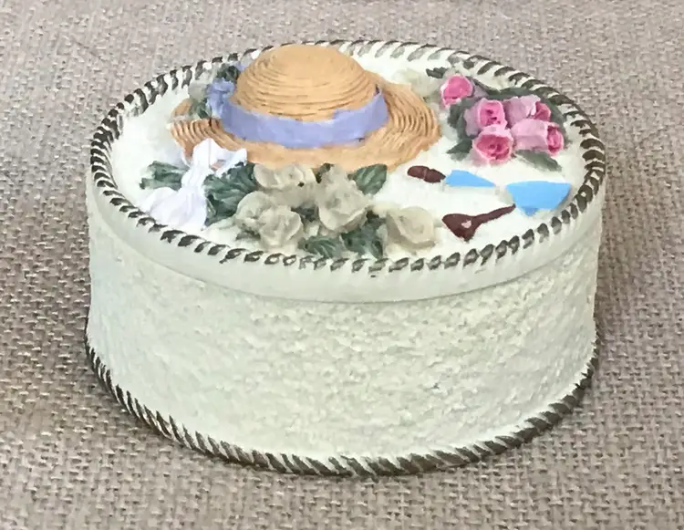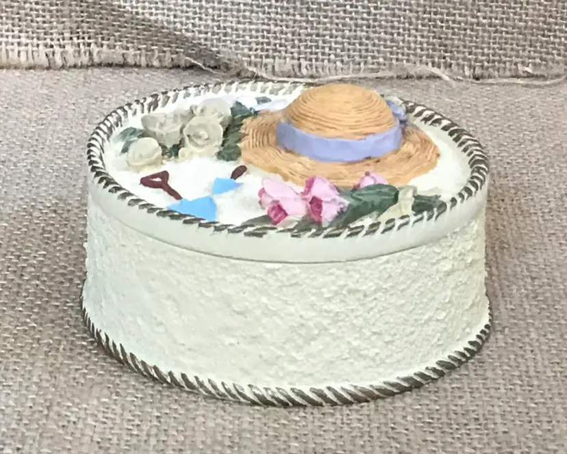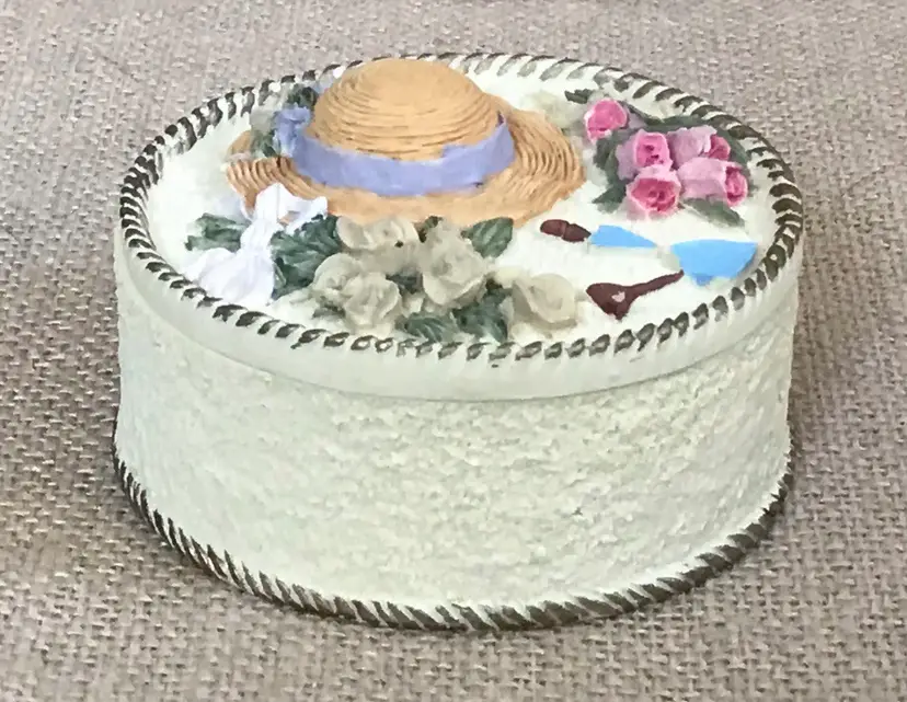 The box has a sort of popcorn ceiling texture and the base color looks to me like a pale yellow.