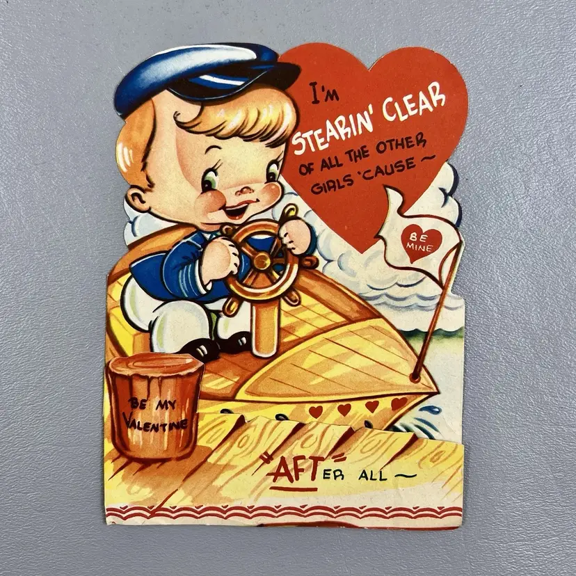 Vintage Die Cut Valentine Card Sailor Boy Boat I'm Stearin' Clear 6" Heart
