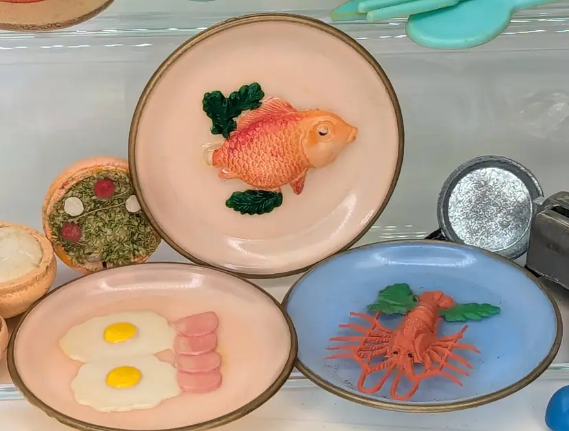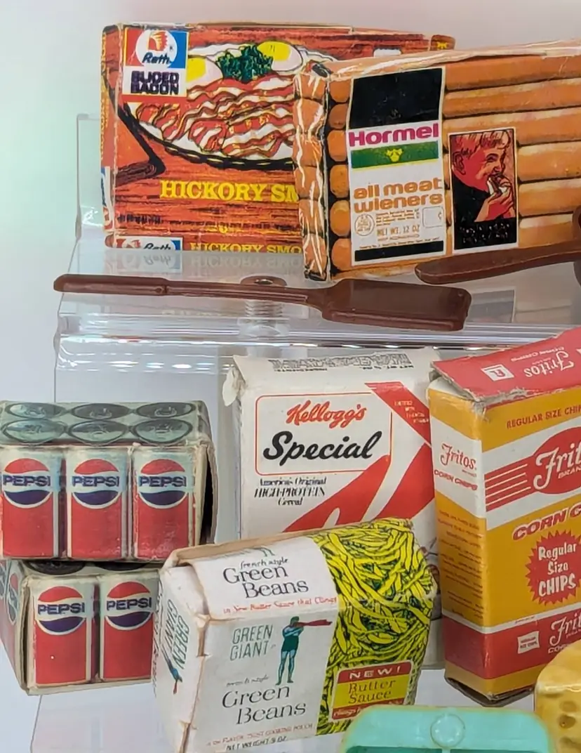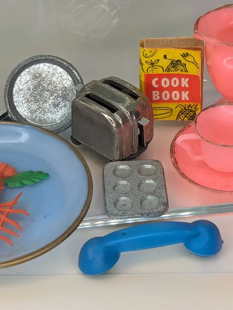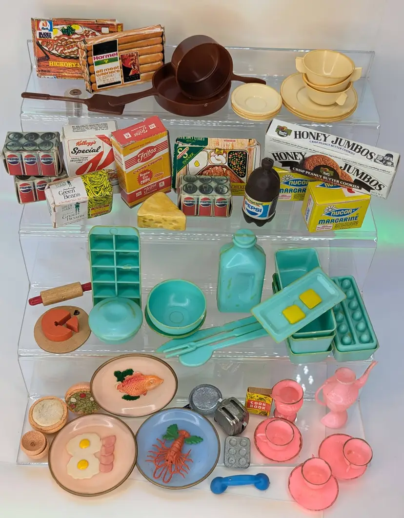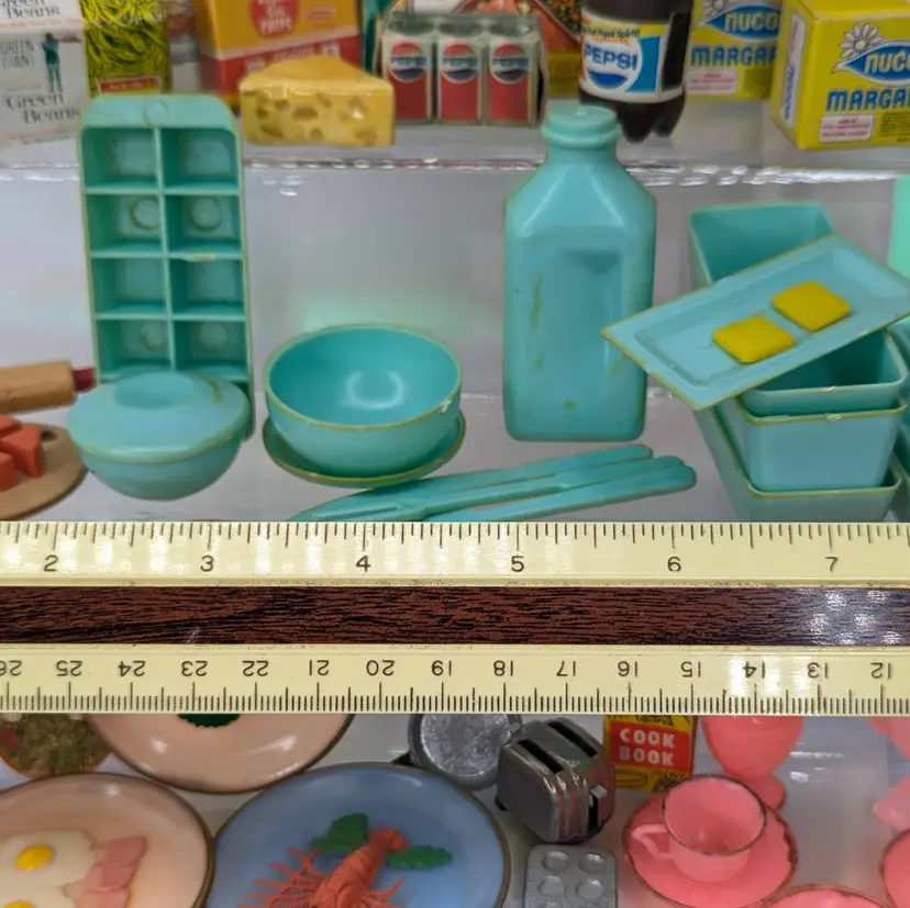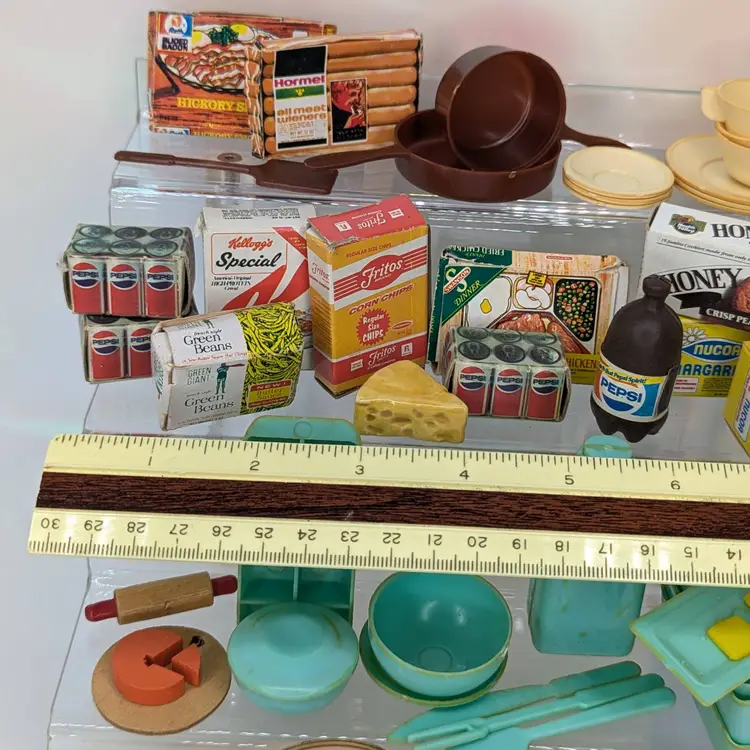 Vintage lot of mixed size Dollhouse Miniatures Food & Kitchen Accessories ranging from Pots & Pans, Tea set, Plates, plates of food, food boxes, bowls, trays, ice cubes, toaster. Items seem to be from the 1960-1980s. These pieces range in sizes that can be used in small dollhouses, to barbie size, to 18" dolls. Some are made from plastic, wood and metal. Food boxes all see to be cardboard. 61 pieces in total! Three larger plates have some cute pre-made food on them like lobster, fish and eggs The pink plastic tea set is marked Hong Kong. The tea pot has a broken base on that set as well. The teal blue set has no markings, and is made on the larger size. It has yellowing from age. Boxes of food, some have issues where they have been crushed, so they may need to be fixed or taped to look better. Pepsi bottle also included. I believe the food boxes are from the miss merry line in the 1970s There is a metal toasted, frying pan and muffin tin, these are the smallest out of the bunch along with the wooded bowls, rolling pin, cake and salad bowl. The cheese is ceramic The top set of frying pans and 3 plates with 3 cups and 3 saucers. Over all this is a grate lot of items! Great for an dollhouse house or miniature collector.