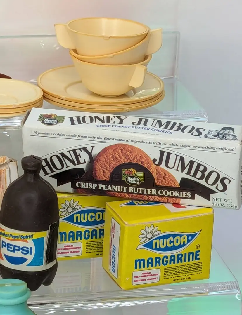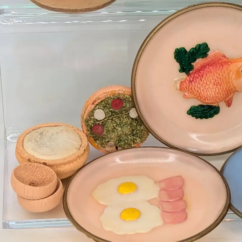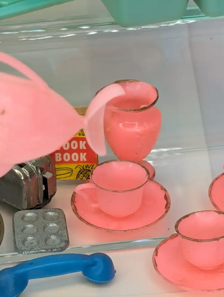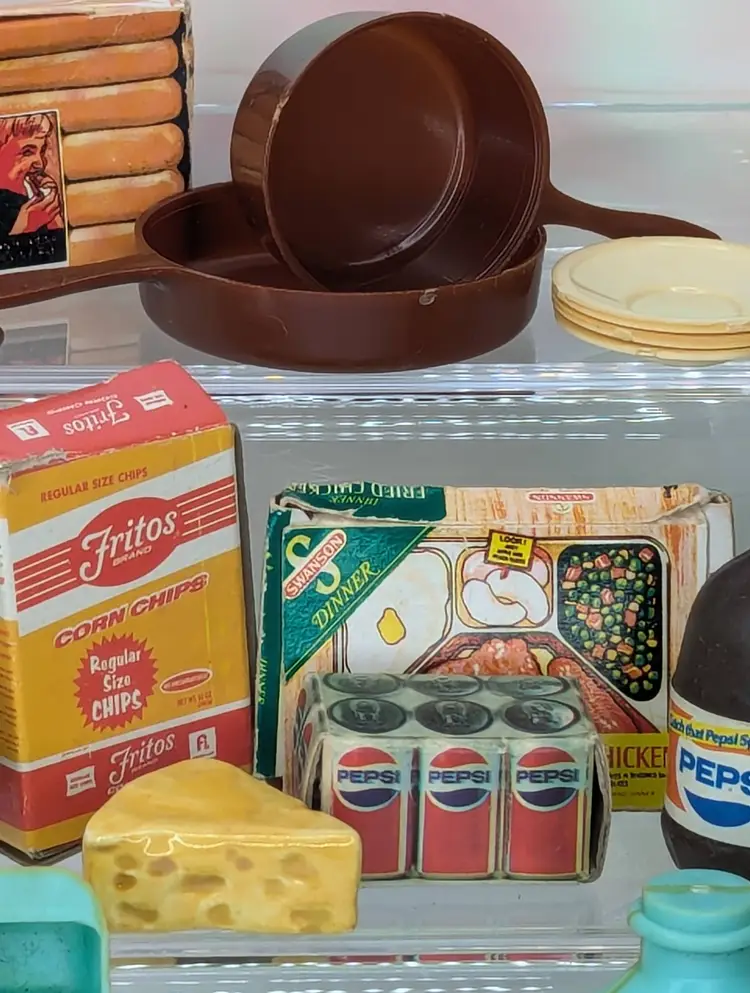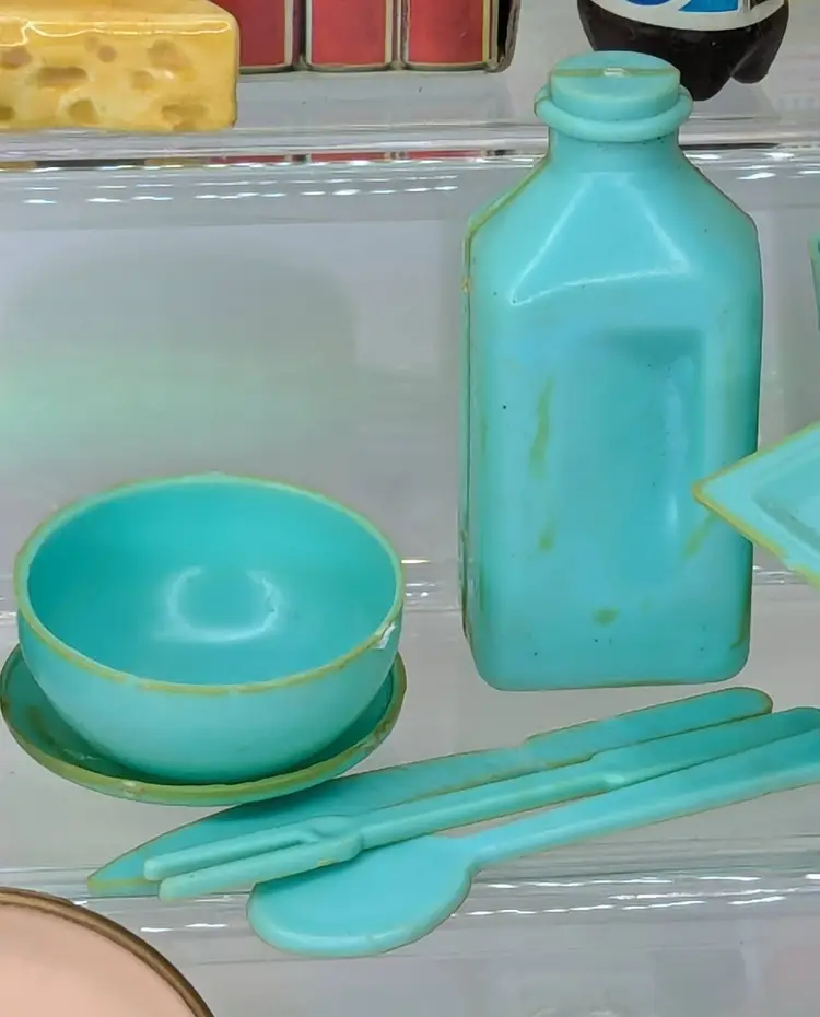 Vintage lot of mixed size Dollhouse Miniatures Food & Kitchen Accessories ranging from Pots & Pans, Tea set, Plates, plates of food, food boxes, bowls, trays, ice cubes, toaster. Items seem to be from the 1960-1980s. These pieces range in sizes that can be used in small dollhouses, to barbie size, to 18" dolls. Some are made from plastic, wood and metal. Food boxes all see to be cardboard. 61 pieces in total! Three larger plates have some cute pre-made food on them like lobster, fish and eggs The pink plastic tea set is marked Hong Kong. The tea pot has a broken base on that set as well. The teal blue set has no markings, and is made on the larger size. It has yellowing from age. Boxes of food, some have issues where they have been crushed, so they may need to be fixed or taped to look better. Pepsi bottle also included. I believe the food boxes are from the miss merry line in the 1970s There is a metal toasted, frying pan and muffin tin, these are the smallest out of the bunch along with the wooded bowls, rolling pin, cake and salad bowl. The cheese is ceramic The top set of frying pans and 3 plates with 3 cups and 3 saucers. Over all this is a grate lot of items! Great for an dollhouse house or miniature collector.