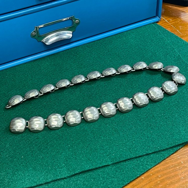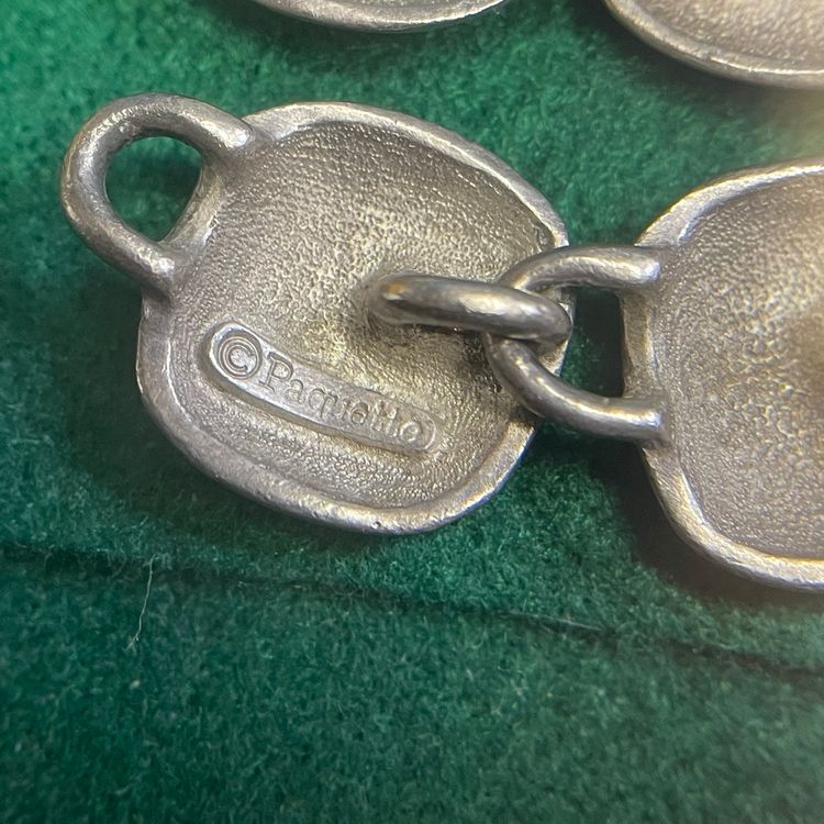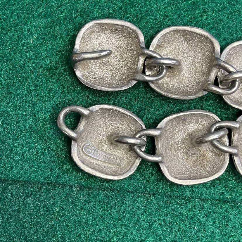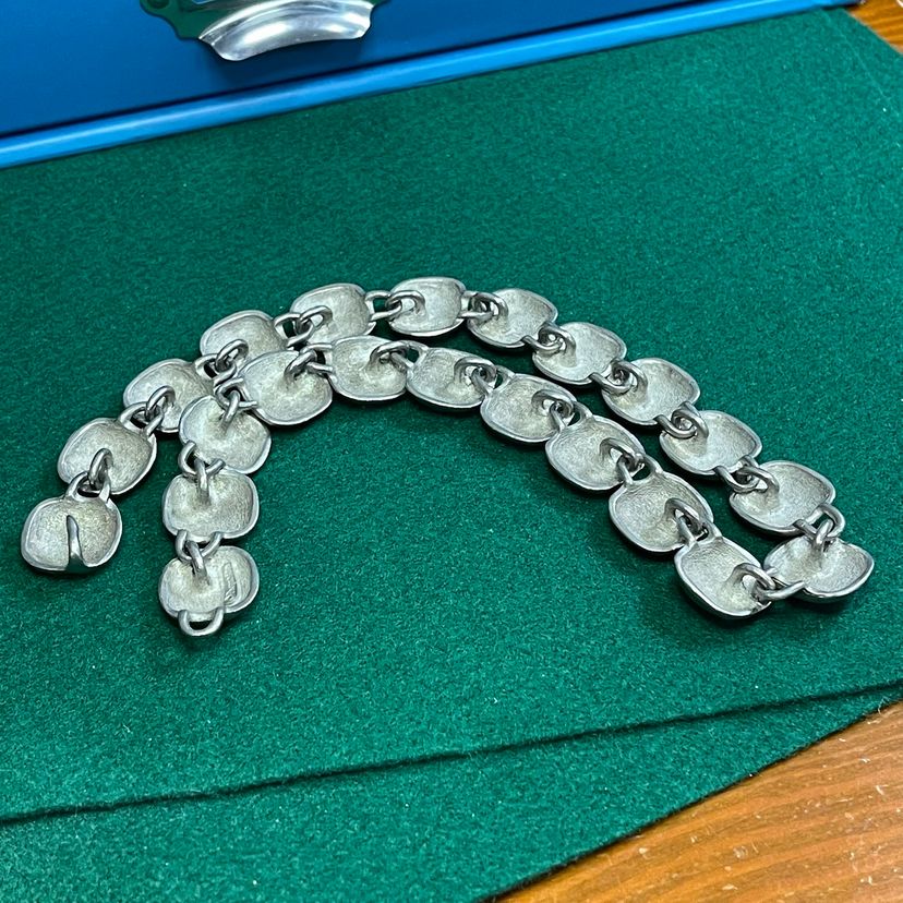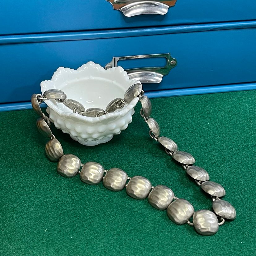 This necklace was created by the Douglas Paquette Accessories company that operated from 1976 to 2024 and famously worked with Longaberger in the late 1990s. This brutalist style necklace seems to be one of the earlier work based on the mark. It is approximately 18 inches long and in good condition.