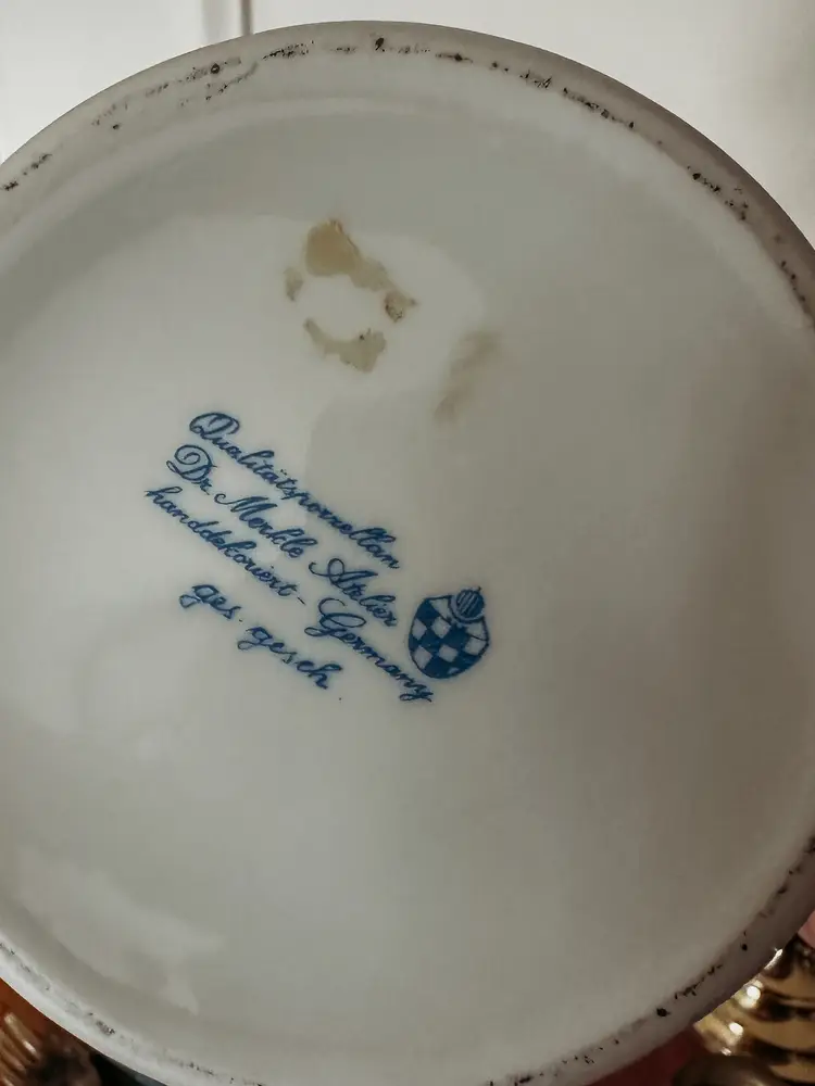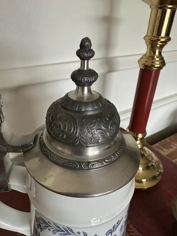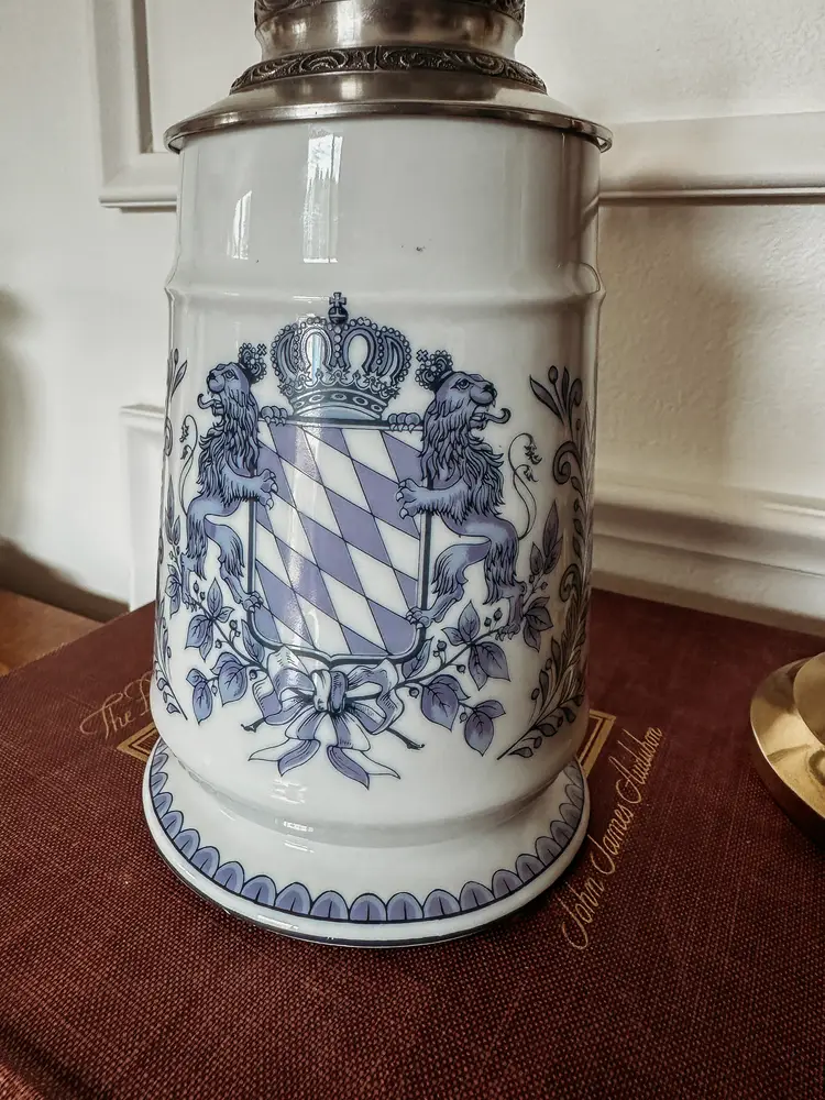 This beautiful stein is decorated with a blue and white design featuring a crown and foliage. It is a very heavy ironstone porcelain and is ornately decorated as pictured with two shades of blue on white. It has a pewter like top with a thumb lift A wonderful gift for a German Beer lover or collector!