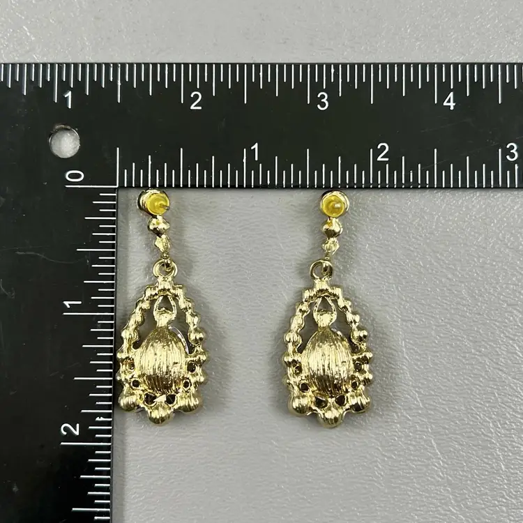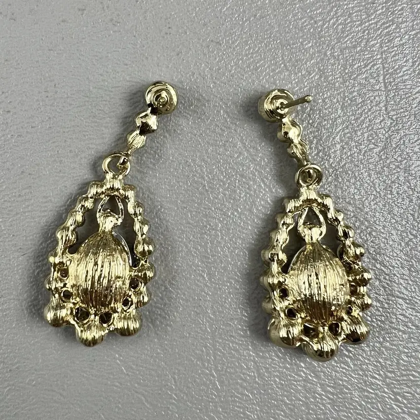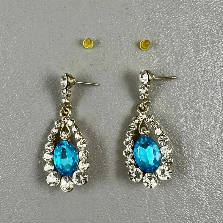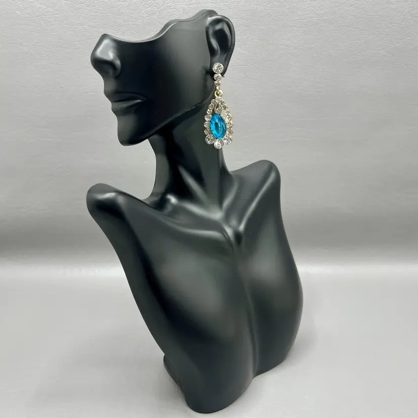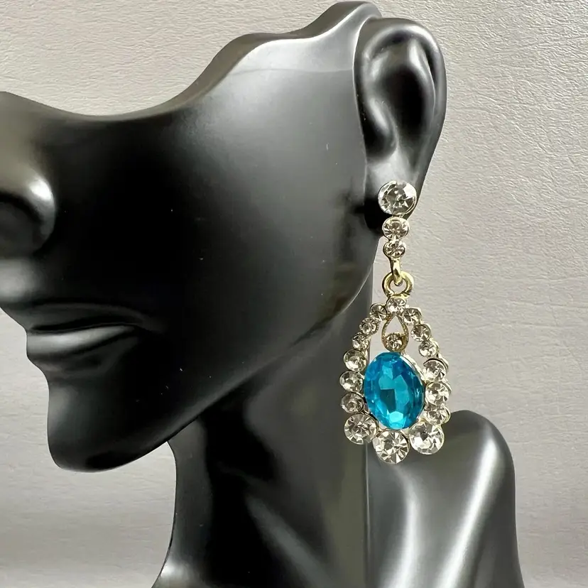 Vintage Drop Dangle Statement Earrings Blue Teardrop Rhinestone Gold Tone Clear Rhinestones 1.75 " Pierced