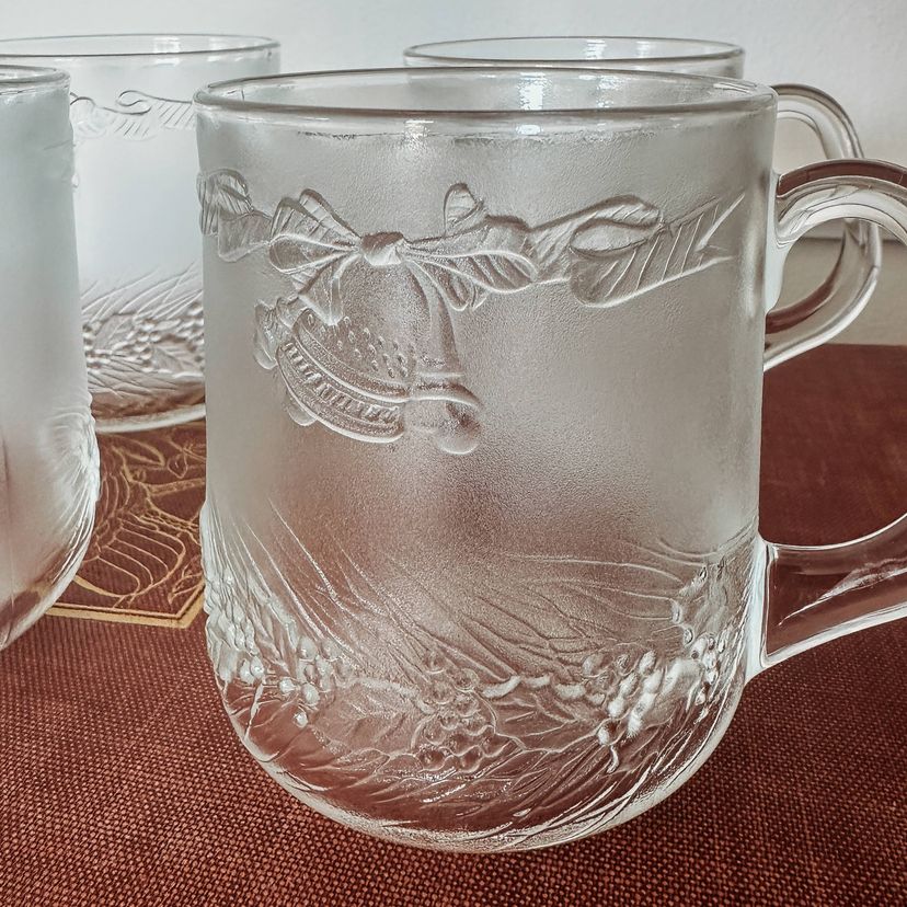 Beautiful vintage Duralex Christmas mugs featuring bells, ornaments, and garland. Set of 4. Perfect for eggnog, hot cocoa, holiday punch, or hot cider! No chips or cracks!